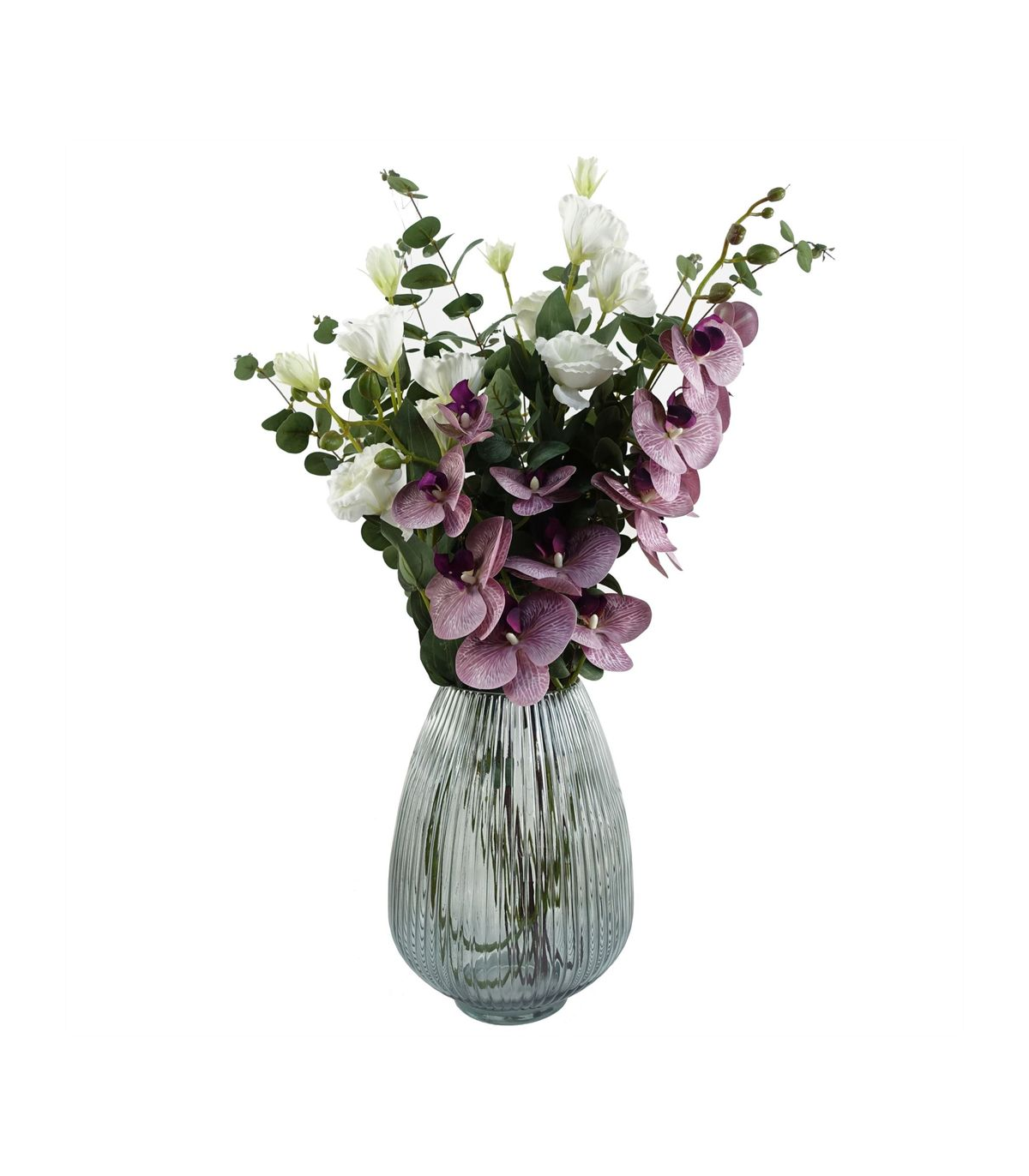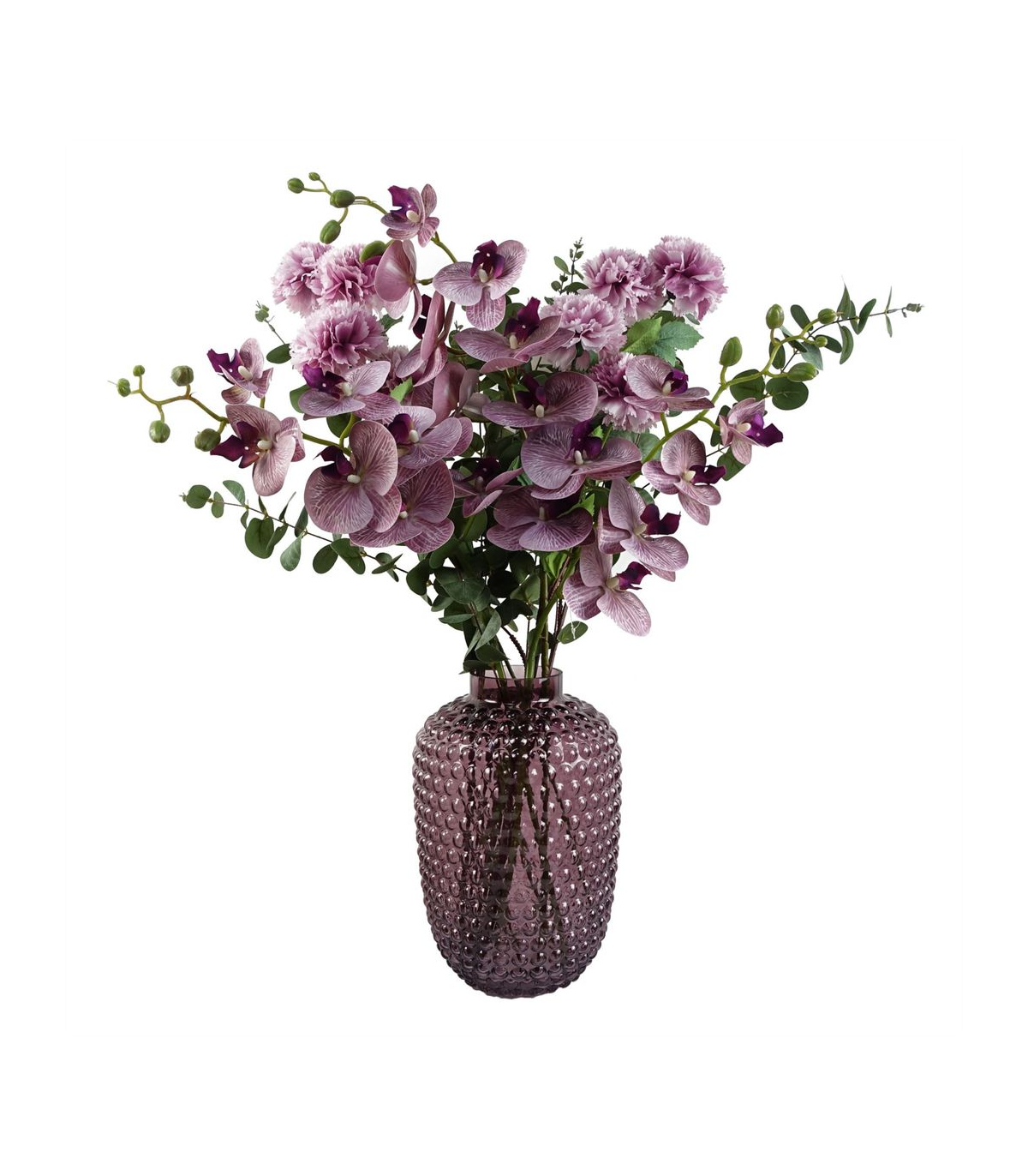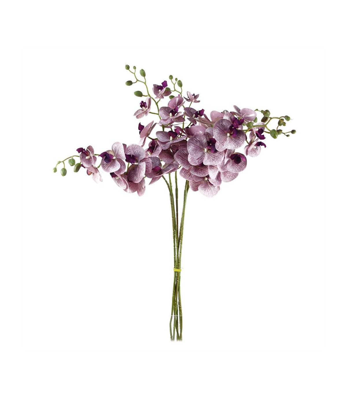 Pack of 6 x Purple phalaenopsis orchid artificial flower stems. Can be used to make arrangements with our other artificial flowers or as decorations on their own. Each stem measures 100cm overall height x 16cm wide x 10 deep and has 7 flowers. The stems are wired so these can be shaped and bent to arrange. These are easy to cut down shorter using a pair of wire cutters if required. Some of our photos show vases to give an idea of size and possibilities for arrangement but no vases or planters are included with these flowers.