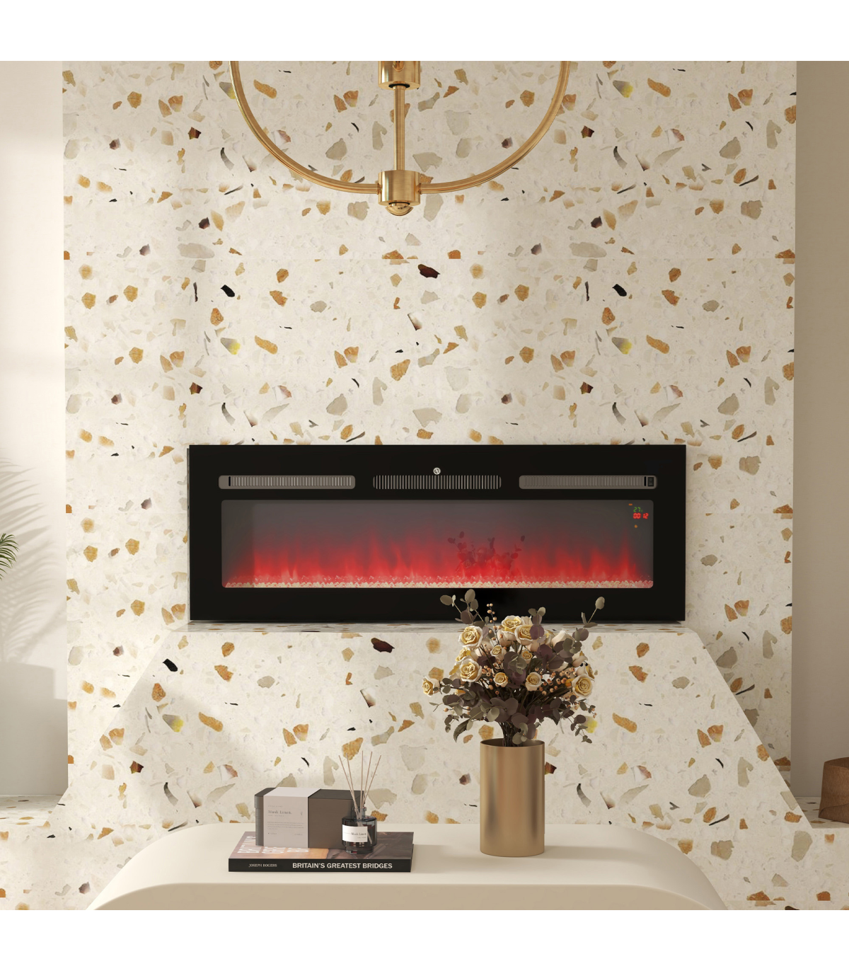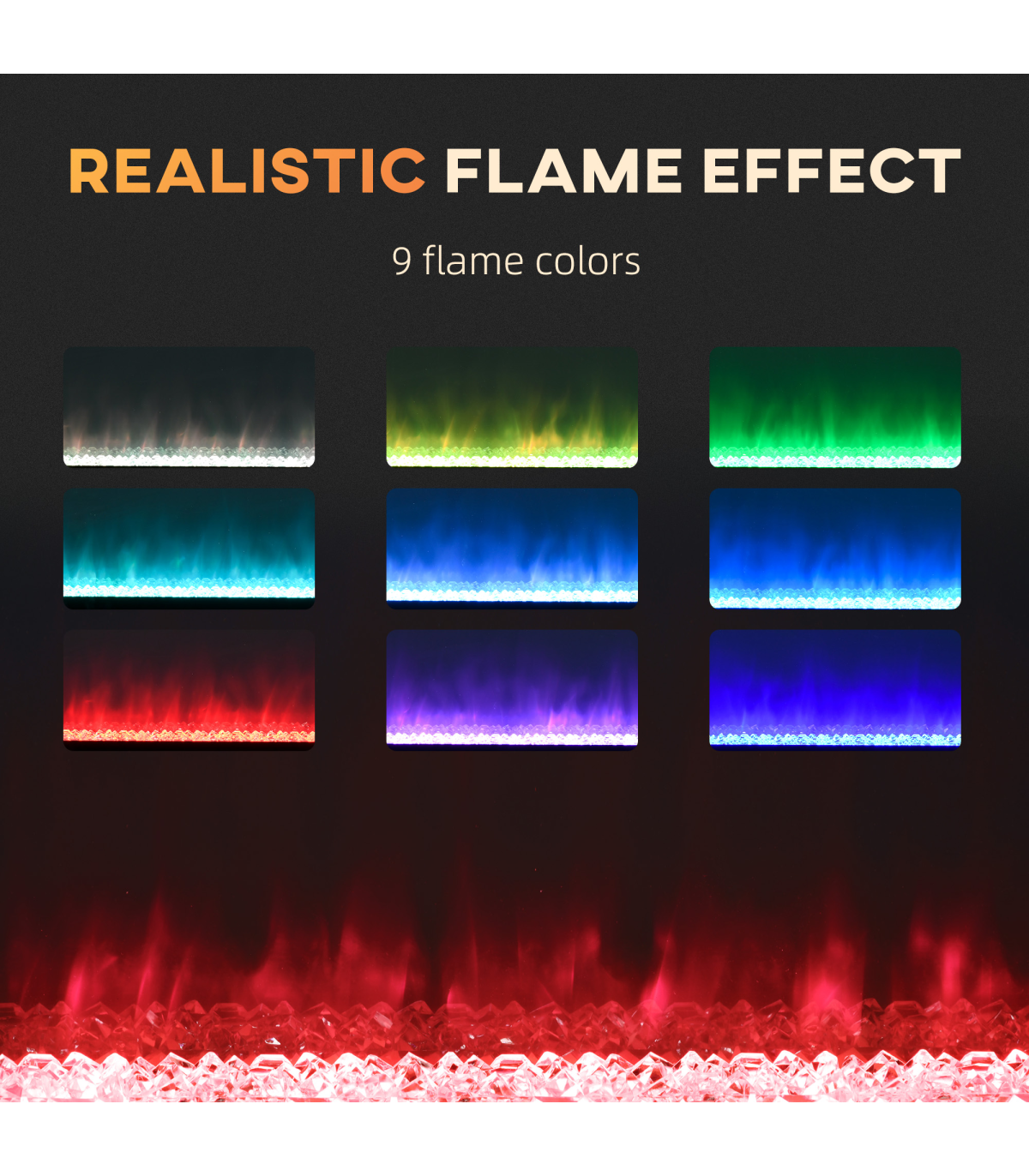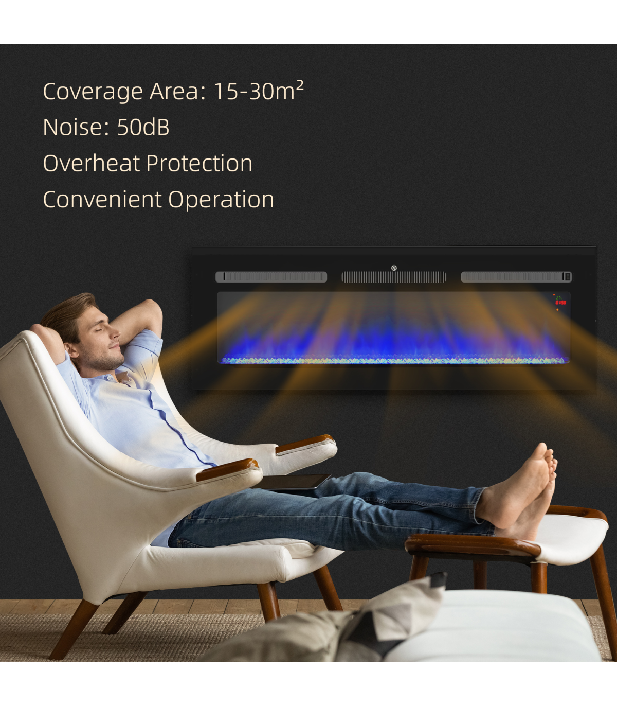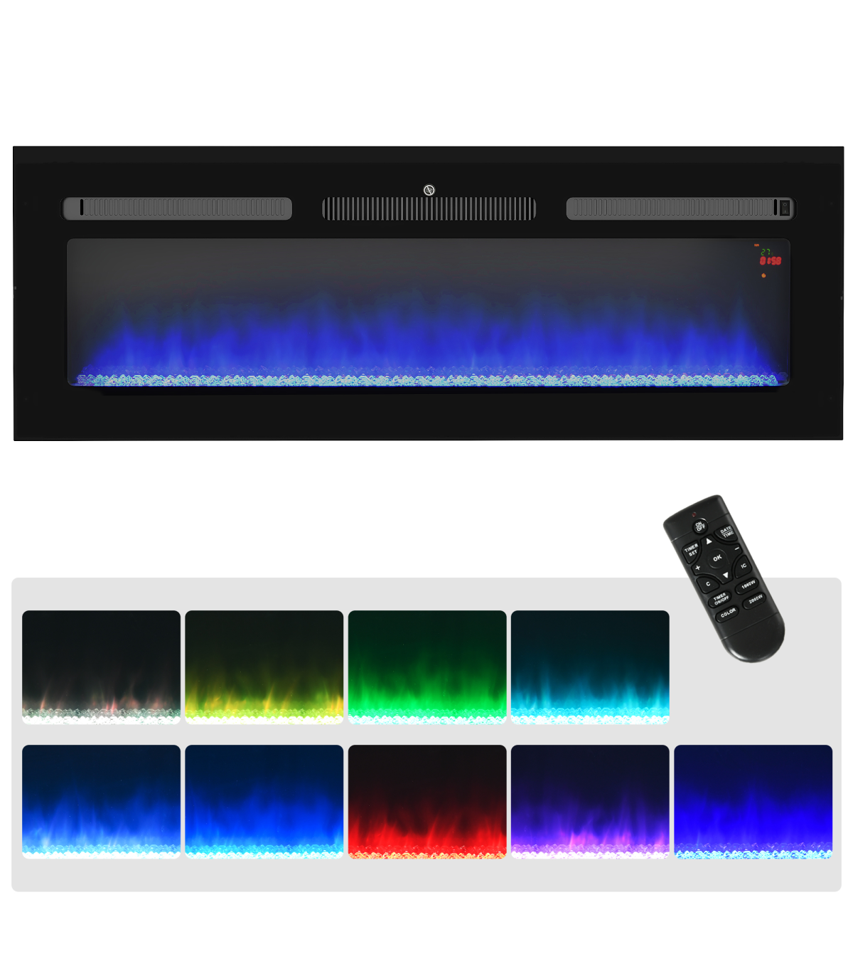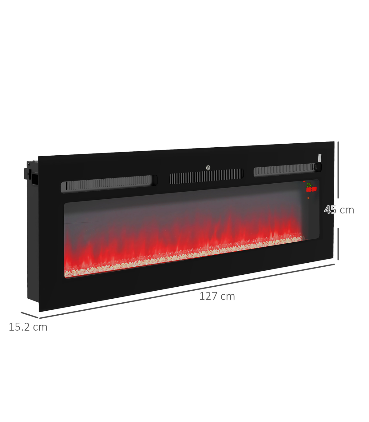 - On-wall fire: attach to a place you want to enjoy the heat and beauty - Nine flame colour, heat and running time are adjustable - 1000W/2000W option, with 15-30℃ adjustable temperature. Thermometer to control the heat - Use heat and flame screen independently - Weekly timer so it turns on and off when you want. Accurate to the minute - Overheat protection auto-shut off for ultimate safety - On-unit and remote controlled: adjust close by or far away- Colour: Black - Materials: Steel, Tempered Glass - Overall Dimension: 127L x 15.2W x 45Hcm - Fireplace Size: 110.5L x 22.5Hcm - Required Installation Opening Size: 119L x 16W x 43.7Hcm - Heating Coverage: 15-30m² - Presentation: Wall-Mounting and Insert (to Cabinet) - Cord Length: 1.6m - Remote Control Distance: 5m - Power Output: 1000W/2000W - Input: 220-240V/50Hz, 2000W/8.69A - Working Noise: <50dB - Battery: 2 x AAA 1.5V Battery (not included) - Item Label: 820-345V74BK