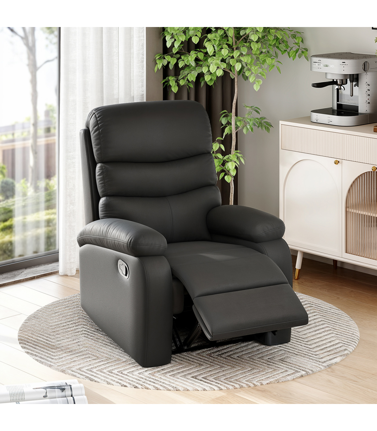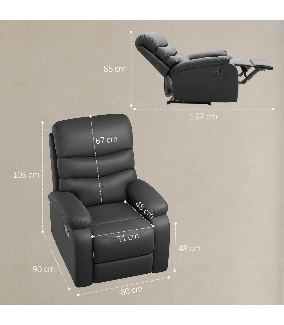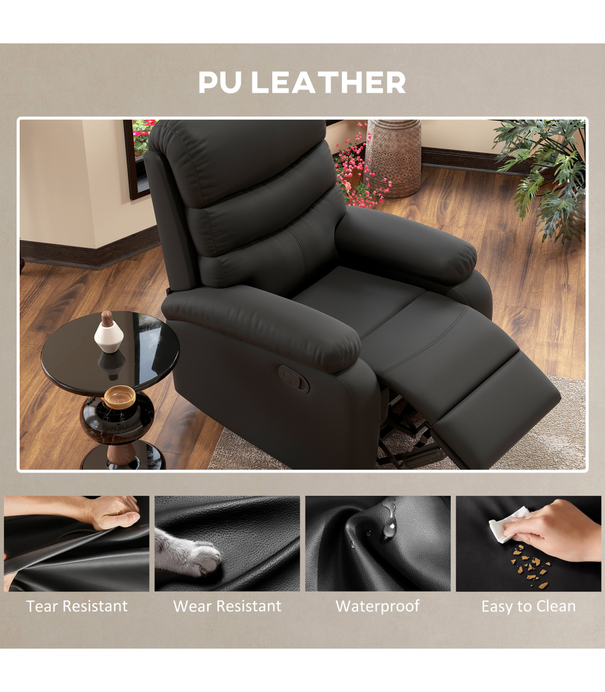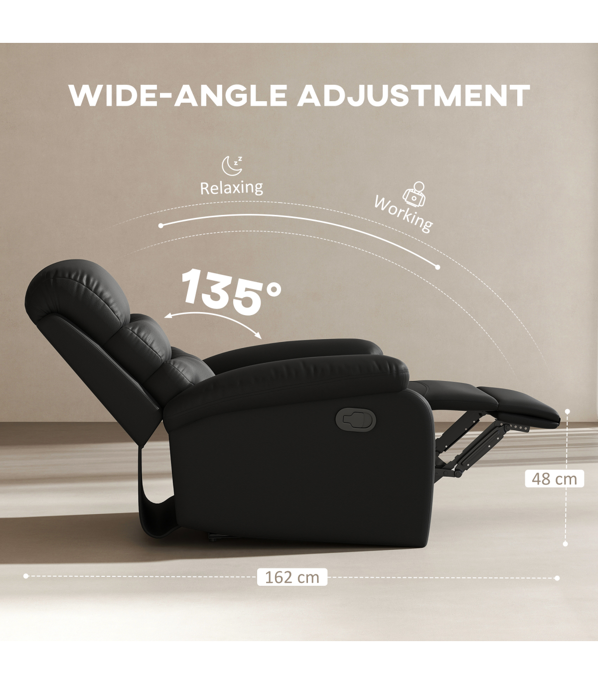 This manual reclining chair with footrest, from HOMCOM, is a good addition to any room in your home. Thick sponge wrapped in PU leather, making this cinema chair provide comfort and show a stylish appearance. Our cinema seats recline easily, so you can sit upright to work, lounge back to watch TV, or adjust the backrest to a fully reclined position for a nap. Comfortably, the footrest can extend from the front to let you stretch your legs and is easily retractable when not in use.