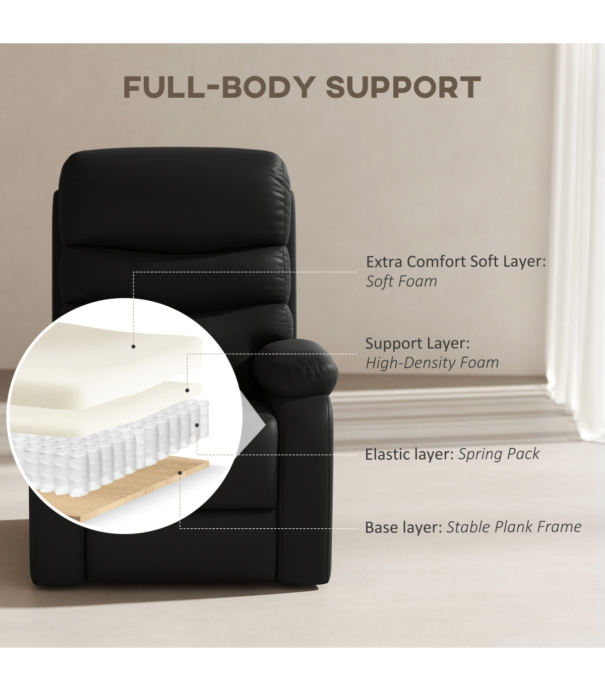 HOMCOM Manual Recliner Chair Armchair for Living Room with Footrest - Black Description: - 135° manual reclining back, with footrest: relax however you desire in this living room chair - Soft leather-like fabric is breathable, easy to care for, and durable - 'S' springs and elastic ensure the reclining chair maintains its shape and bounce - Suitable for various spaces such as the living room, bedroom, home office, etc. - Simple installation, requiring only 15 minutes