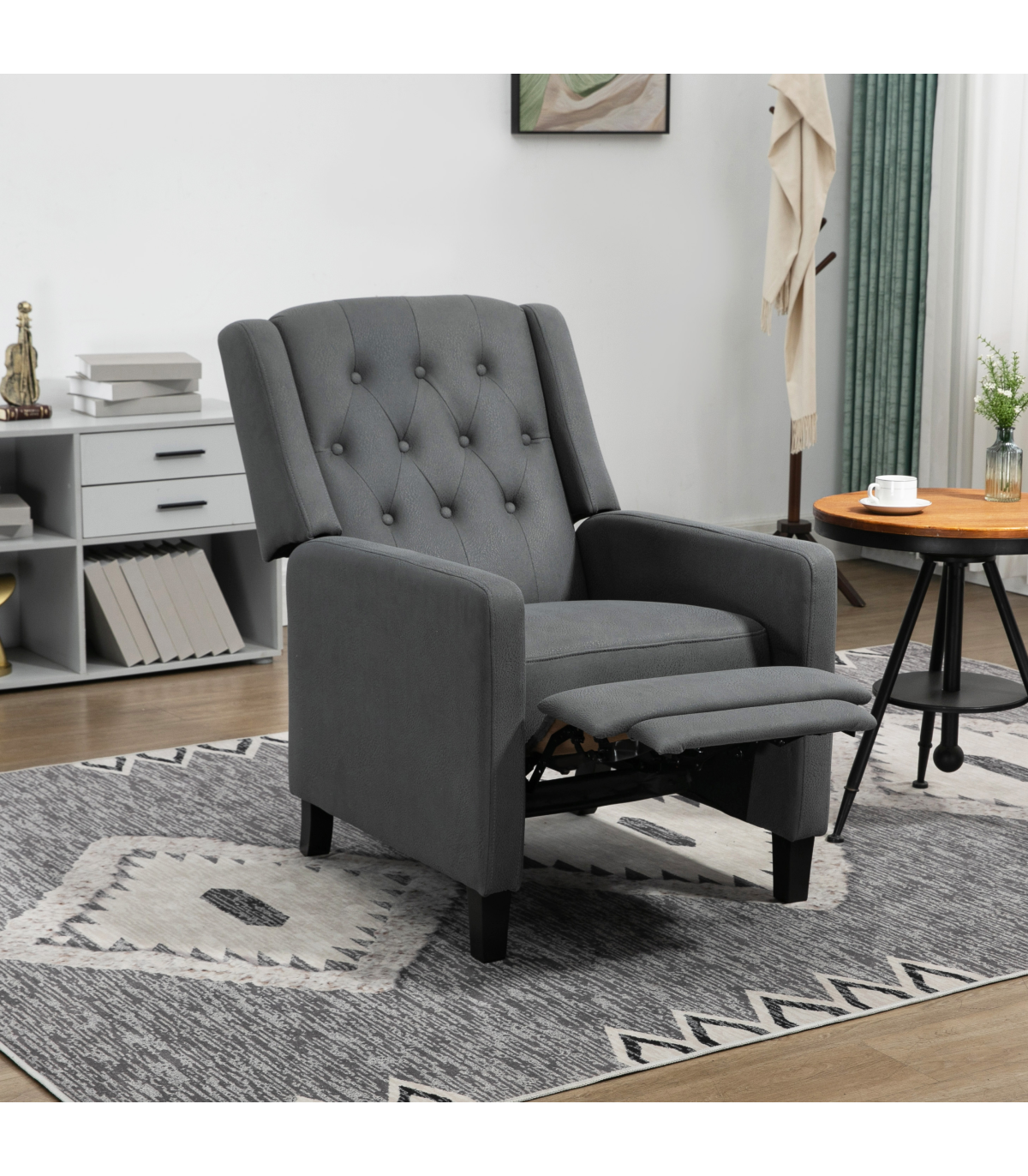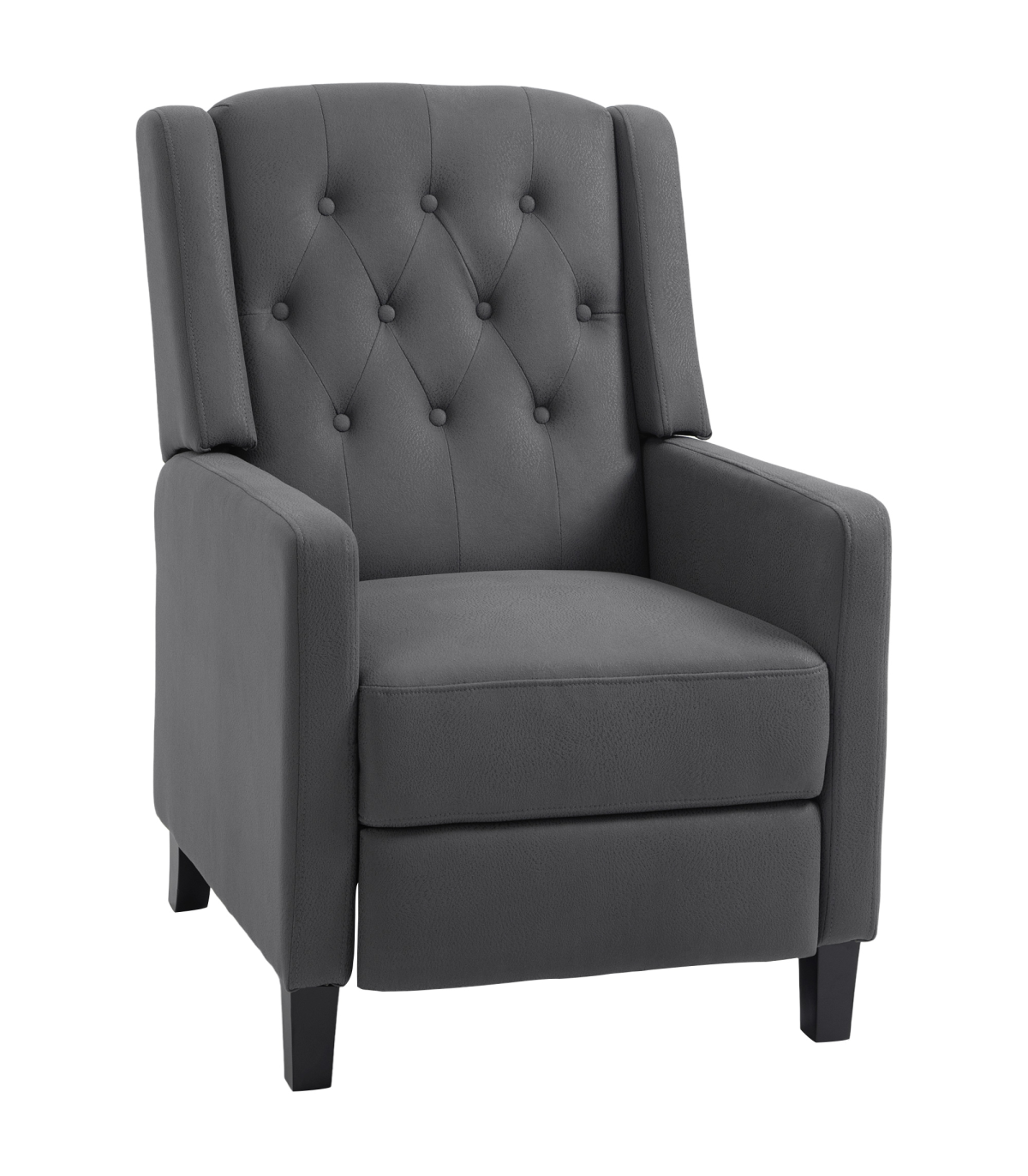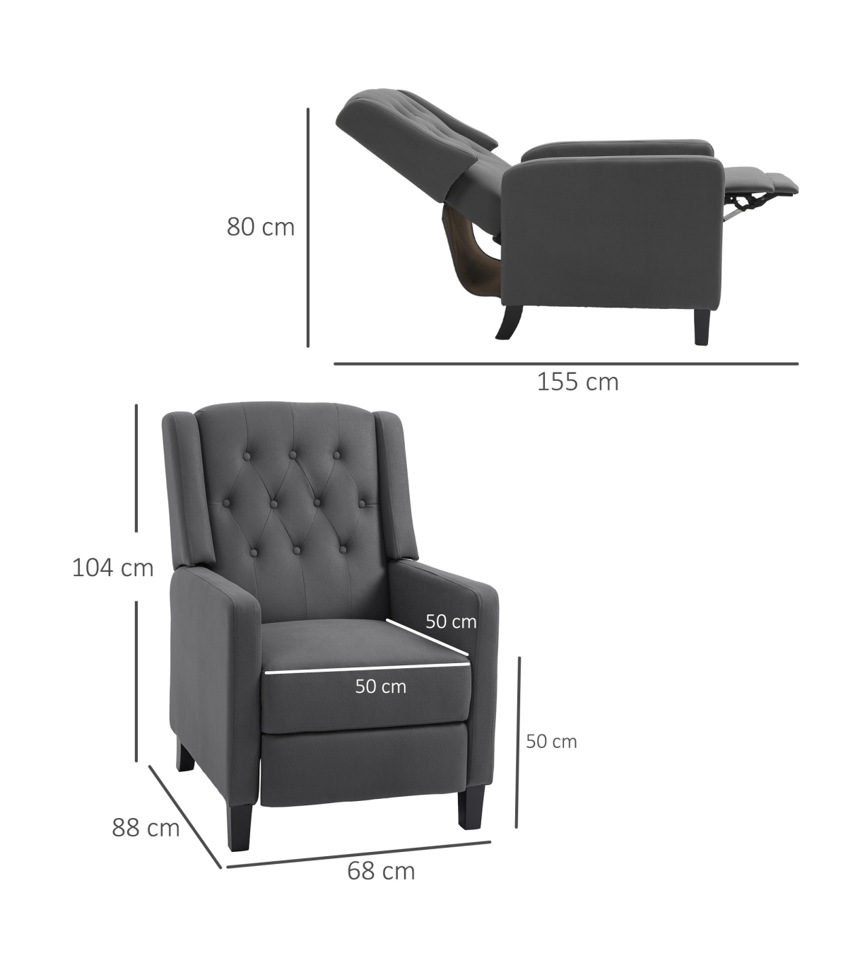- "HOMCOM Button Tufted Microfibre Cloth Recliner Armchair for Living Room, Grey" - Description: - Recliner armchair with push back feature that can go up to a maximum angle of 135°. - Footrest lifts up as the back of the chair moves. - Provides whole body relaxation. - Upholstered in soft microfibre material that resembles leather. - Soft and stylish reclining chair. - Thick padding for comfort and equipped with a pocket spring system to retain shape and bounce. - Suitable for living rooms, lounges, bedrooms, offices, and more. - Maximum load capacity of 150kg. - Easy to assemble.