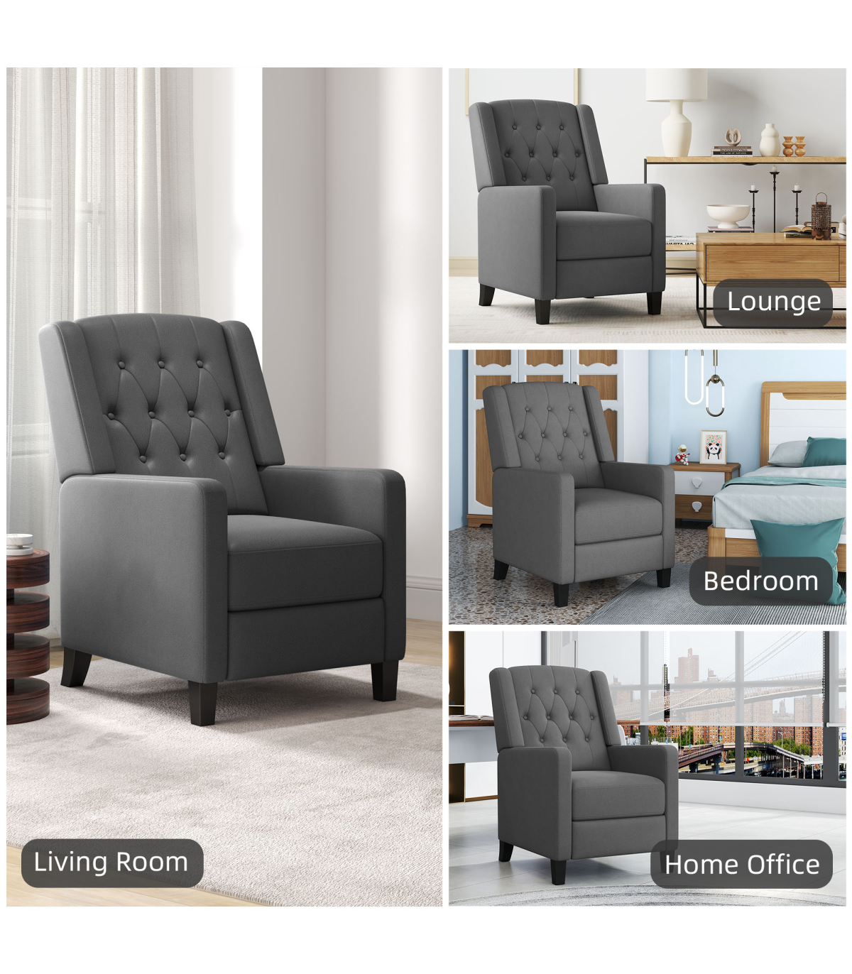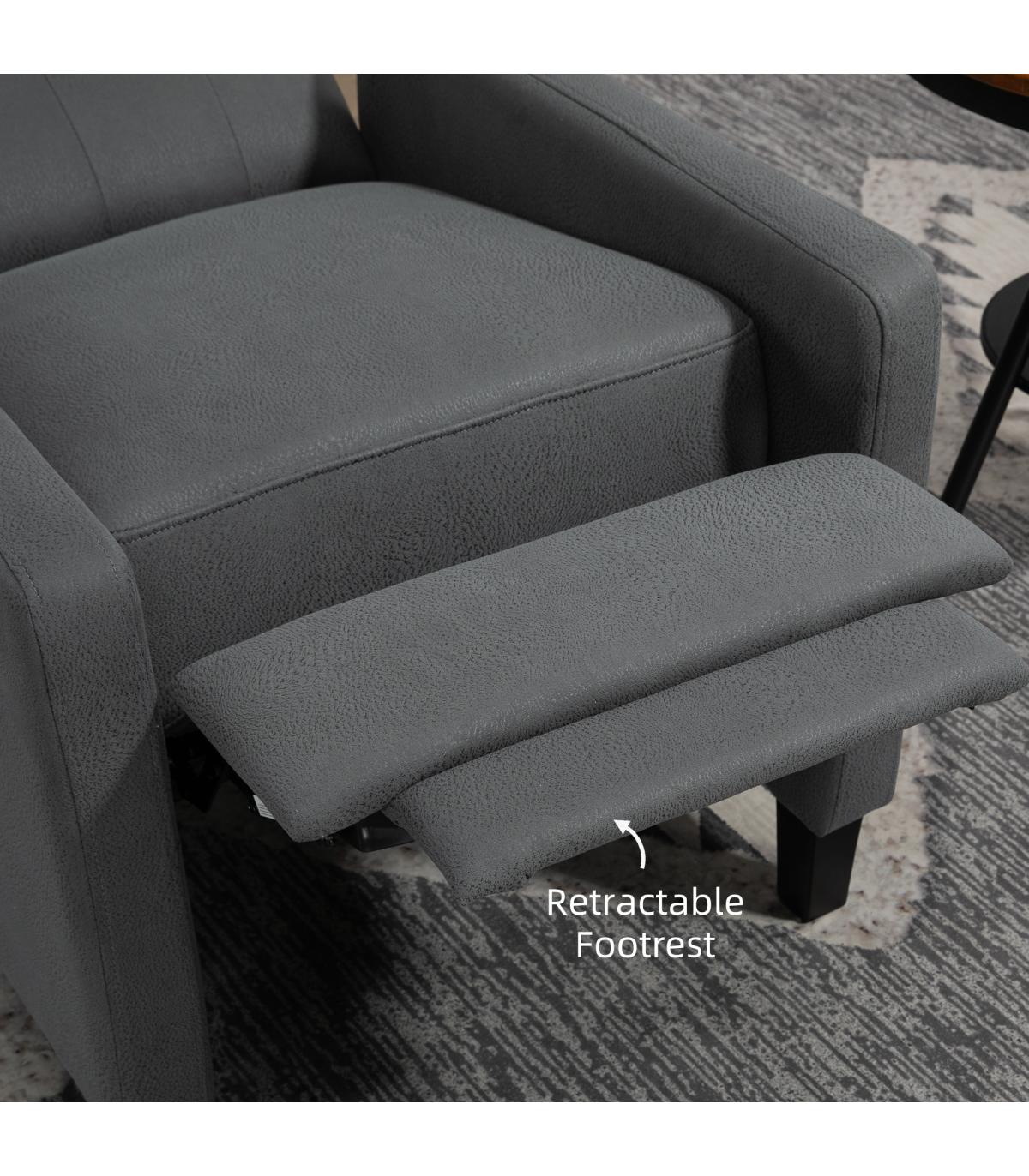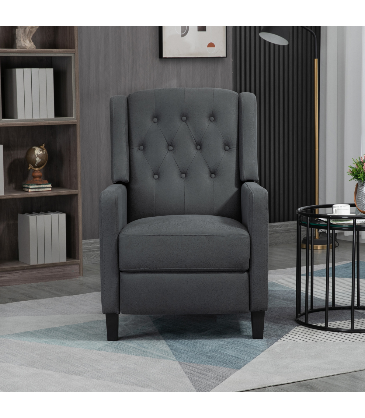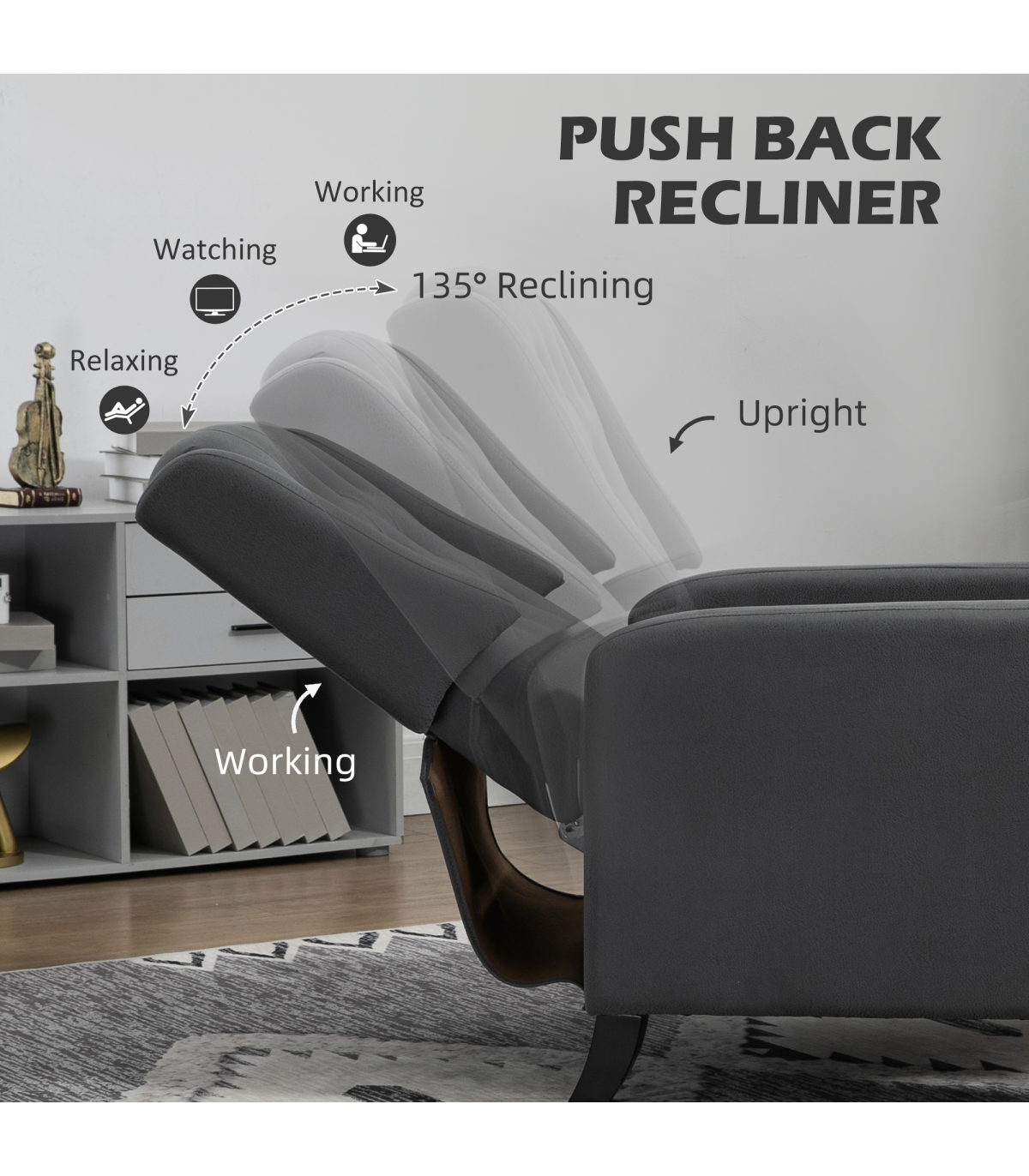 - "HOMCOM Button Tufted Microfibre Cloth Recliner Armchair for Living Room, Grey" - Description: - Recliner armchair with push back feature that can go up to a maximum angle of 135°. - Footrest lifts up as the back of the chair moves. - Provides whole body relaxation. - Upholstered in soft microfibre material that resembles leather. - Soft and stylish reclining chair. - Thick padding for comfort and equipped with a pocket spring system to retain shape and bounce. - Suitable for living rooms, lounges, bedrooms, offices, and more. - Maximum load capacity of 150kg. - Easy to assemble.