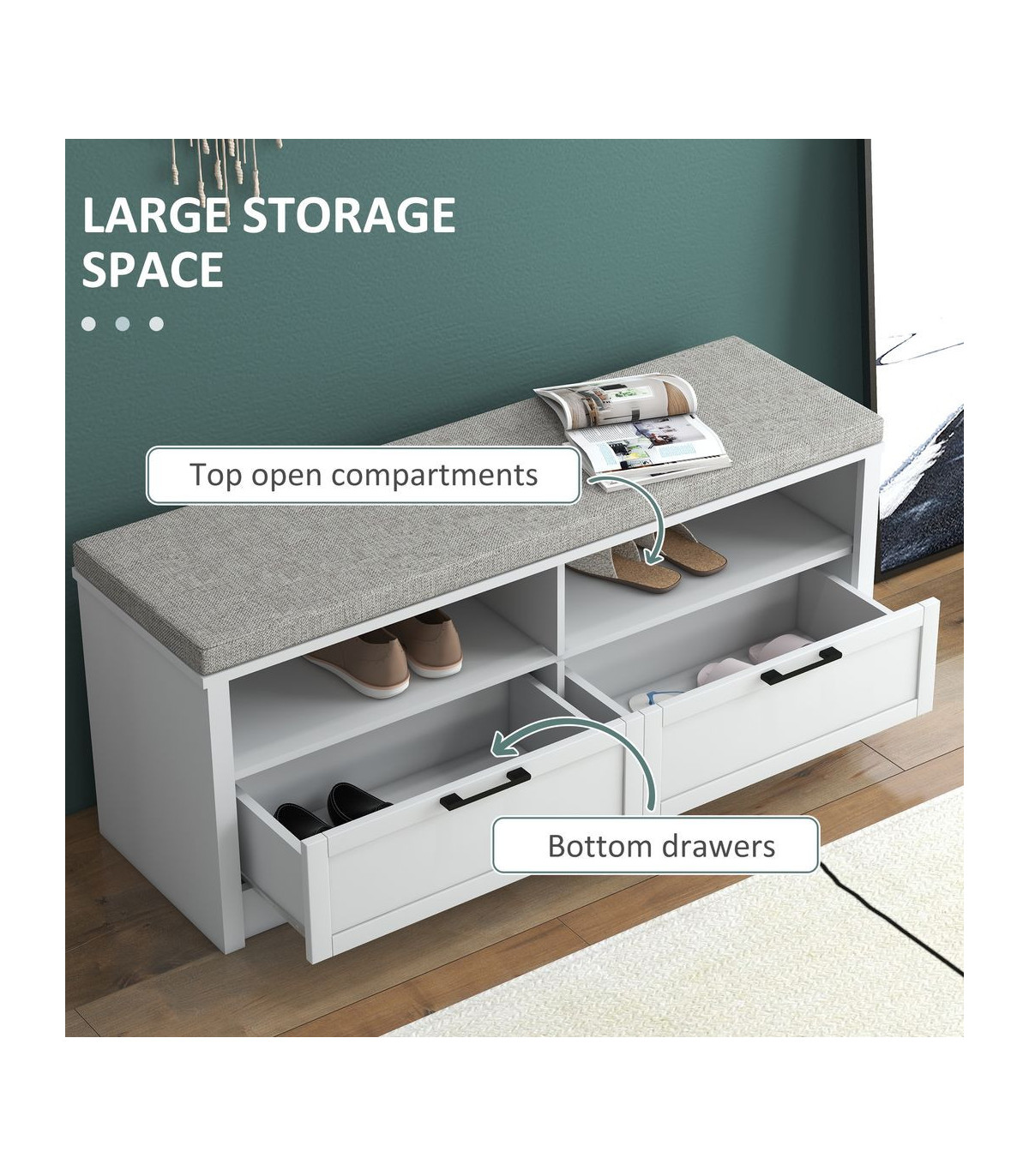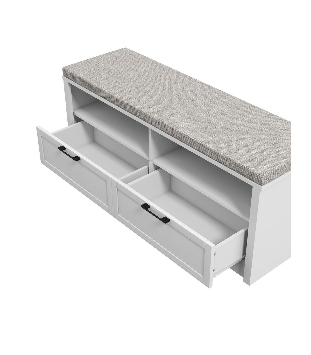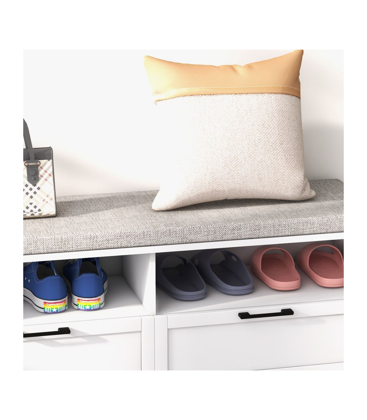 each open compartment holds roughly five pairs of shoes. A padded seat on the top so you can sit down comfortably when putting shoes on and taking them off.