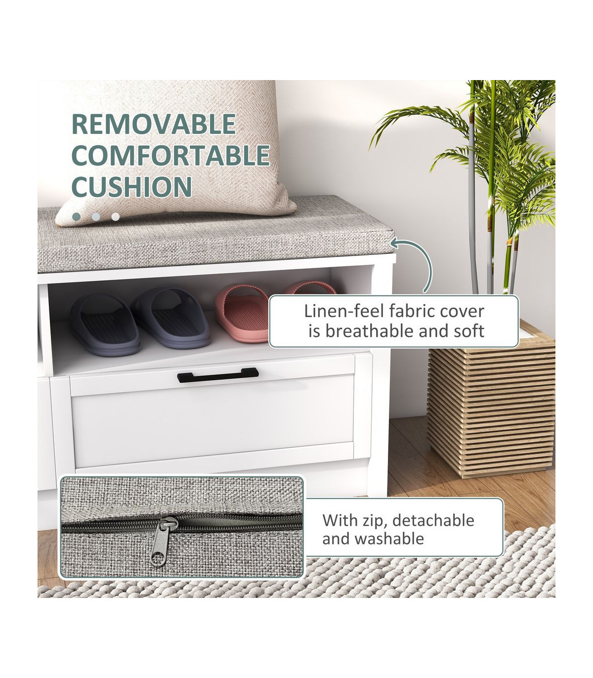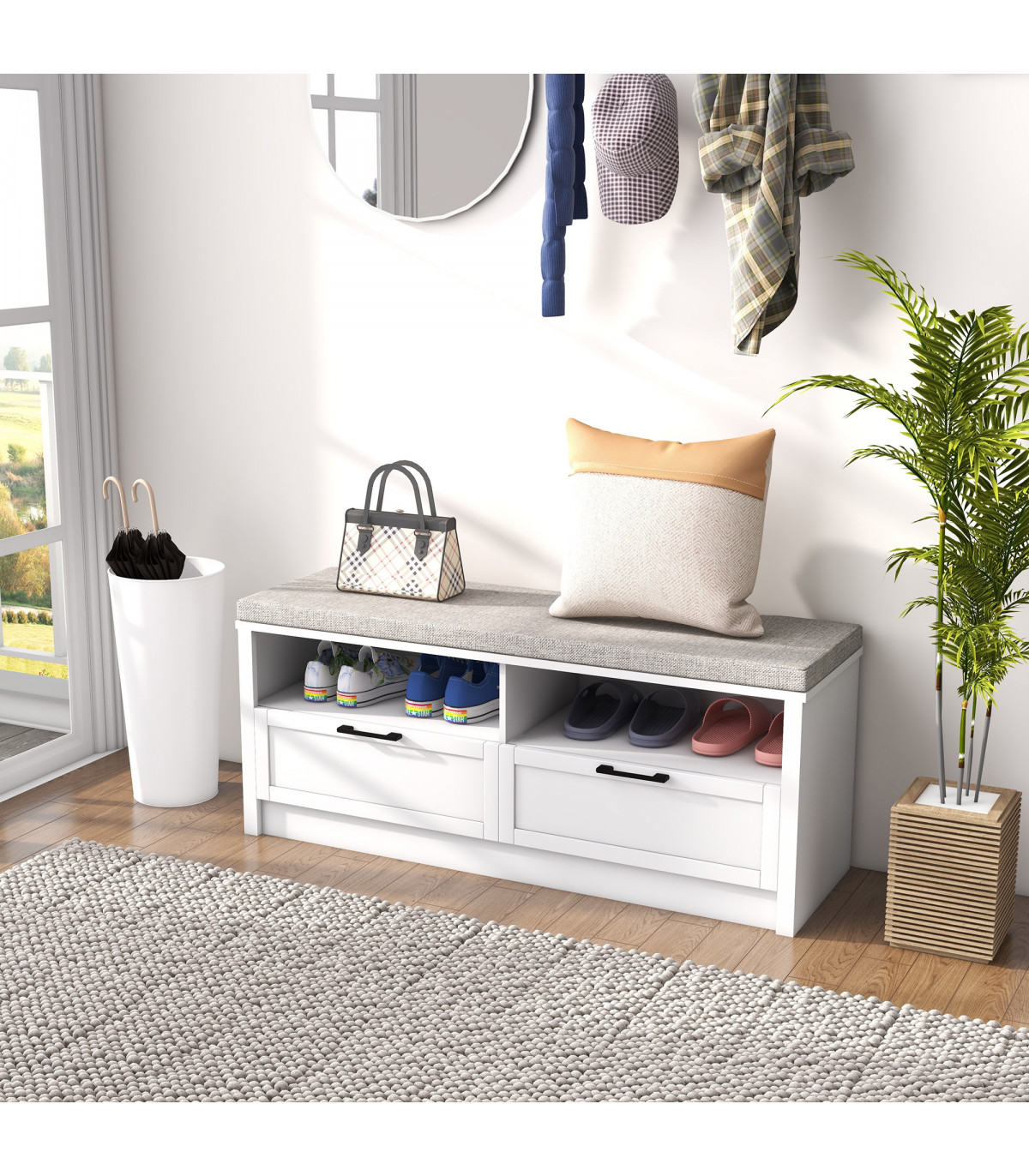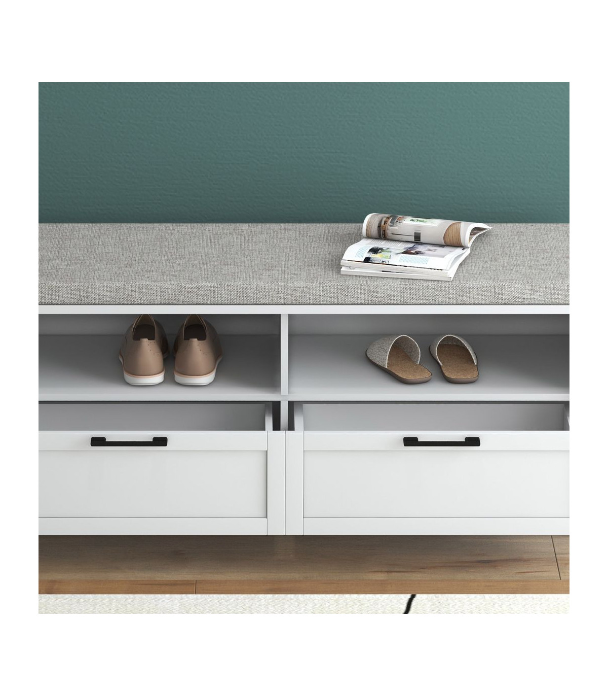 each open compartment holds roughly five pairs of shoes. A padded seat on the top so you can sit down comfortably when putting shoes on and taking them off.