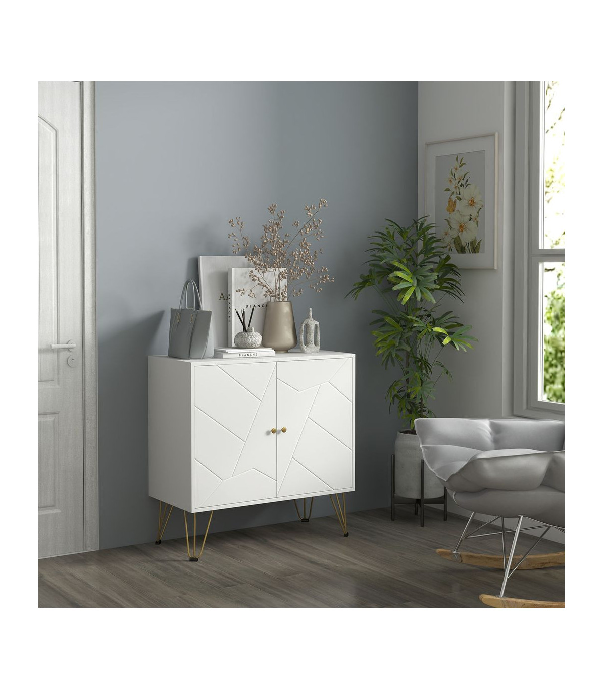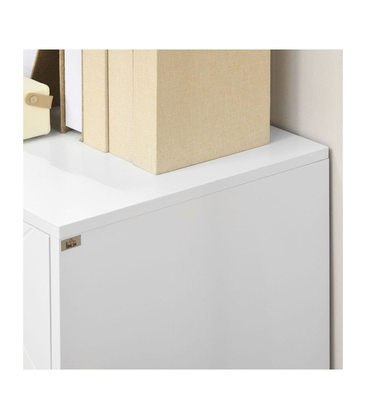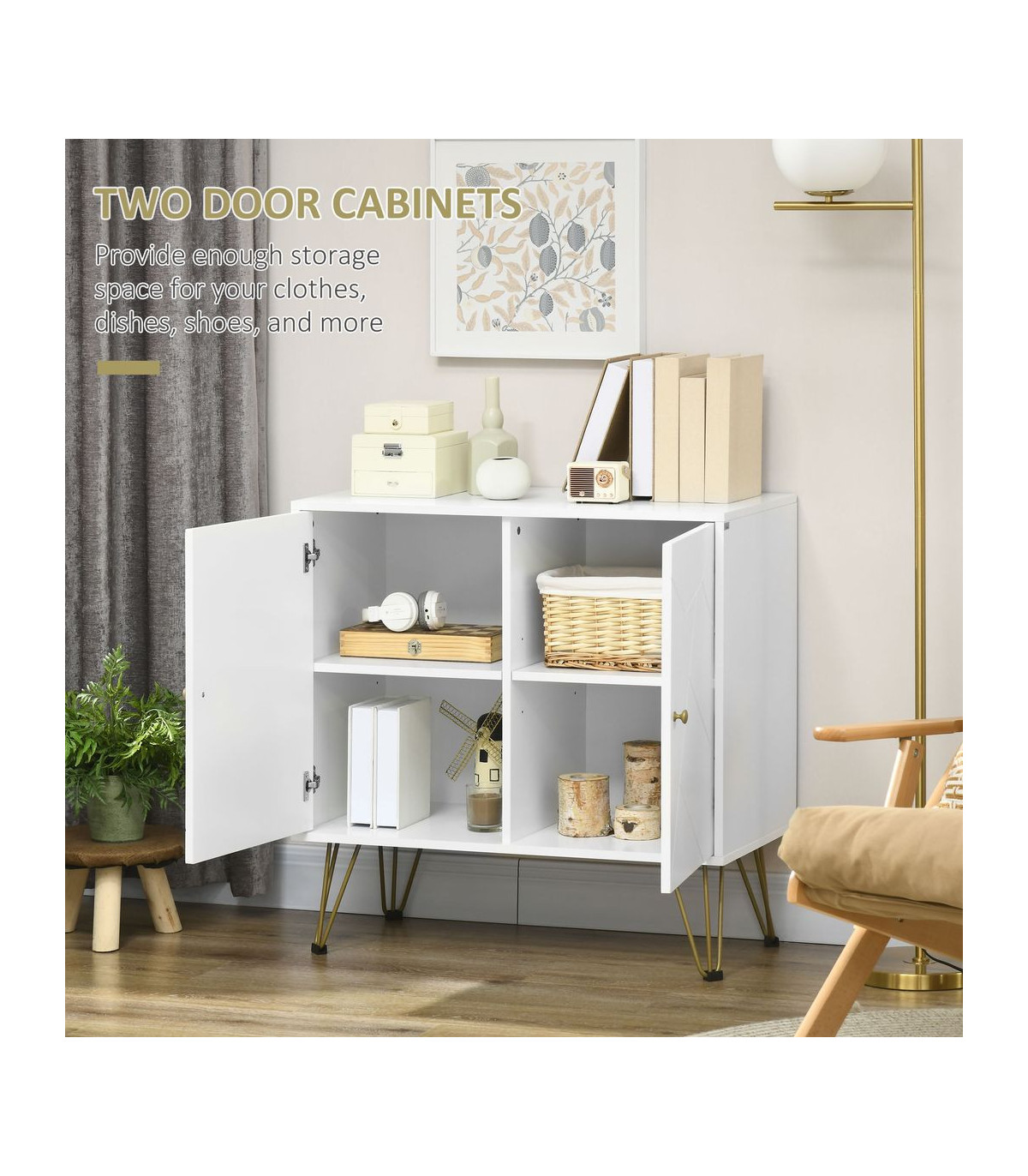 ● A wide tabletop and 2 cabinets with 2-tier shelf to keep all your items