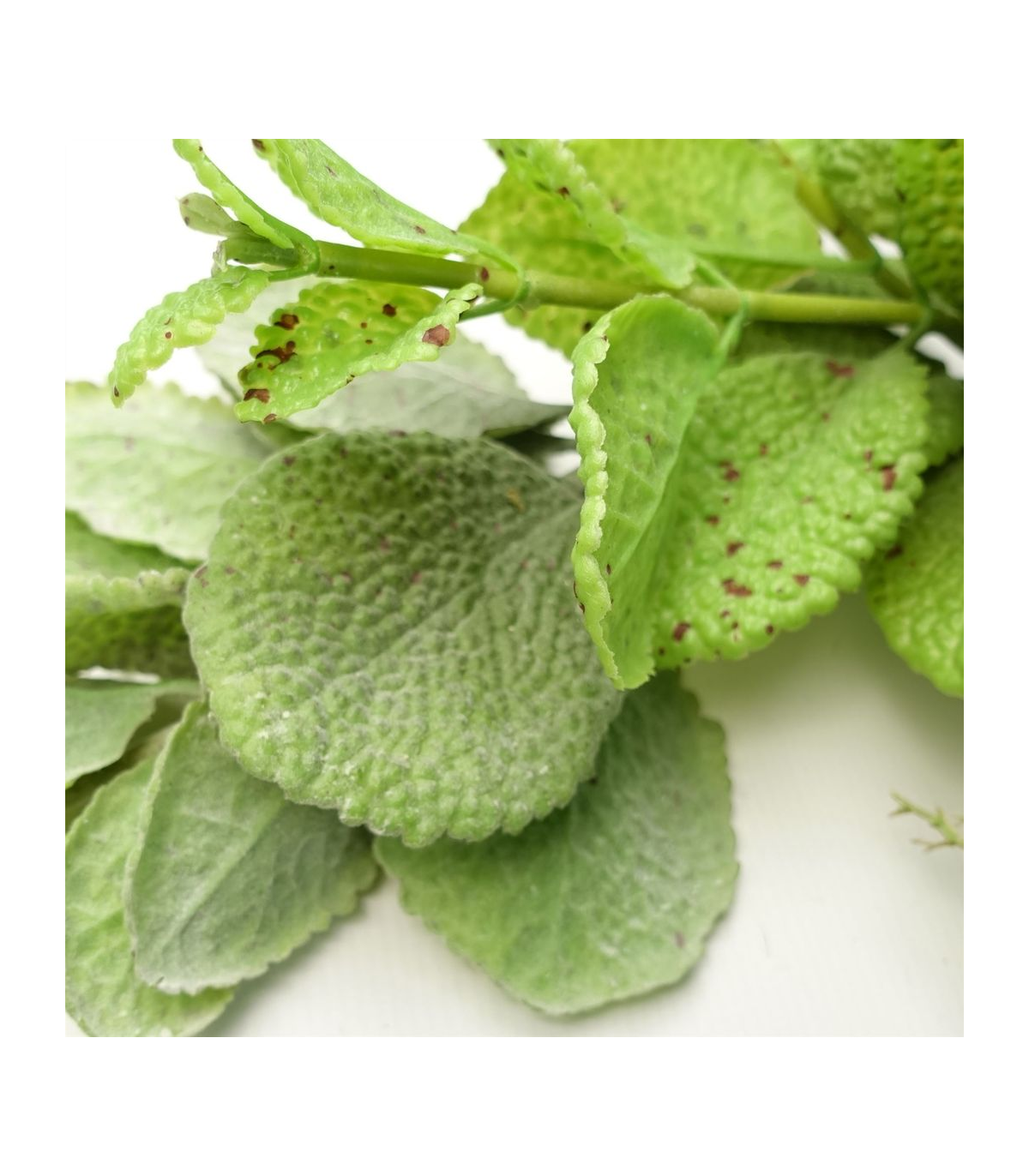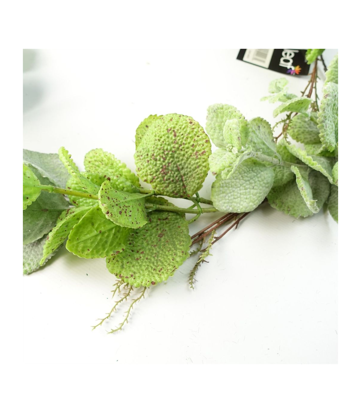 Artificial mint leaf garland. Foliage width as we have it arranged is 125cm x 30cm x 20cm approximately when totally outstretched from end to end. Leaves and stems are plastic. This is arrangeable and it is wired inside the stems so you can shape the garland to fit your space. This is a handmade item and there are minor differences between garlands.