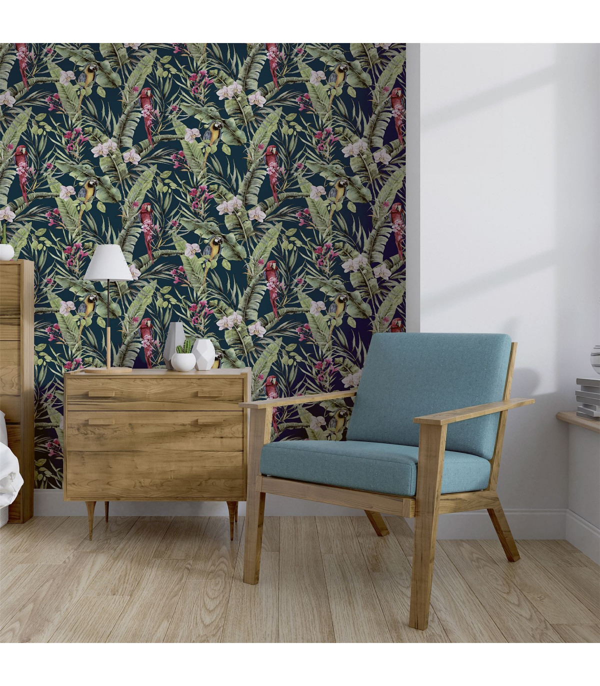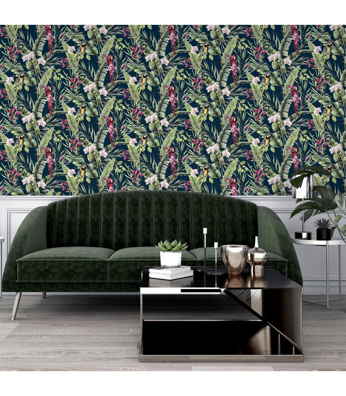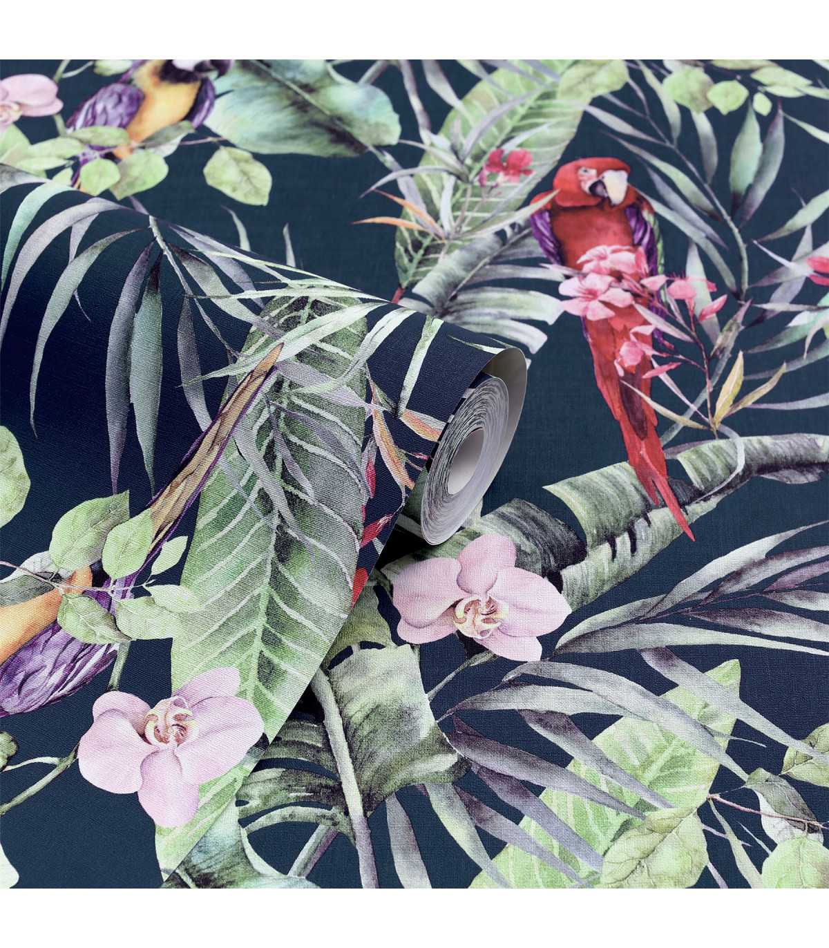 A stunning wallpaper design with a truly tropical and exotic feel, this is the perfect option for a dramatic and contemporary interior. With a navy-blue background colour, the bold botanical, floral and animal motifs really stand out. Colourful parrots take centre stage on this jungle themed eye-catching wallpaper. An ideal choice for a feature wall in an open plan living room or for a bedroom. Hanging Method: Paste the Paper Pattern Match: Off Set 26.5cm Pattern Repeat: 53cm