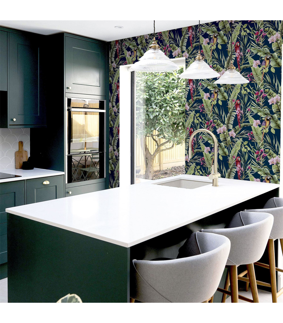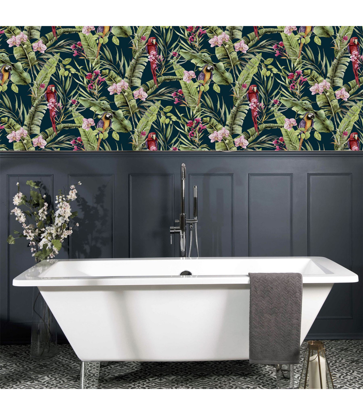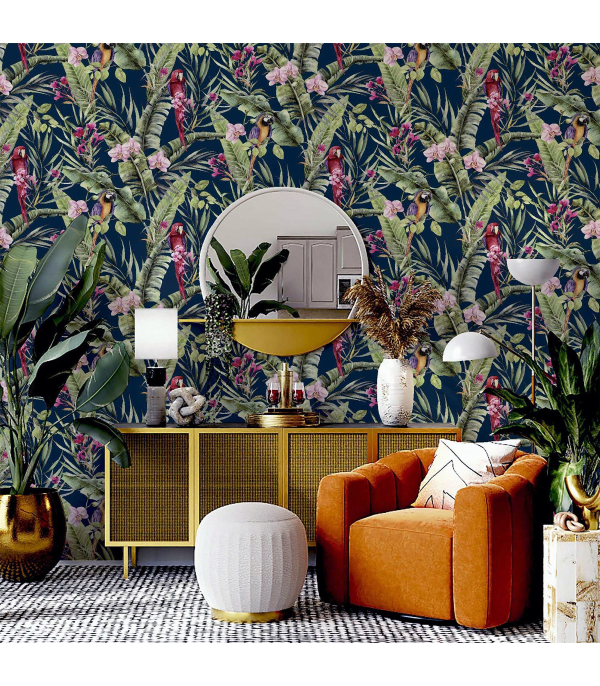 A stunning wallpaper design with a truly tropical and exotic feel, this is the perfect option for a dramatic and contemporary interior. With a navy-blue background colour, the bold botanical, floral and animal motifs really stand out. Colourful parrots take centre stage on this jungle themed eye-catching wallpaper. An ideal choice for a feature wall in an open plan living room or for a bedroom. Hanging Method: Paste the Paper Pattern Match: Off Set 26.5cm Pattern Repeat: 53cm