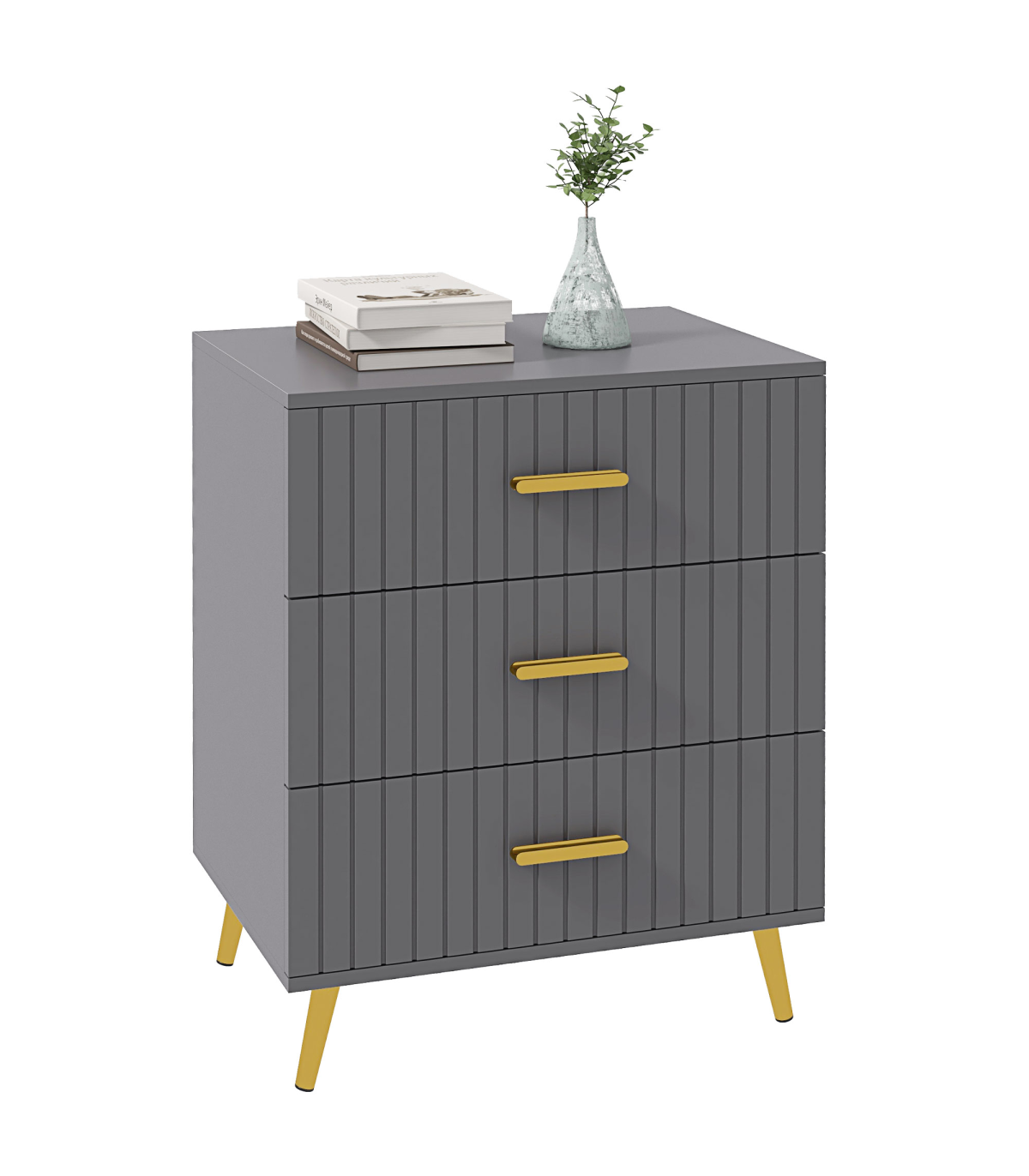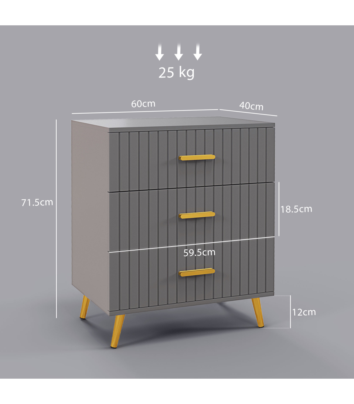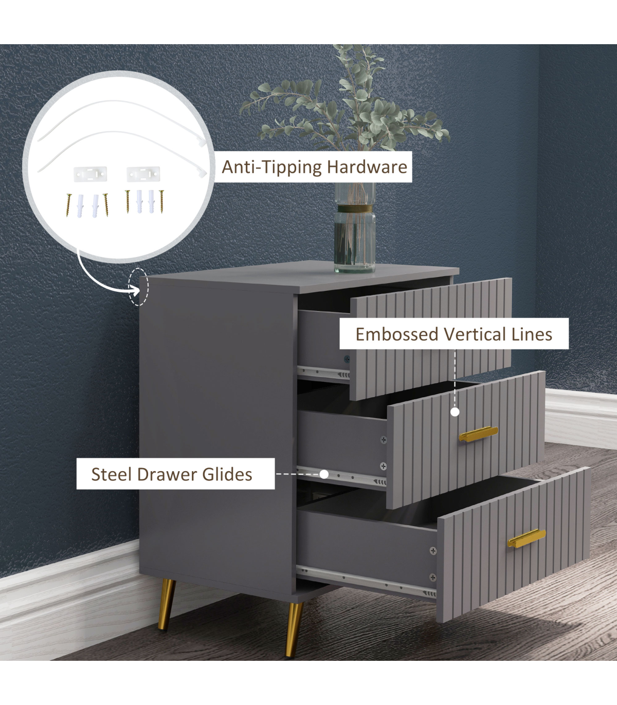 ● Three drawers offer lots of storage for your clothing. Steel drawer glides for smooth movement. Flat tabletop for display; ● Embossed front lines for a point of difference; ● Muted grey colour, with gold coloured accents for a luxe finish; ● Melamine coated particle board body, with strong and supportive aluminium legs with non-slip feet; ● Anti-tipping straps included for safety; ● Maximum load 25kg, assembly required; ● Colour: Dark Grey, Gold Tone; ● Materials: Aluminium Alloy, Particleboard; ● Overall Dimensions: 60W x 40D x 71.5Hcm; ● Drawer Inner Size: 52W x 33.5D x 10.5Hcm; ● Leg Height: 12 cm; ● Weight Capacity: 25kg (overall), 10kg (top), 5kg (each drawer); ● Item Label: 831-772V80CG;