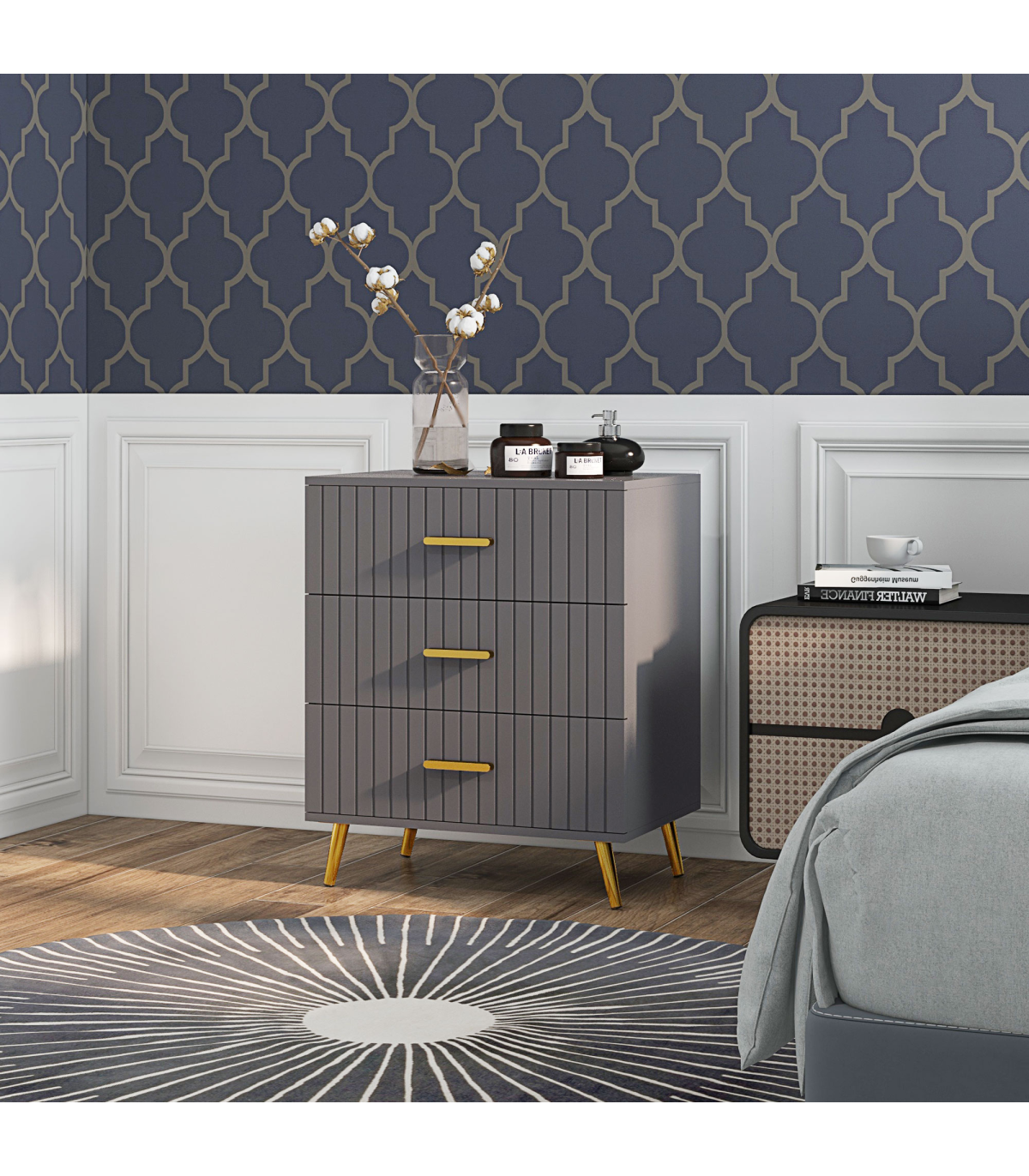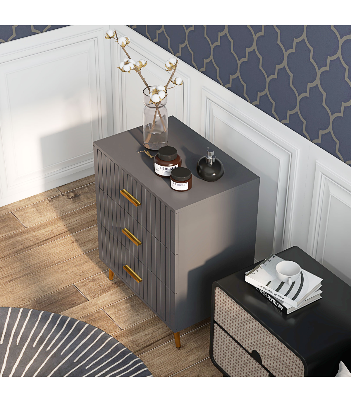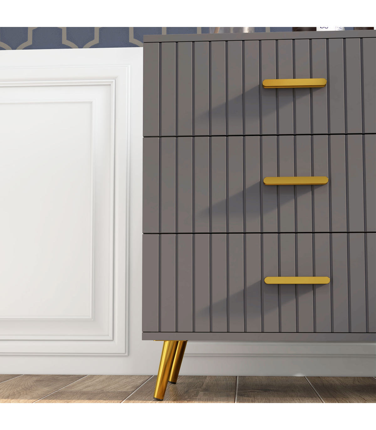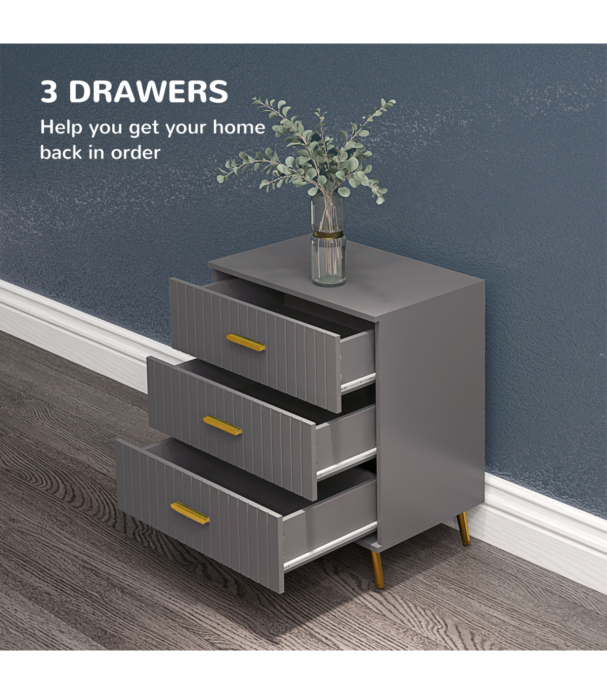 ● Three drawers offer lots of storage for your clothing. Steel drawer glides for smooth movement. Flat tabletop for display; ● Embossed front lines for a point of difference; ● Muted grey colour, with gold coloured accents for a luxe finish; ● Melamine coated particle board body, with strong and supportive aluminium legs with non-slip feet; ● Anti-tipping straps included for safety; ● Maximum load 25kg, assembly required; ● Colour: Dark Grey, Gold Tone; ● Materials: Aluminium Alloy, Particleboard; ● Overall Dimensions: 60W x 40D x 71.5Hcm; ● Drawer Inner Size: 52W x 33.5D x 10.5Hcm; ● Leg Height: 12 cm; ● Weight Capacity: 25kg (overall), 10kg (top), 5kg (each drawer); ● Item Label: 831-772V80CG;