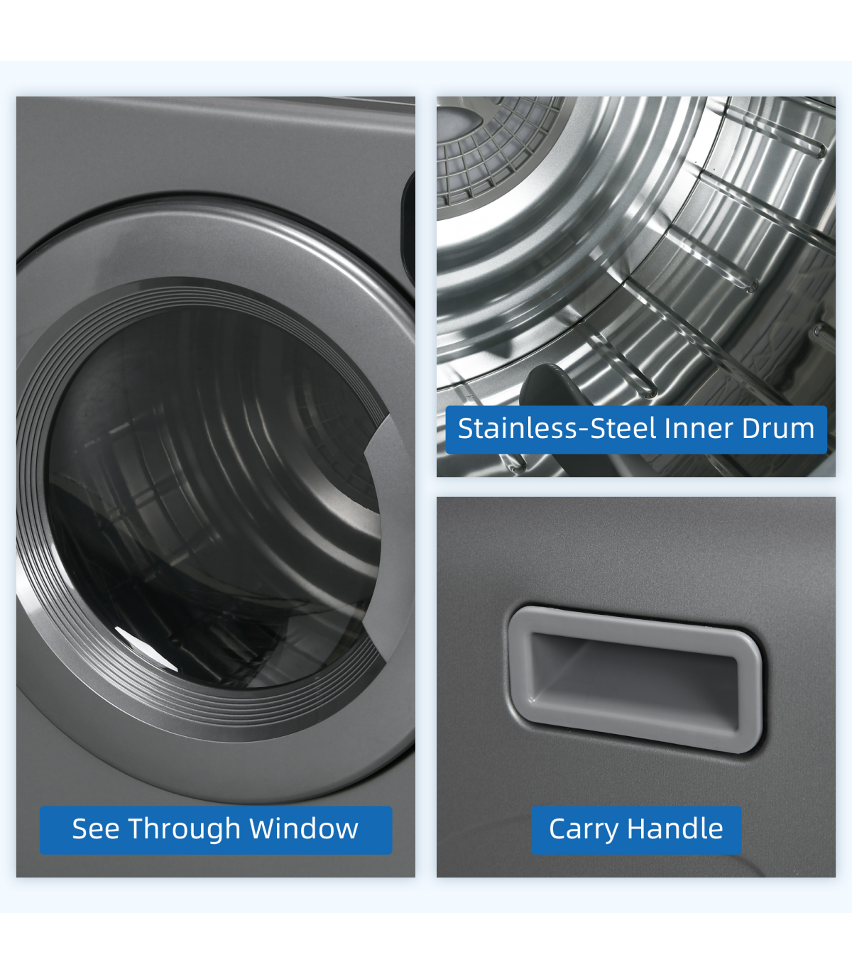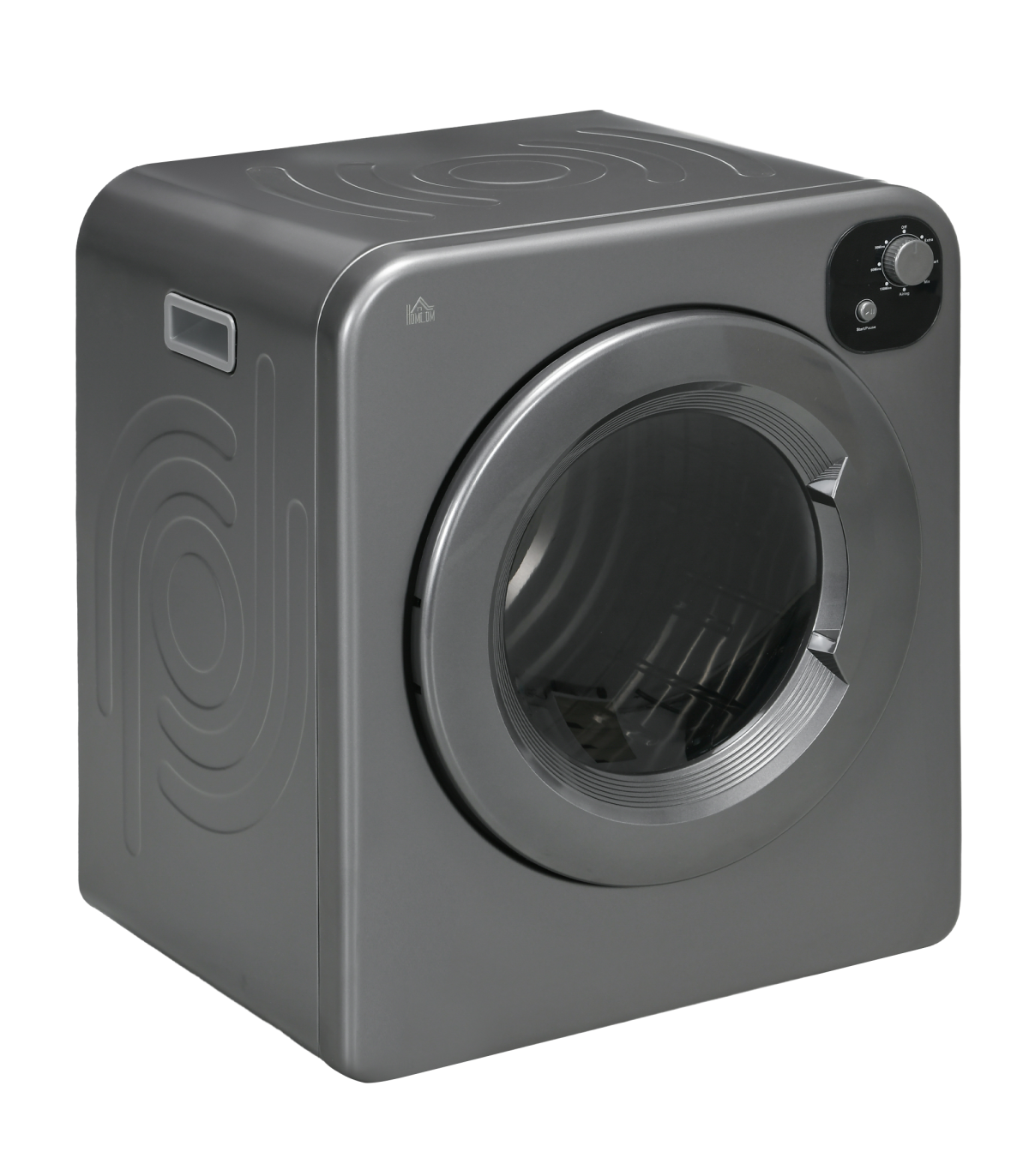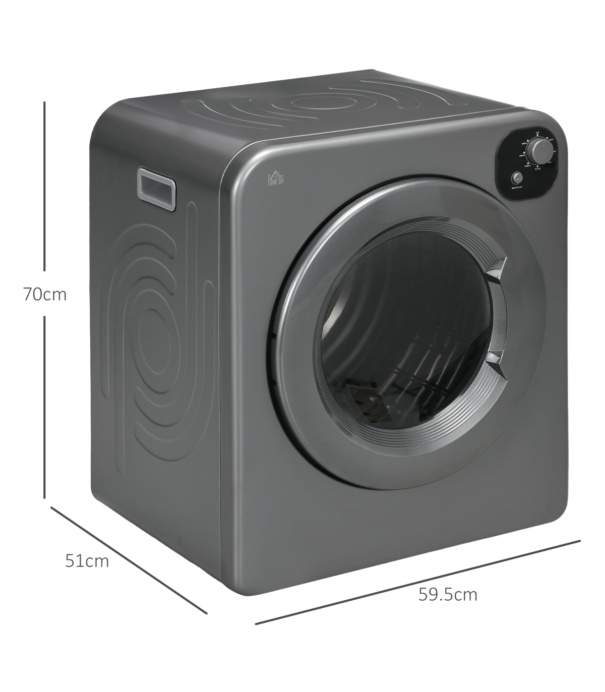 ● Seven modes: extra, smart, mix, airing, 30 minutes, 60 minutes and 150 minutes; ● Start/pause button to enter machine and add/remove clothing; ● 1500W power and 360° turbine drum for powerful drying; ● 6kg capacity can dry 15 T-shirts, a duvet set and 35 towels at once; ● Three set-up ways: on bracket (not included), on top of washer or standing alone; ● Two-layer filter prevents lint build-up; ● Rust resistant and tough stainless steel drum; ● Automatically stops when clothes are dry: great for putting on at night; ● Air vent connector included; - Colour: Grey; - Material: PCM Coloured Steel, Stainless Steel, Plastic; - Overall Dimension: 59.5L x 51W x 70Hcm; - Inner Size: Φ57 x 33Hcm; - Annual Energy Consumption: 441kWh; - Noise: ≤65db; - Voltage: 220V-240V, 50/60Hz; - Power/Current: 1500W/6.52A; - Cable Length: 1.5m; - Item Label: 853-025V70GY; Note; The wall-mounted bracket is not included;