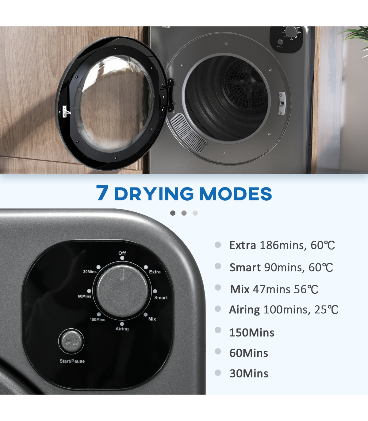 Drying clothes no longer means laundrettes trips. Bring in this HOMCOM compact tumble dryer. Weighing only 27kg, it can easily be mounted to the wall, placed on top of your washing machine or left standing alone: the choice is yours. It features seven modes to dry clothes different ways. Its 6kg capacity holds the equivalent of 15 t-shirts, one duvet set and 35 smaller towels at once - great for personal use! All you need to do to is load, press the button and wait for perfectly dry clothes.