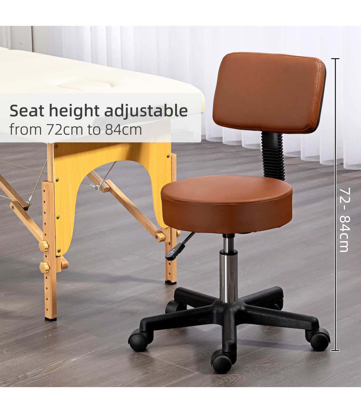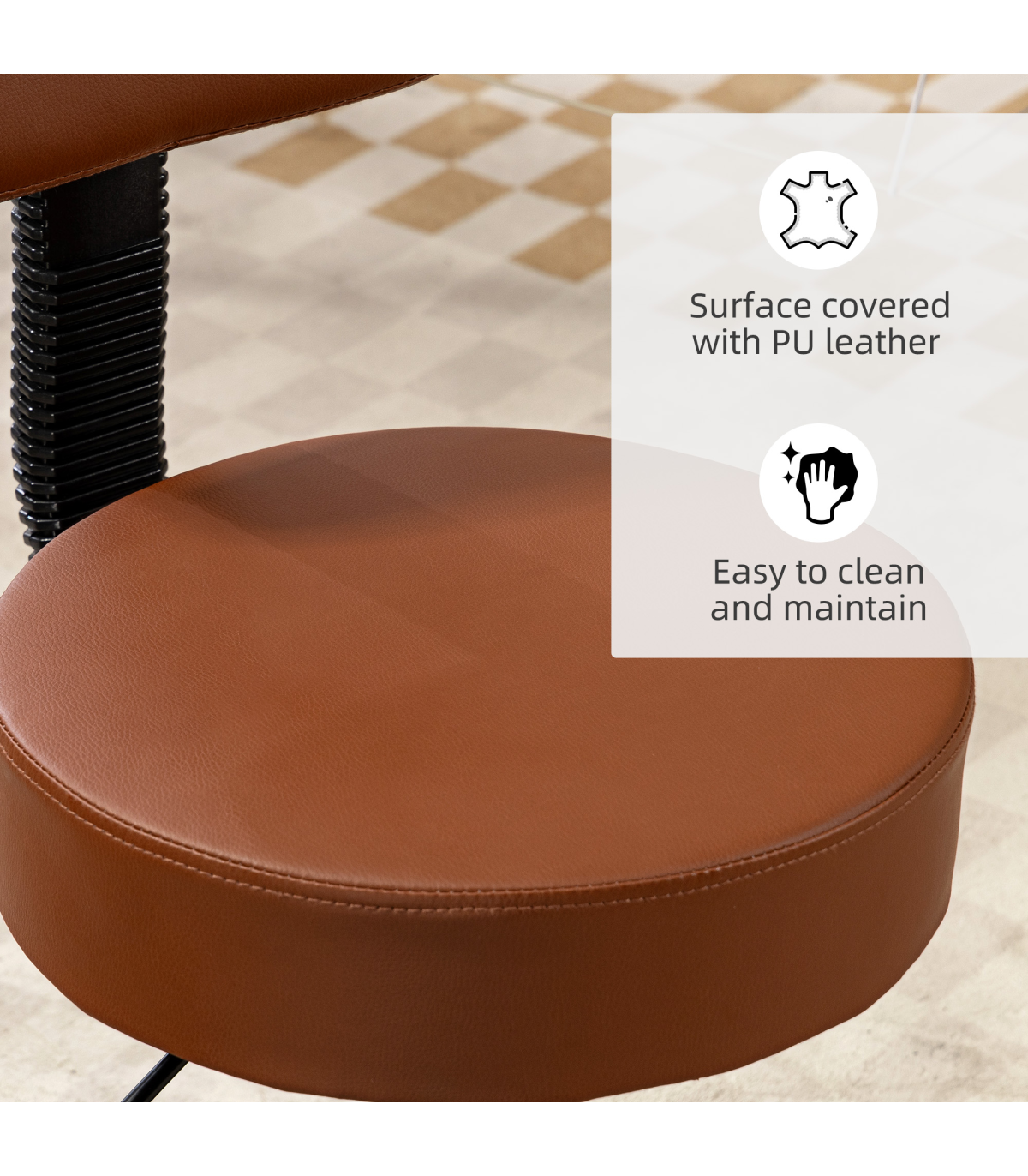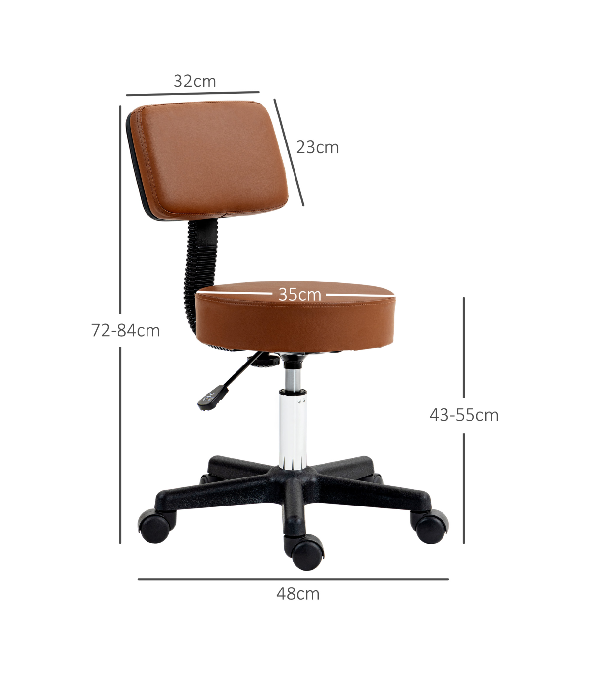 ● Height adjustable between 43cm and 55cm - sit at a level you want ● Suitable for hair salons, beauty parlours, tattoo studios and other similar spaces ● Five wheels to move around easily ● Padded seat and high back for comfort and support ● Maximum load 136kg, easy to assemble ● Brand: HOMCOM - Colour: Brown - Materials: PU leather, sponge, steel and nylon - Dimensions: 72-84 x Φ48cm Seat: 43-55H x 8Dcm - Weight capacity: 136kg - Custom label: 503-023V70BN