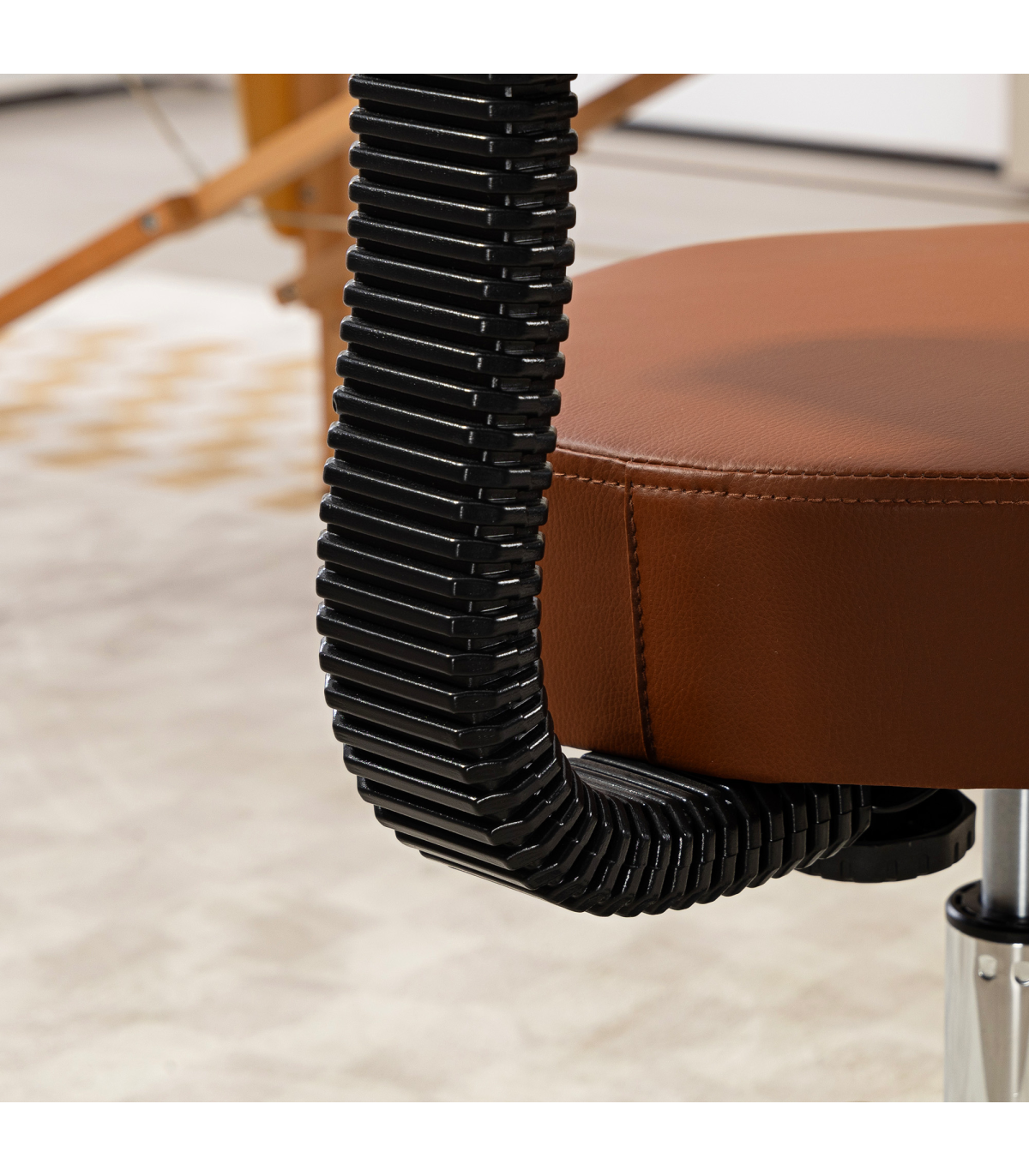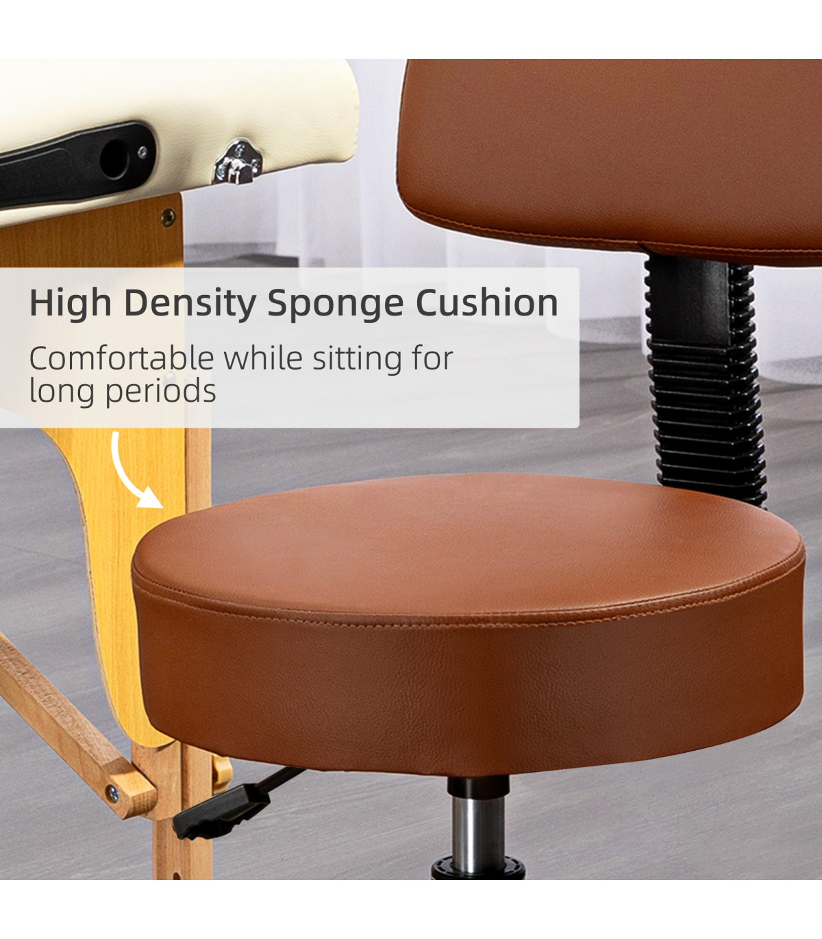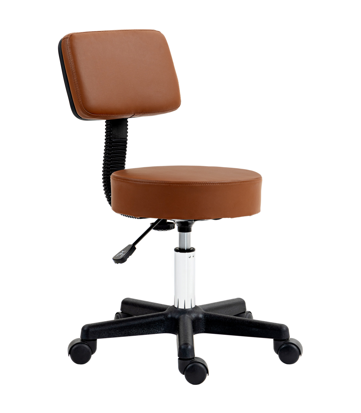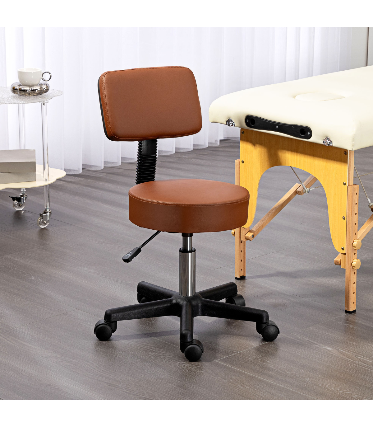 ● Height adjustable between 43cm and 55cm - sit at a level you want ● Suitable for hair salons, beauty parlours, tattoo studios and other similar spaces ● Five wheels to move around easily ● Padded seat and high back for comfort and support ● Maximum load 136kg, easy to assemble ● Brand: HOMCOM - Colour: Brown - Materials: PU leather, sponge, steel and nylon - Dimensions: 72-84 x Φ48cm Seat: 43-55H x 8Dcm - Weight capacity: 136kg - Custom label: 503-023V70BN
