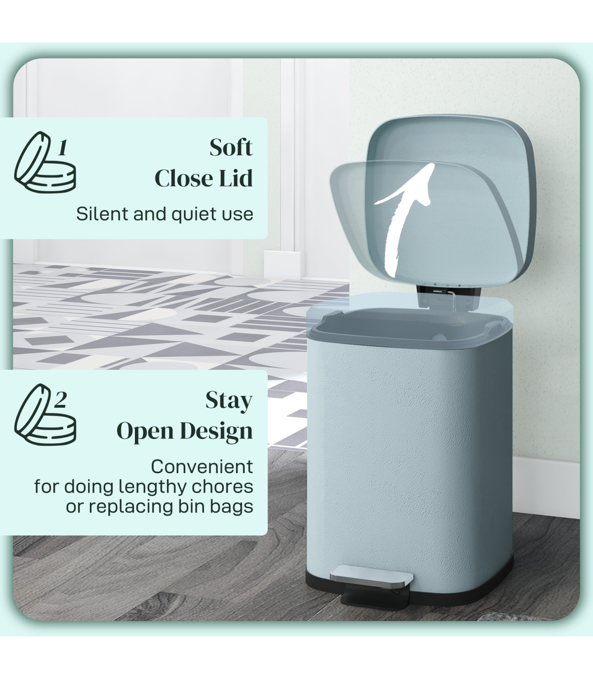 ● Silent soft-close and stay-open lid, foot pedal for easy opening