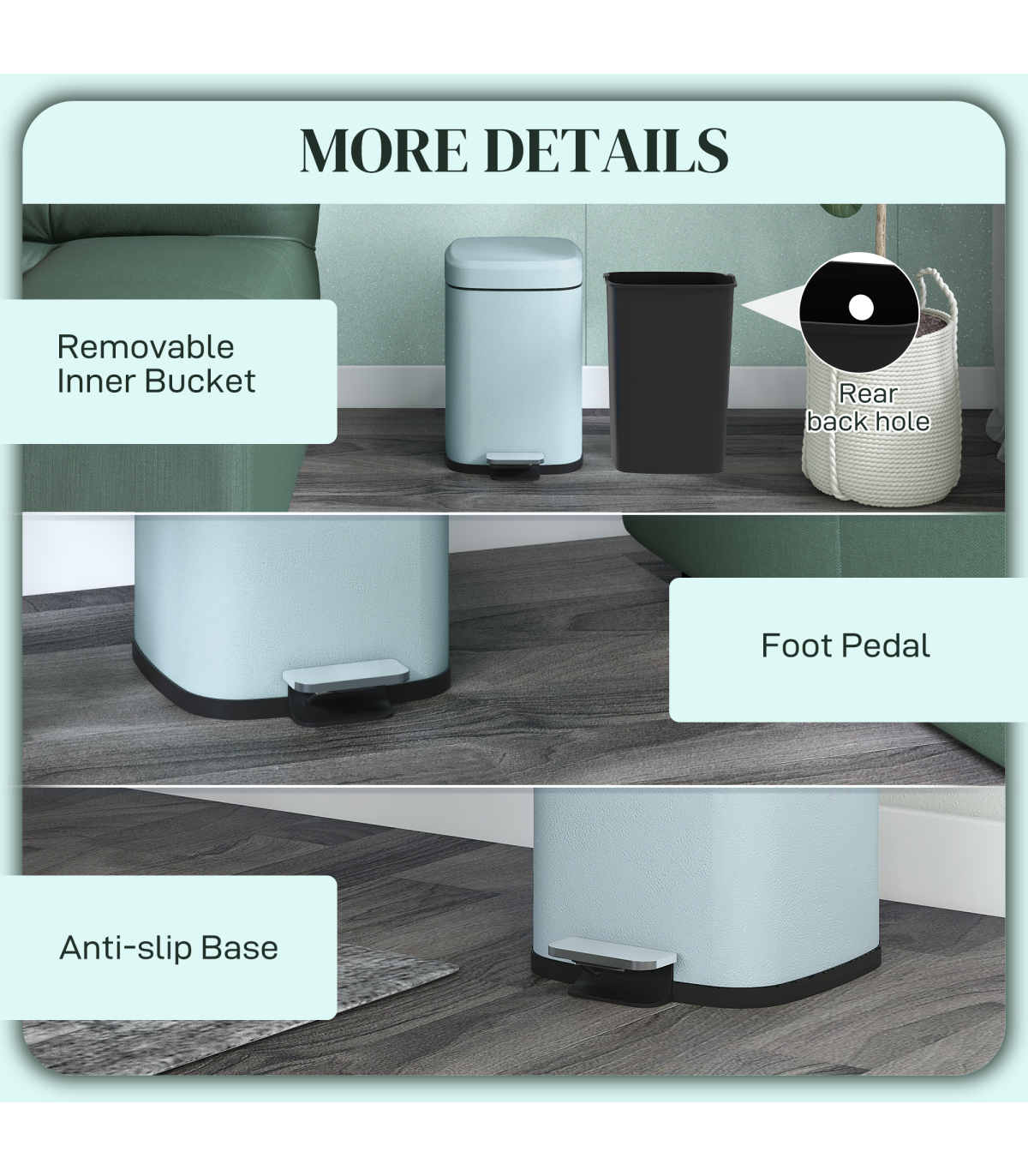 ● Removable bucket design, with a hole to fix bin bag for easy cleaning