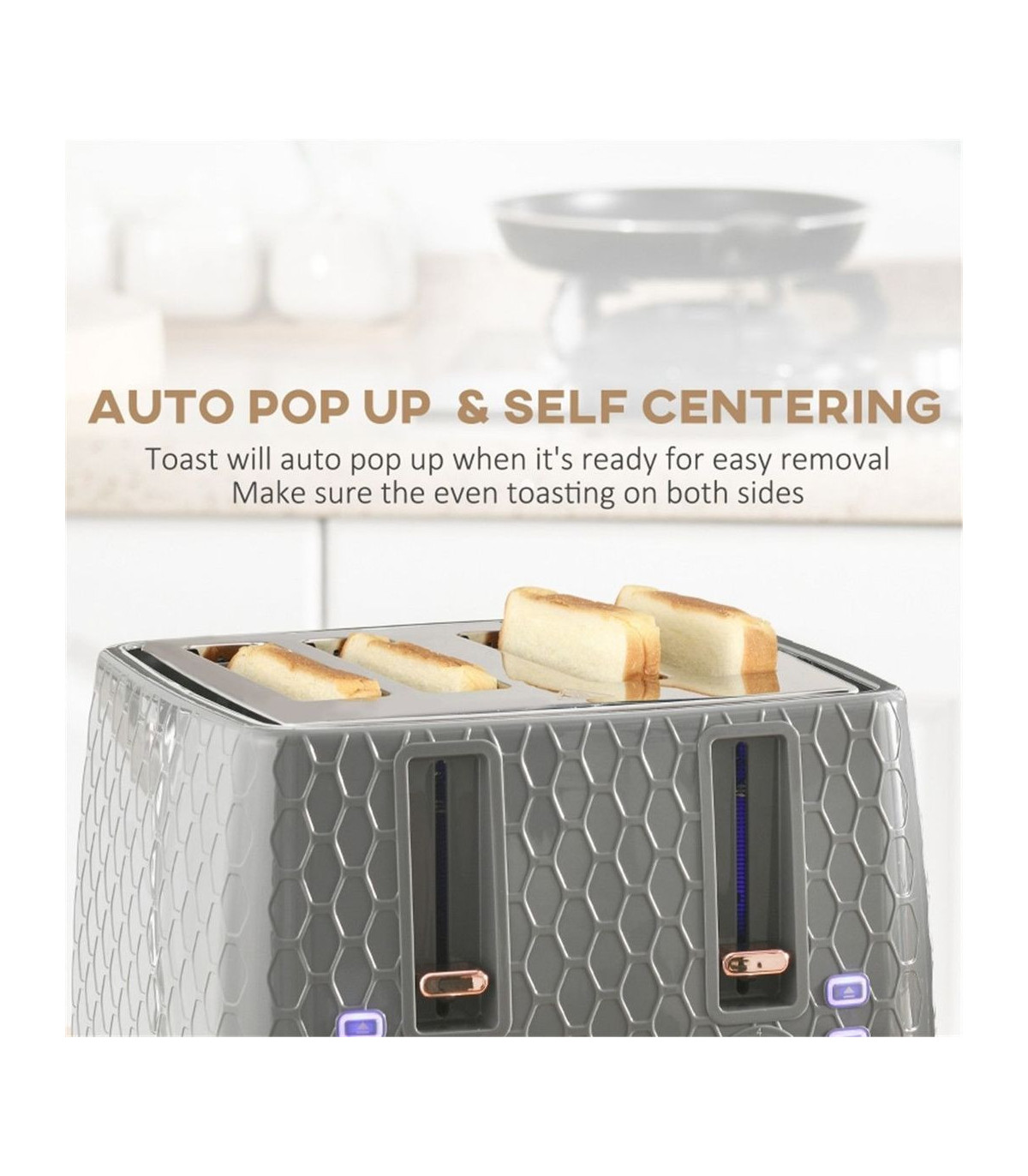- Your toast will automatically pop up when it's ready and auto-centring setting for even toasting result