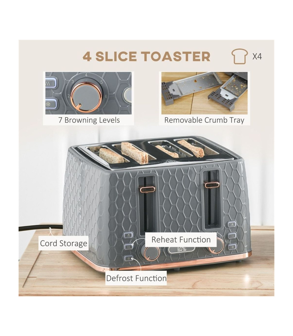 - Crumb tray on toaster for easy cleaning
