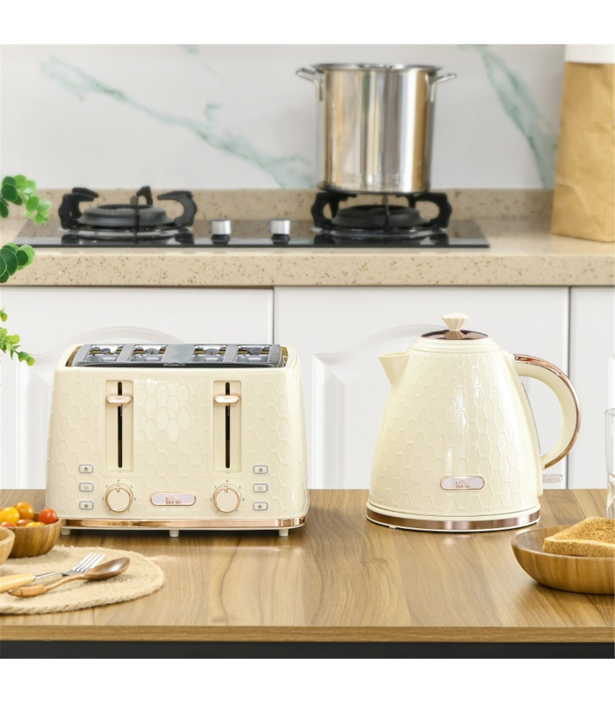 - 1.7L fast boil kettle and matching four-slice toaster. Stylish honeycomb design