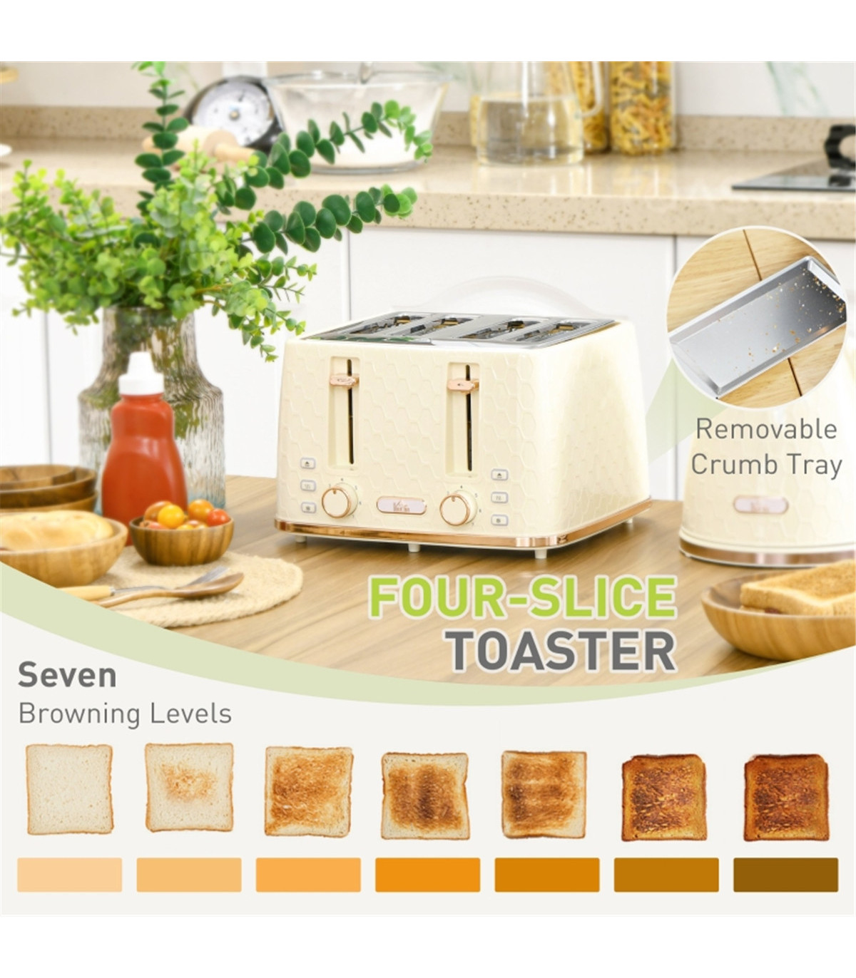- Crumb tray on toaster for easy cleaning