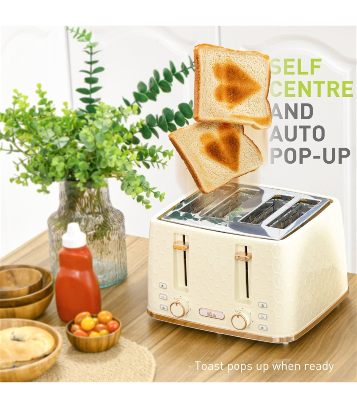 - Your toast will automatically pop up when it's ready and auto-centring setting for even toasting result