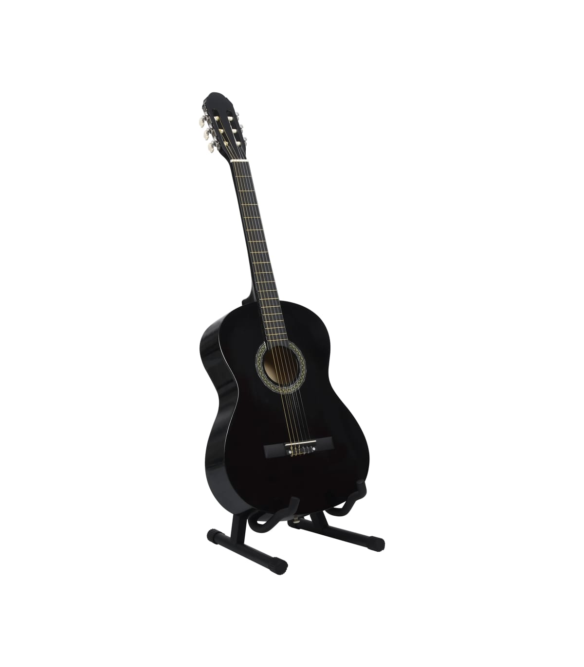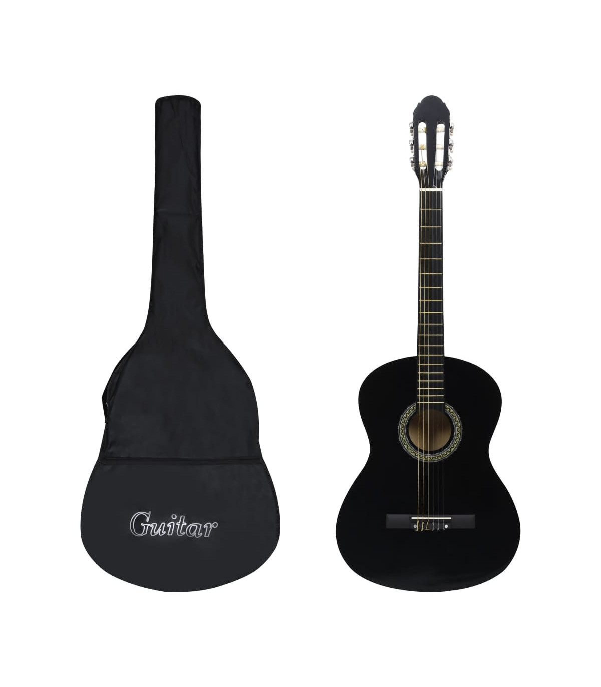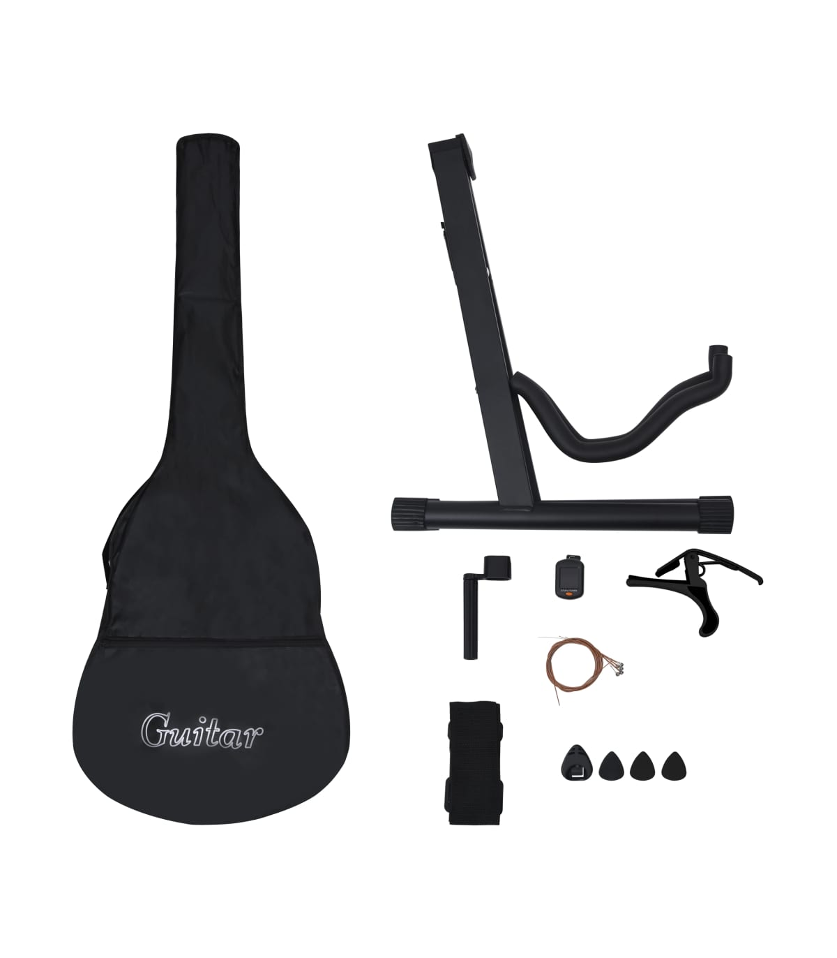 Our classical guitar is a great instrument for beginners, amateurs and any level musicians. In addition to a guitar, the pack comes with a guitar bag, strap, picks, pick holder, guitar string set, string crank, capo, chromatic tuner and guitar holder. This guitar is made of solid basswood with hard plastic buttons and fingerboard. The excellent sound quality and beautiful classic design make it very valuable. With a scale of 65 cm, this guitar has everything you need to become the next guitar player. The tuner can help tune the guitar strings better, while the capo can help to adjust the tone of the guitar. The 3 picks are used for plucking strings and can be put in the pick holder. It is usually a substitute for the fingers, but it can also be played with fingers together. The string crank, as a useful tool, makes the process of replacing strings easier. The included bag with a strap is perfect for traveling musicians and easy storage. Additionally, you can place your guitar in the guitar holder, which is very convenient. Our guitar set is easy to assemble.