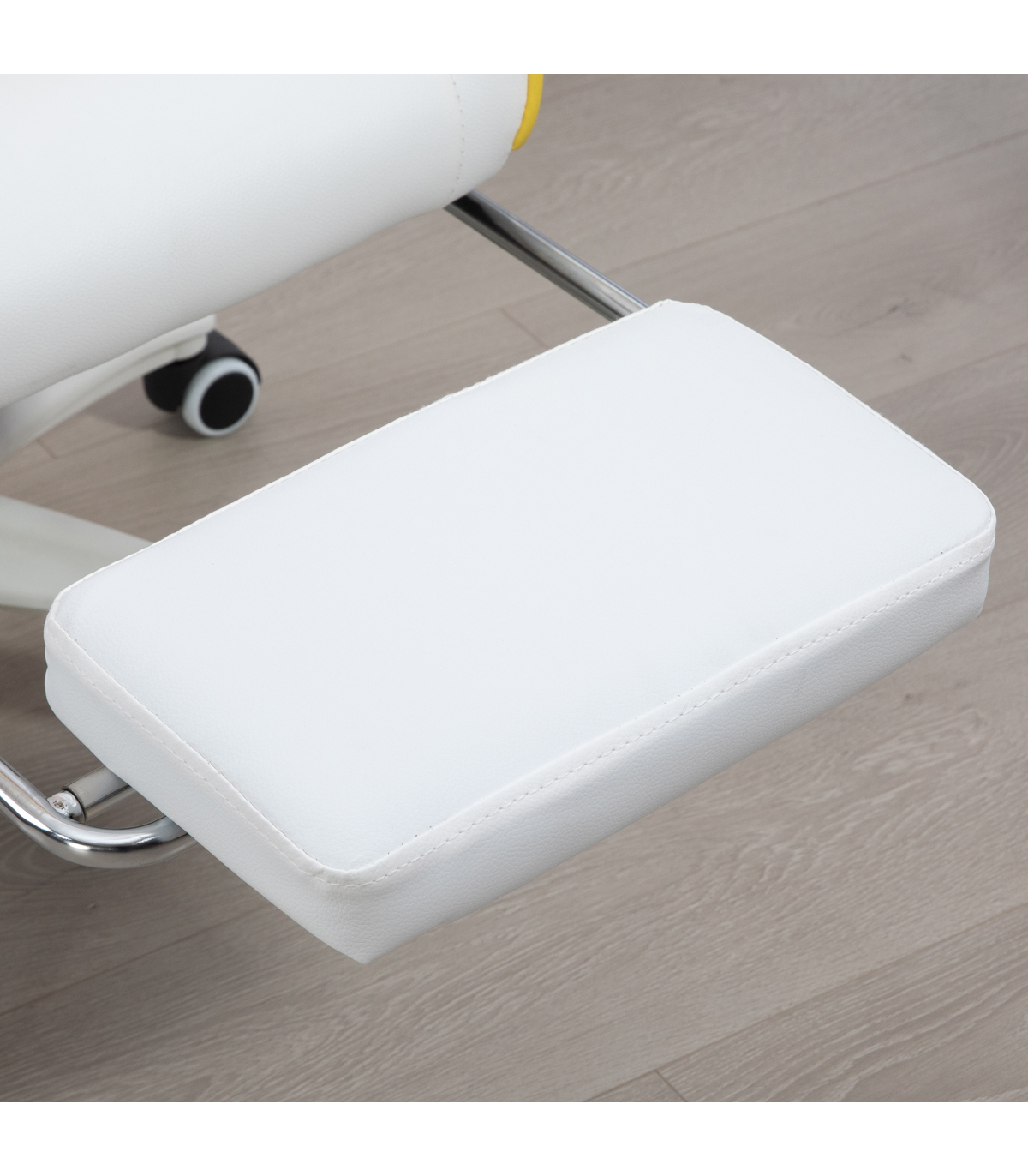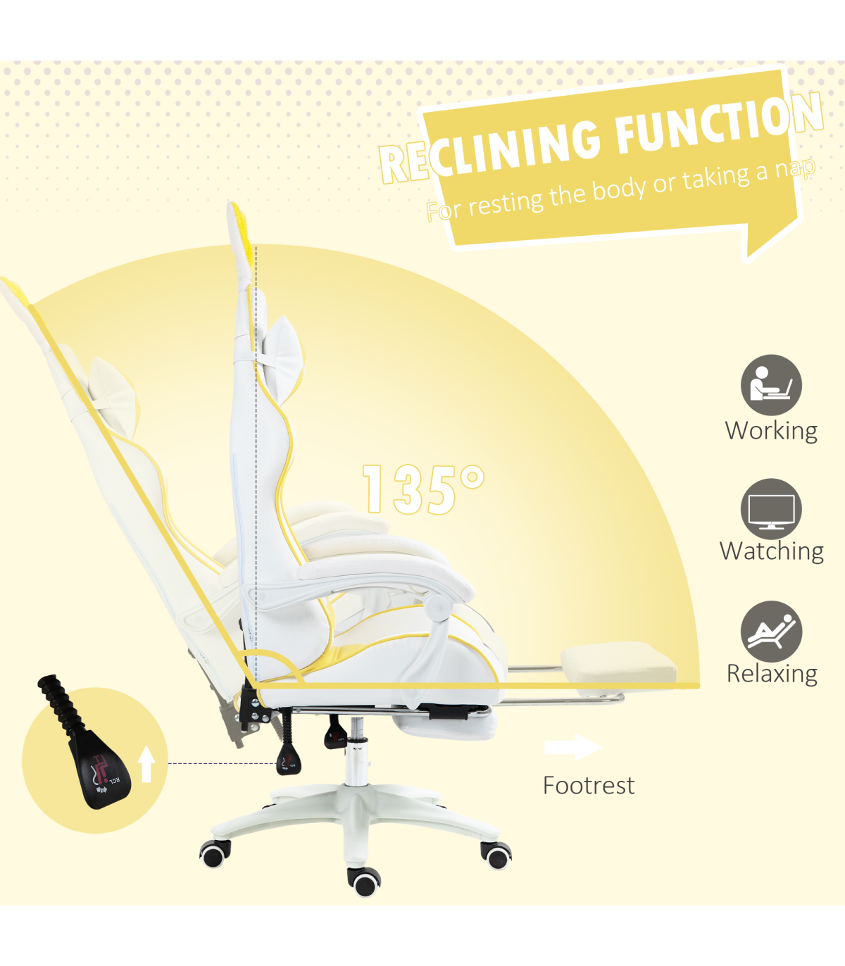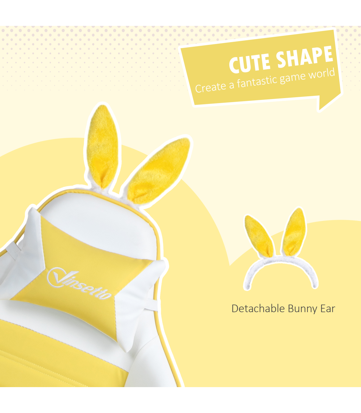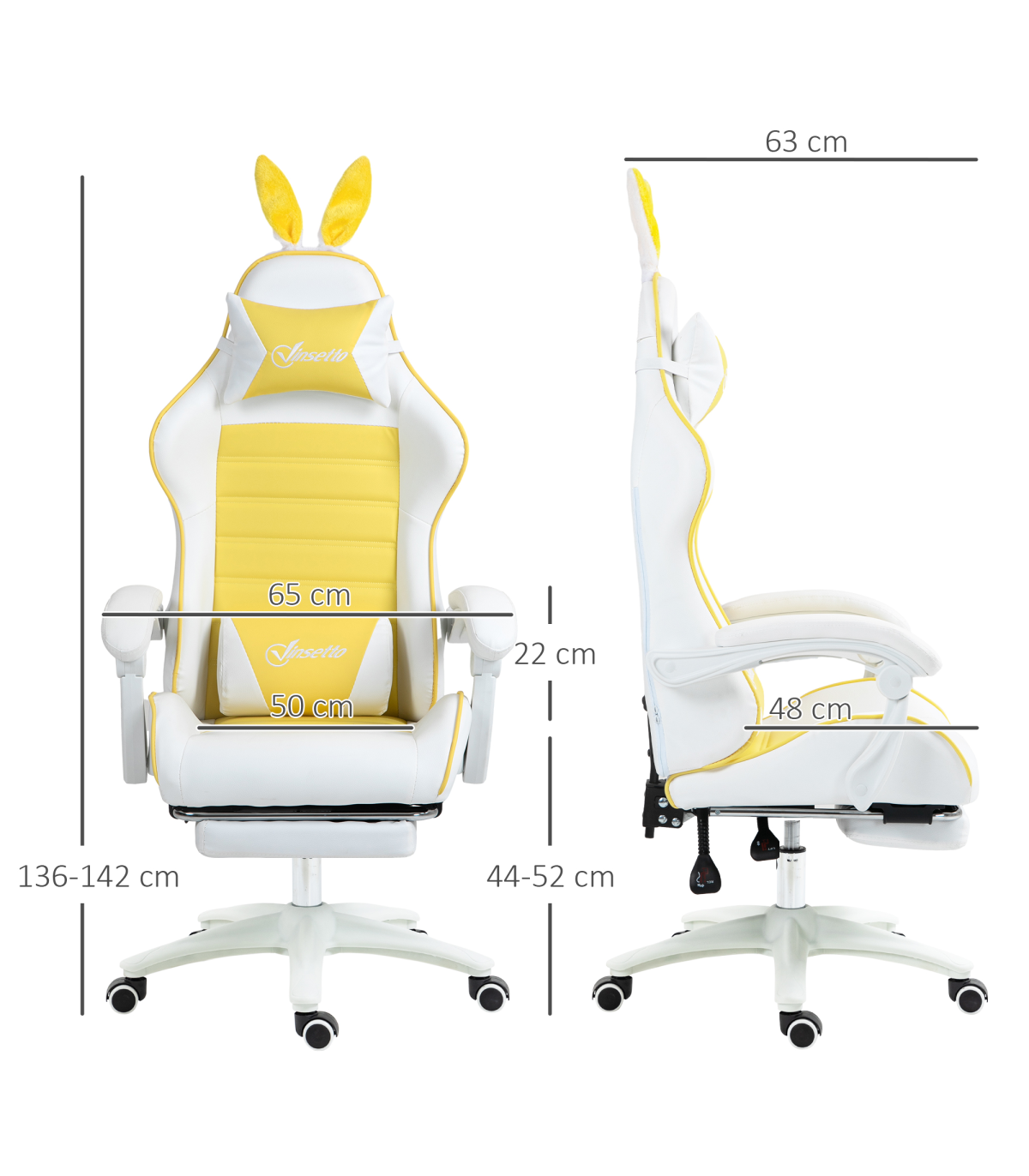 ● Cute design, with bunny ears on the top; ● 135° reclining back - lean back at an angle you want. Manual footrest to elevate lower body; ● 44-52cm adjustable height; ● Removable head and lumbar pillow included; ● Faux leather upholstery in a stylish colour black design; ● Five wheels and swivel seat works with your body movements; ● Maximum load 120kg, assembly required; ● Colour: Yellow, White; ● Materials: PU Leather, Sponge, Nylon, Steel; ● Overall Dimensions: 65W x 63D x 136-142H cm; ● Reclining Dimensions: 65W x 150D x 117H cm; ● Max Recline Angle: 135°; ● Seat Size: 50W x 48D x 44-52H cm; ● Armrest Height (to seat): 22H cm; ● Backrest Size: 80L x 55W x 5D cm; ● Lumbar Support Size: 30L x 19W x 8D cm; ● Headrest Size: 28L x 19W x 10D cm; ● Footrest Size: 34L x 21W x 6D cm; ● Weight Capacity: 120 kg; ● Item Label: 921-621V71YL;