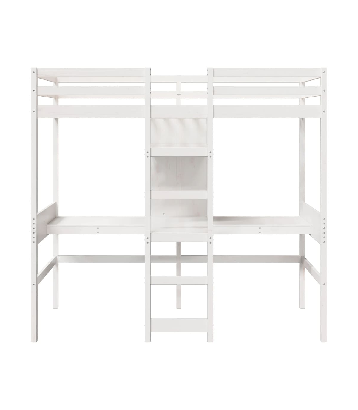 This versatile loft bed integrates a single bed with desks and shelves, providing a cosy sleeping space, a spacious work area, and an effective storage solution. It is an ideal choice for homes with limited space. Stable and long-lasting frame: Solid pinewood is known for its strength and durability. Its straight grains and distinctive knots contribute to its rustic charm. Maximise space utilisation: This bed frame features two desks and two shelves underneath, effectively utilising the under-bed space to provide ample storage for daily items while creating a cosy space for working and studying. It is an ideal choice for smaller or more confined areas. Easy to climb up and down: This bed frame features a built-in ladder, providing convenient access for users to climb up and down. Guardrails for enhanced safety: This bed frame is equipped with guardrails to prevent you from falling out of bed while sleeping. Slatted base for optimal support: The bed frame is equipped with a slatted base for support and breathability for your mattress. Warning: To prevent it from tipping over, this product must be used with the provided wall attachment device. Good to know: A mattress is not included with this bed. We do offer a various selection of mattresses. You can check our shop for a matching mattress. Screws and plugs for inside the wall are not included. We advise to find and use screws and plugs suitable specifically for your walls. If you're not sure, you can consult with a professional. Please read and follow each step of the instructions.