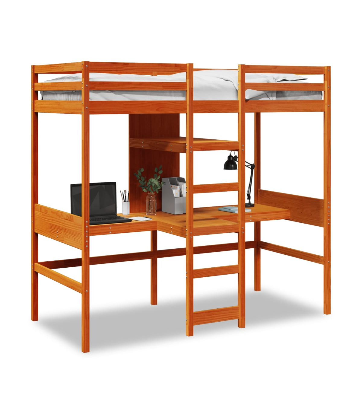 This versatile loft bed integrates a single bed with desks and shelves, providing a cosy sleeping space, a spacious work area, and an effective storage solution. It is an ideal choice for homes with limited space. Stable and long-lasting frame: Solid pinewood is known for its strength and durability. Its straight grains and distinctive knots contribute to its rustic charm. Maximise space utilisation: This bed frame features two desks and two shelves underneath, effectively utilising the under-bed space to provide ample storage for daily items while creating a cosy space for working and studying. It is an ideal choice for smaller or more confined areas. Easy to climb up and down: This bed frame features a built-in ladder, providing convenient access for users to climb up and down. Guardrails for enhanced safety: This bed frame is equipped with guardrails to prevent you from falling out of bed while sleeping. Slatted base for optimal support: The bed frame is equipped with a slatted base for support and breathability for your mattress. Warning: To prevent it from tipping over, this product must be used with the provided wall attachment device. Good to know: A mattress is not included with this bed. We do offer a various selection of mattresses. You can check our shop for a matching mattress. Screws and plugs for inside the wall are not included. We advise to find and use screws and plugs suitable specifically for your walls. If you're not sure, you can consult with a professional. Please read and follow each step of the instructions.