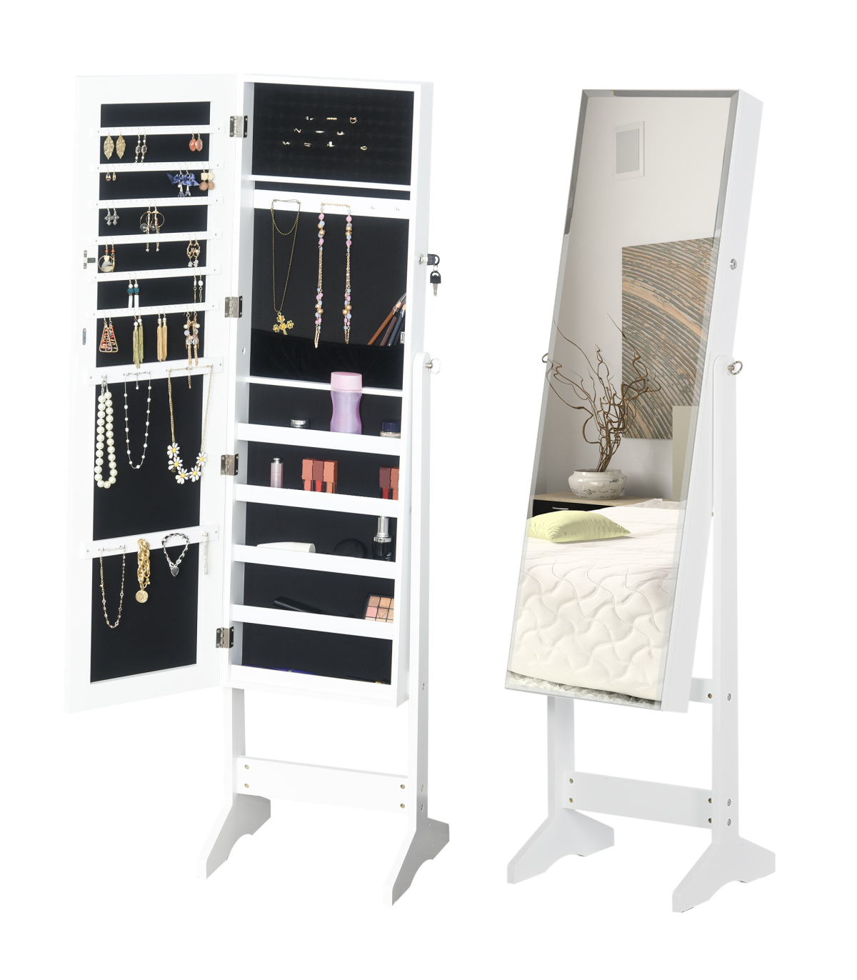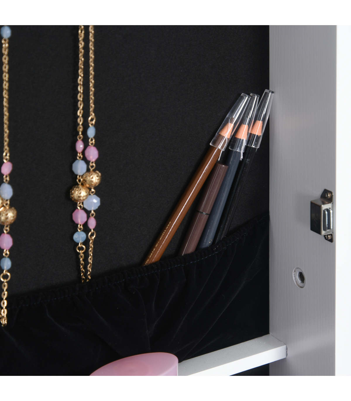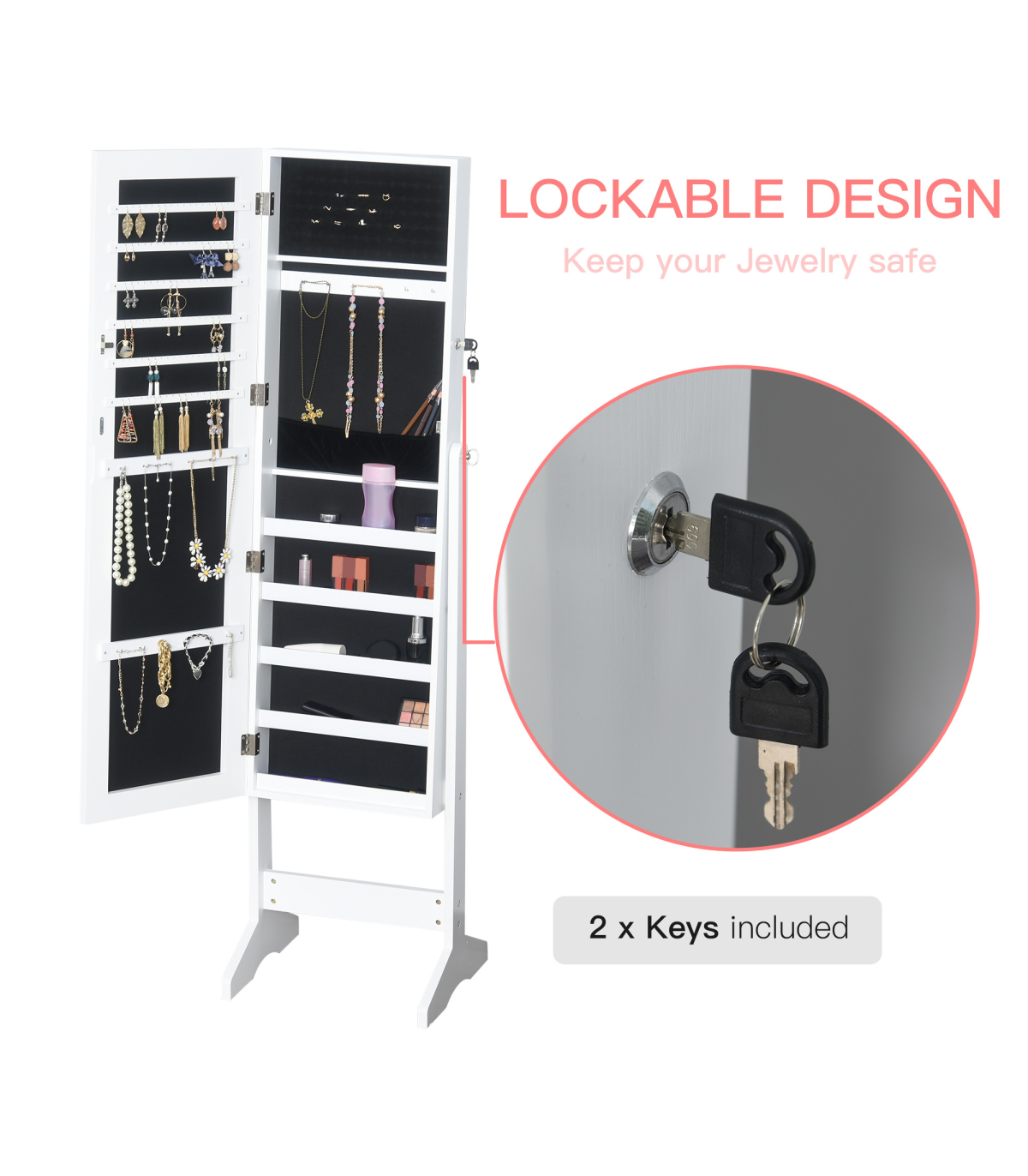 Can be locked for security when you're not around, comes with two keys Magnetic closing on the mirror door for smooth opening and closing