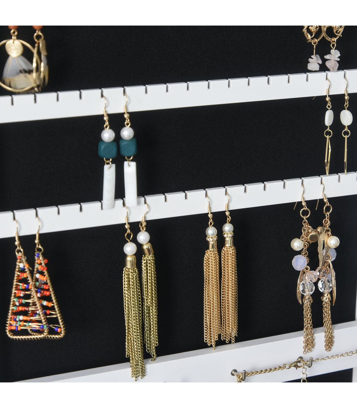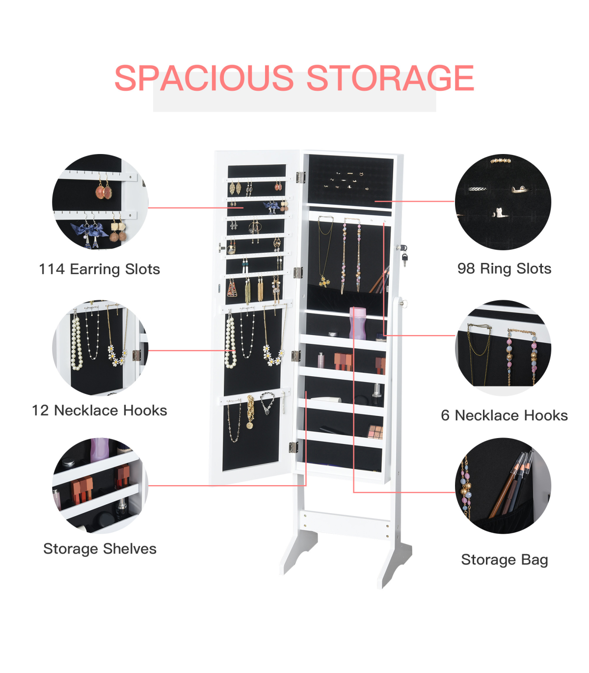 Large inner storage space featuring earring slots, necklace and bracelet hooks, ring slots and shelves