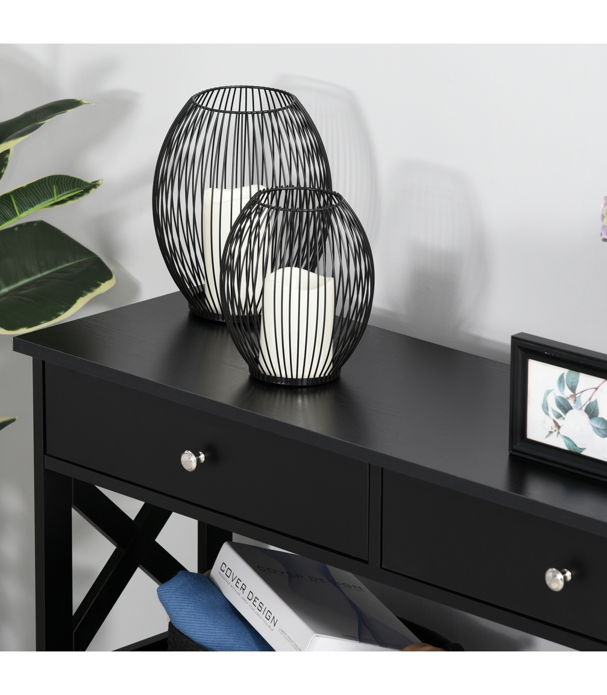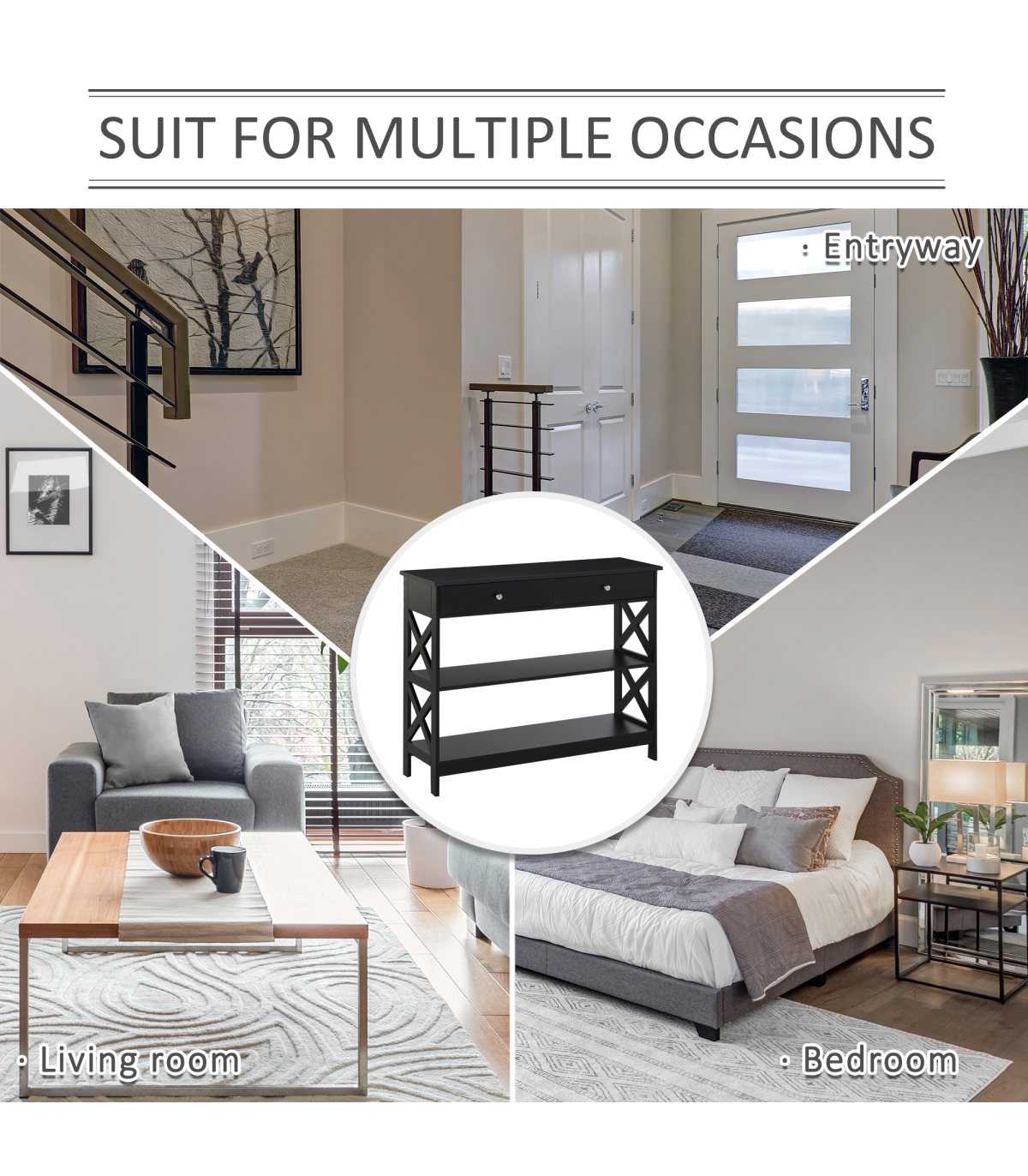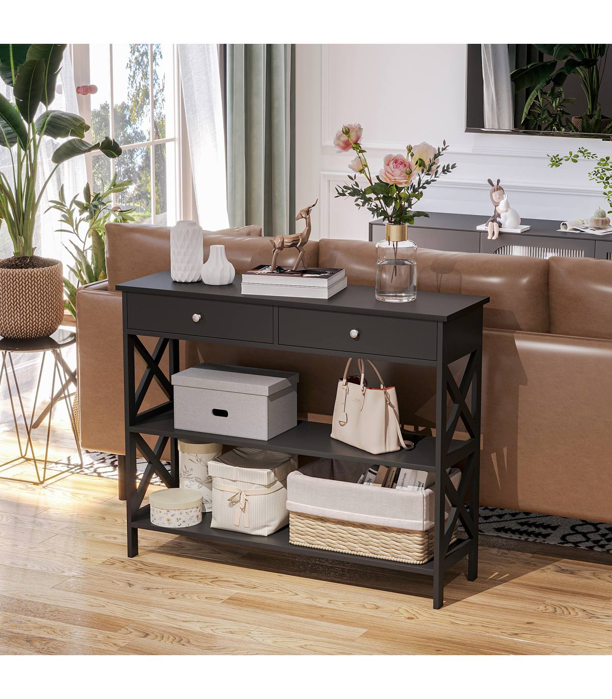 Console Table Side Desk Shelves Drawers Open Top Hallway Black