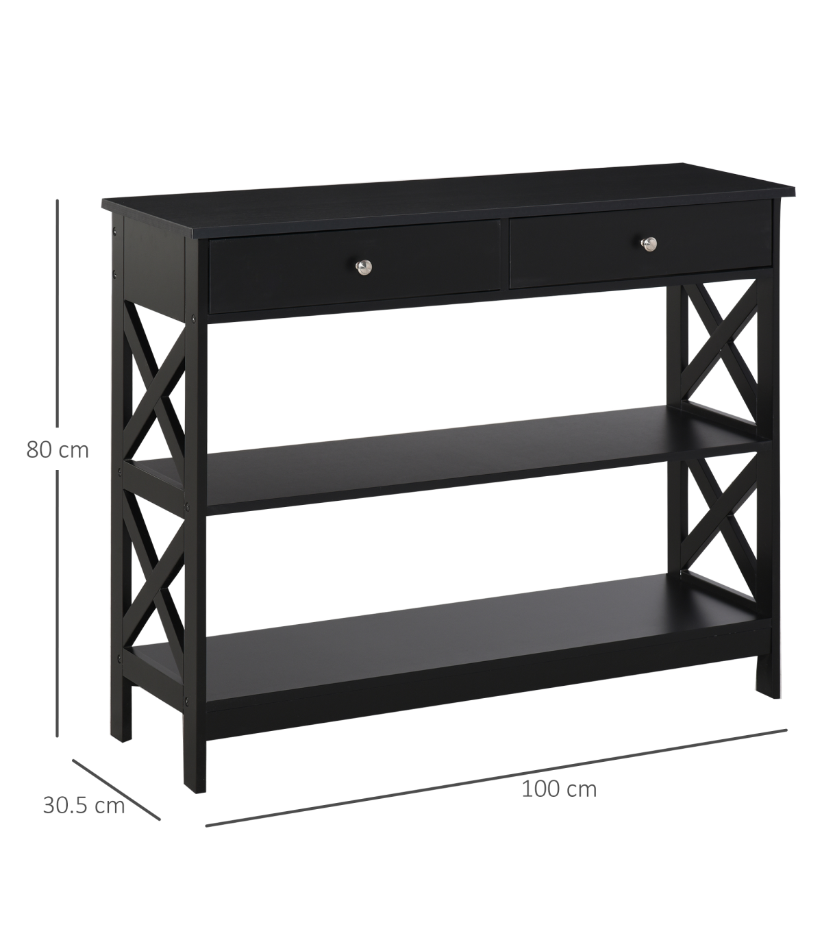 SIMPLE DESIGN: Clean boxy shape in a simple colour finish, suitable for any space in the home and office.TWO DRAWERS AND SHELVES: Easy to keep the surrounding space clean and tidy, with a handle on both drawers to open and close easily. Flat table top for extra holding space.MDF STRUCTURE: A solid structure which firmly stands in place. 'X'bar on each end for extra support.ANTI-TIPPING: Back straps to attach to the wall so unit doesn't fall forwards. DIMENSIONS: 80H x 100L x 30.5Wcm. Drawer: 6.5H x 41L x 24Wcm.MAXIMUM LOAD: Table top: 20kg. Drawer: 5kg. ASSEMBLY REQUIRED.