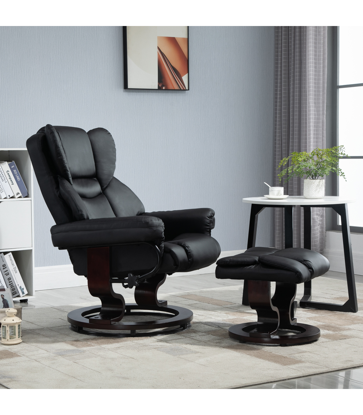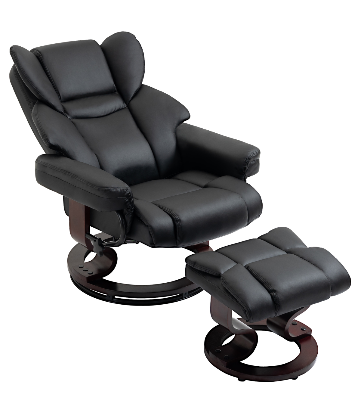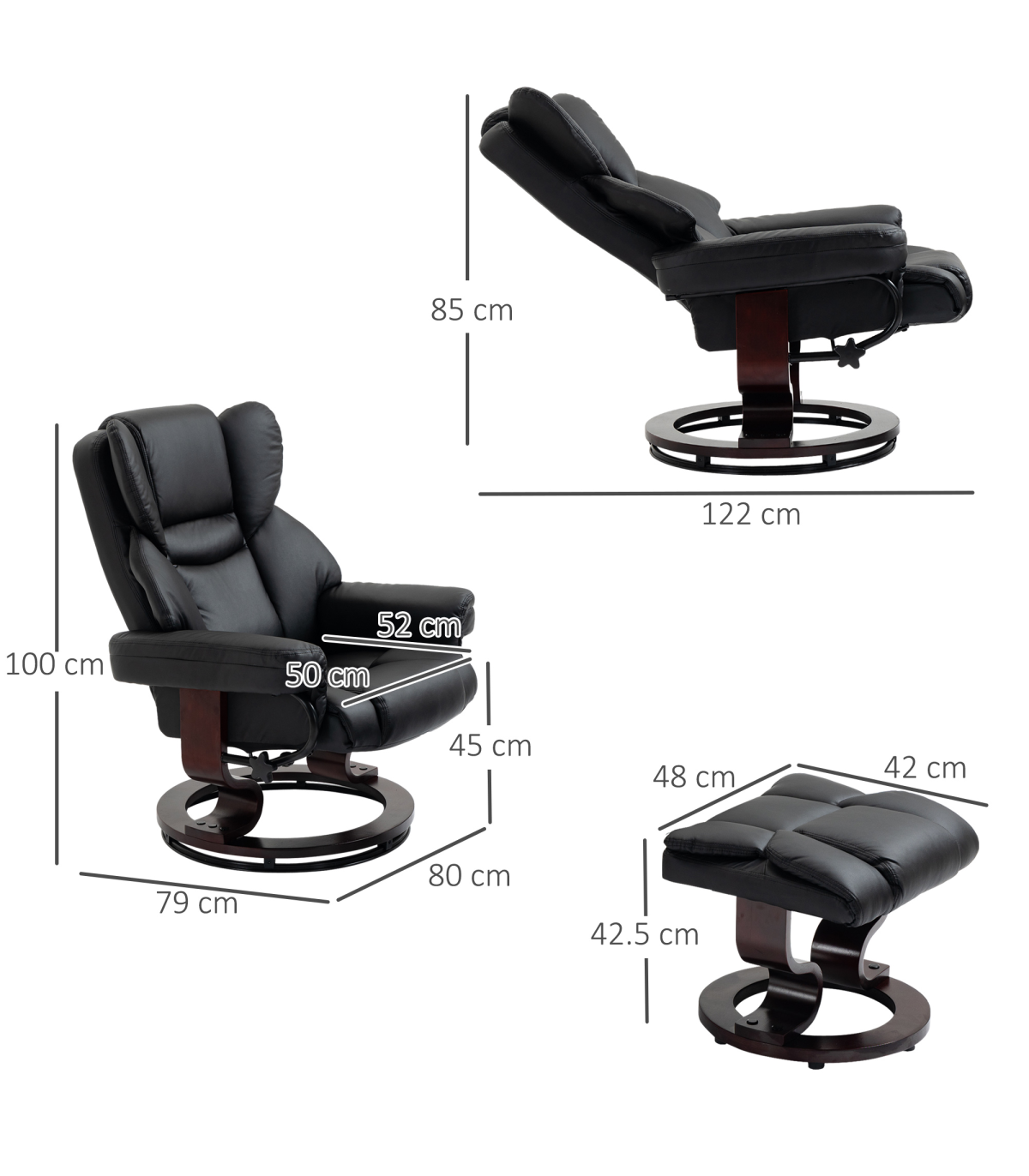 - Padded PU Leather Manual Reclining Armchair Sofa Chair w/ Footstool Black - Description: Recliner chair and footstool duo: The go-to relaxation spot for your home, the recliner armchair pushes back to a 135° angle, with a matching footstool to put your feet up. 360° swivel chair easily rotates in all directions. - Metal frame and bentwood base: Ensures enduring strength, support and structure for a mainstay in your home furniture. - Comfortable: Thick, all-over padding and mid-rise curved armrests for you to sink back in supreme comfort. Faux leather upholstery is smooth and stylish. - Dimensions: - Upright: 100H x 80W x 79Dcm. - Reclined: 85H x 80W x 122Dcm. - Footstool: 42.5H x 48W x 42Dcm. - Maximum load: - Chair: 160kg. - Footstool: 20kg. - Assembly required.
