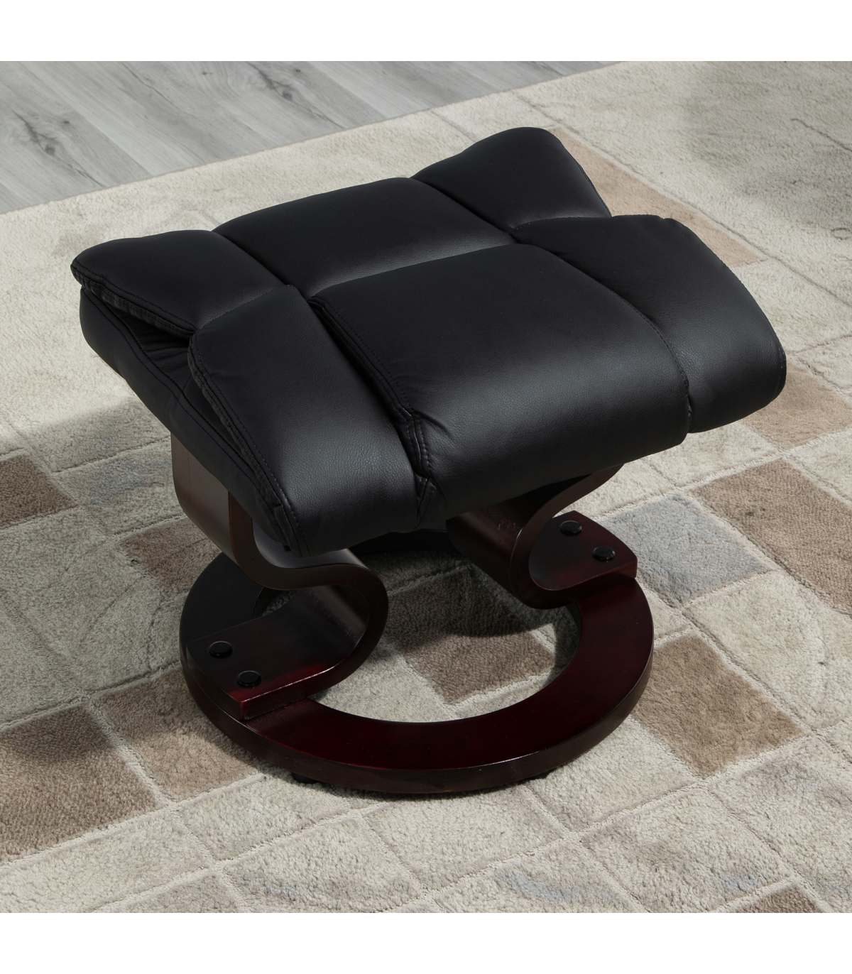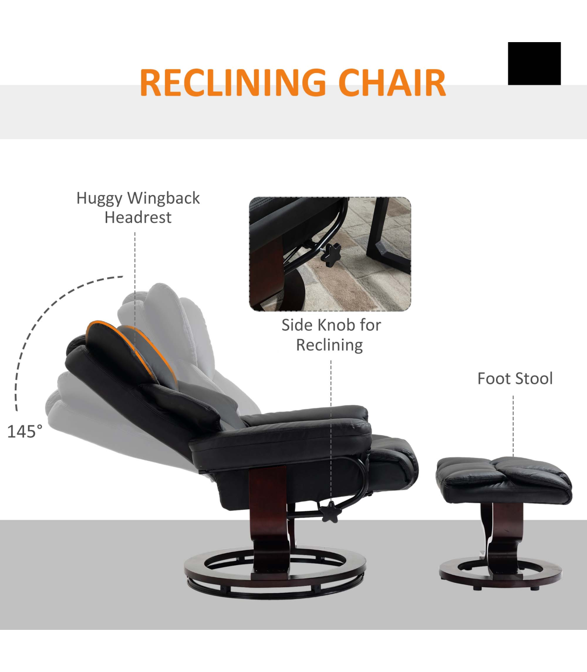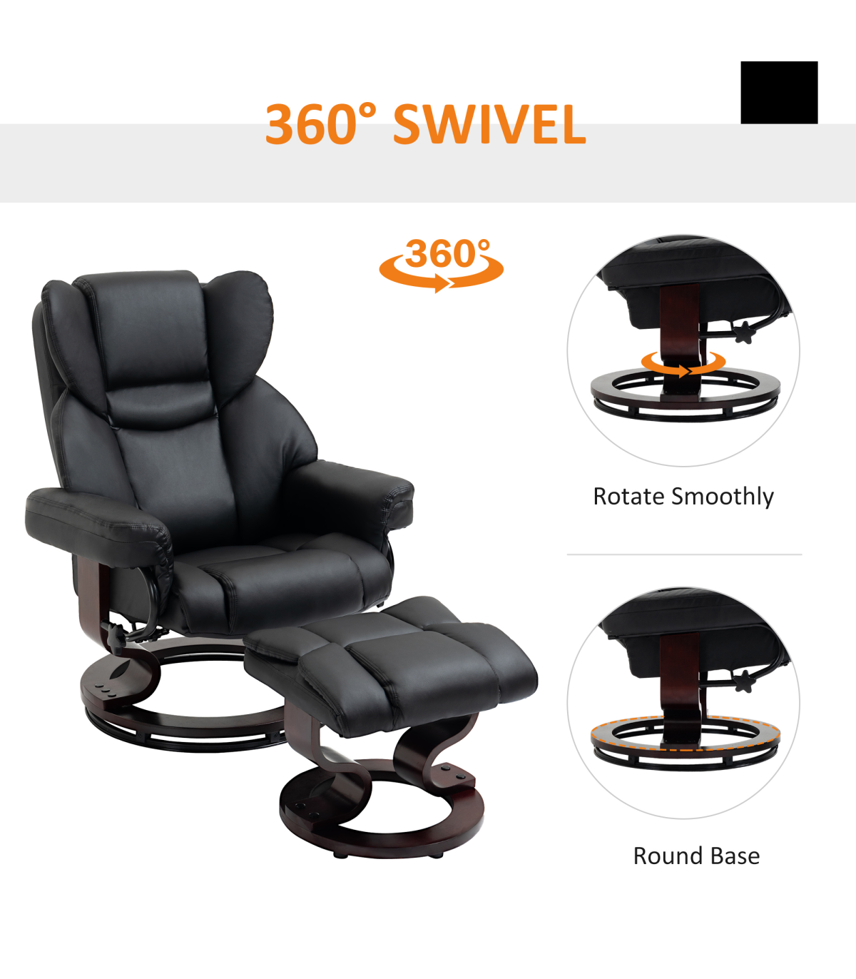 - Padded PU Leather Manual Reclining Armchair Sofa Chair w/ Footstool Black - Description: Recliner chair and footstool duo: The go-to relaxation spot for your home, the recliner armchair pushes back to a 135° angle, with a matching footstool to put your feet up. 360° swivel chair easily rotates in all directions. - Metal frame and bentwood base: Ensures enduring strength, support and structure for a mainstay in your home furniture. - Comfortable: Thick, all-over padding and mid-rise curved armrests for you to sink back in supreme comfort. Faux leather upholstery is smooth and stylish. - Dimensions: - Upright: 100H x 80W x 79Dcm. - Reclined: 85H x 80W x 122Dcm. - Footstool: 42.5H x 48W x 42Dcm. - Maximum load: - Chair: 160kg. - Footstool: 20kg. - Assembly required.