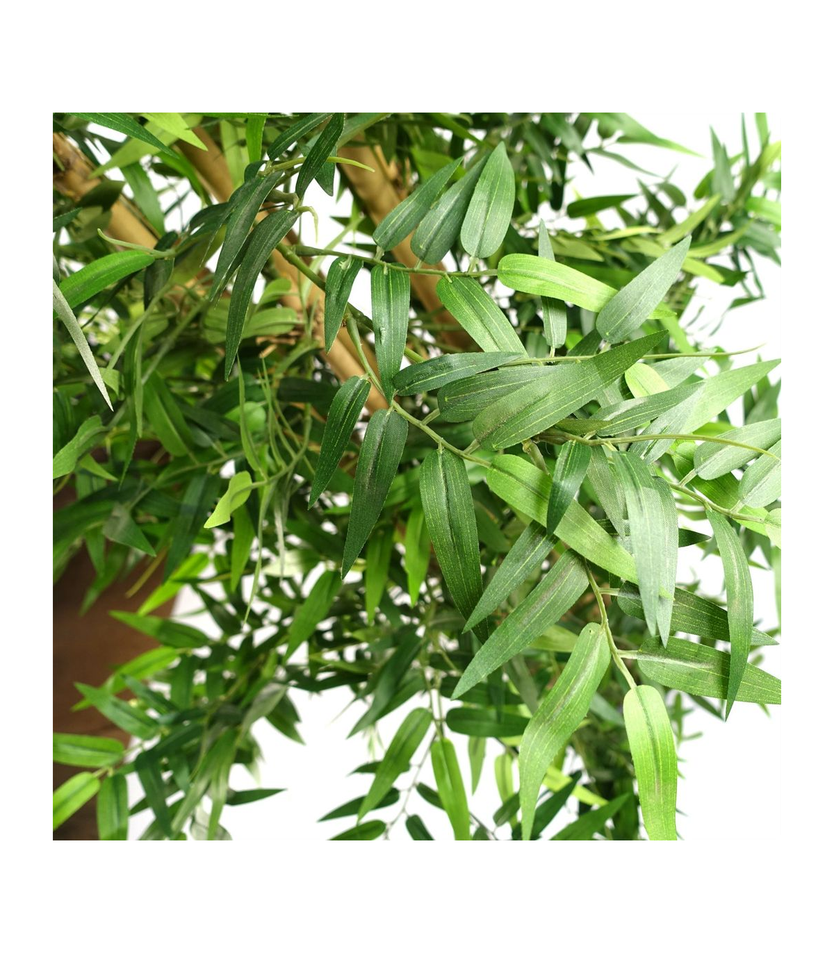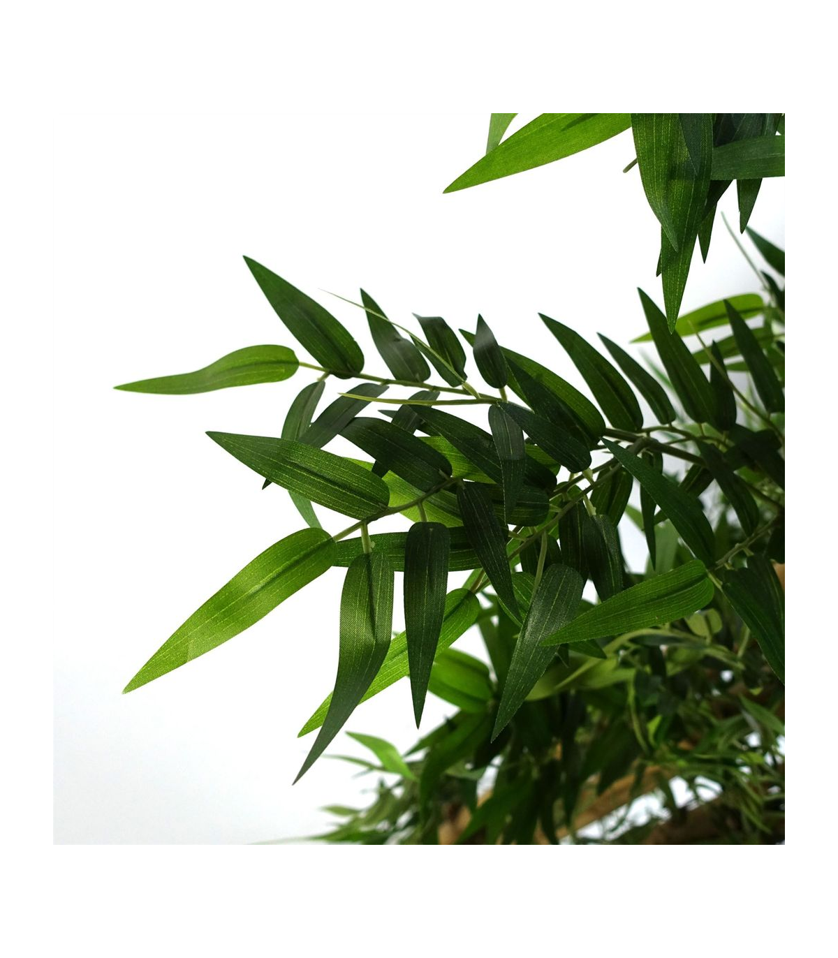 This stunning artificial bamboo tree features lifelike silk leaves and natural, oversised bamboo canes. The dimensions of this exquisite piece are 120cm x 60cm x 60cm, as shown in our photos. The wired branches allow you to customize the shape of the leaves to perfectly fit your space, whether you need it to be more narrow or wider. It comes elegantly potted in a weighted black plastic pot, measuring approximately 18cm (d) x 14cm (h). For a truly luxurious display, place this tree inside a decorative planter and cover the top with gravel or soil to create a breathtaking centerpiece.