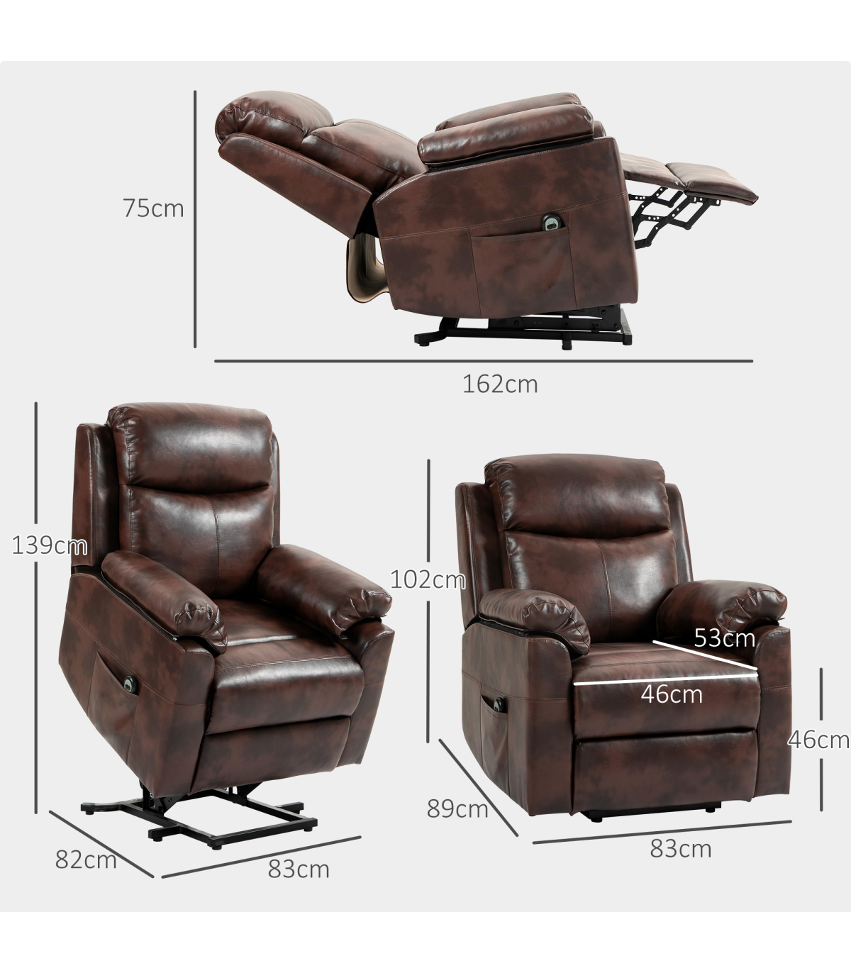 ● Reclining Dimension: 83W x 162D x 75Hcm