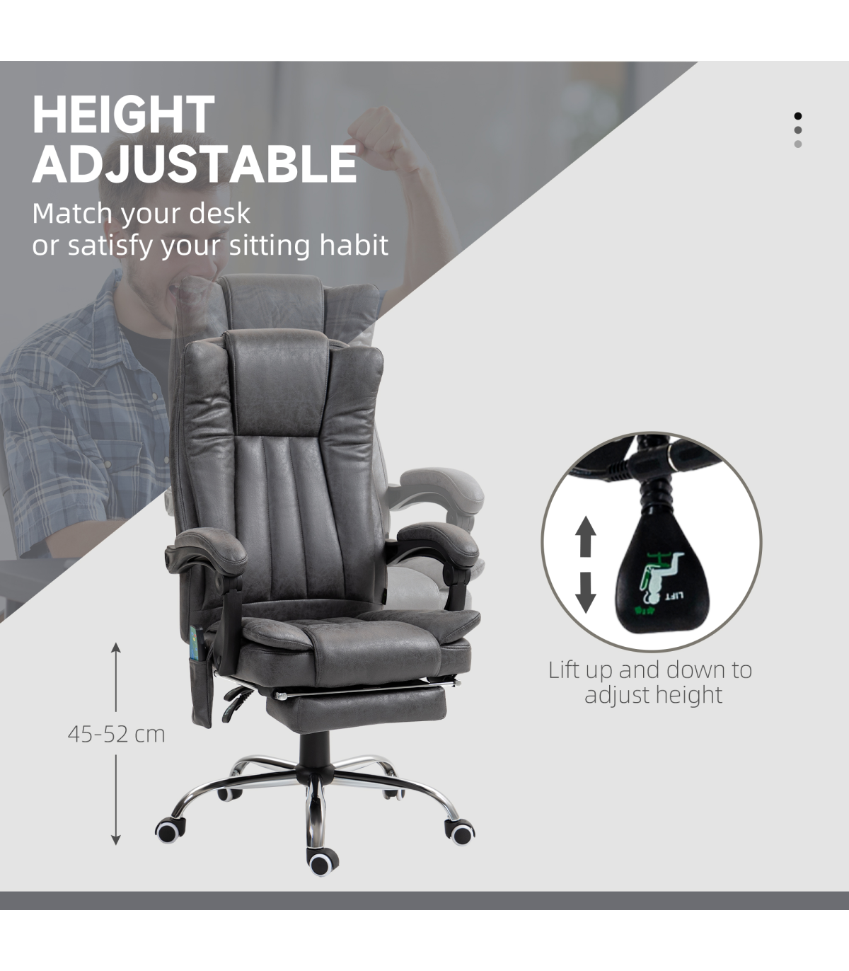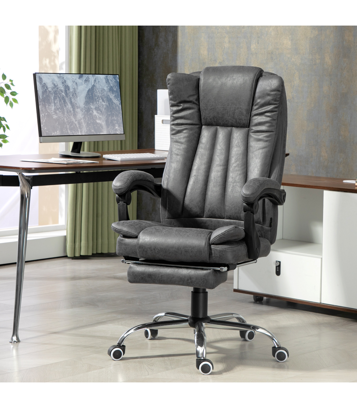 A piece to make your working days comfortable and not so draining: this high back office chair from Vinsetto. The luxurious design consists of thick padded, soft microfibre upholstery, a reclining back, and a manual footrest. The seat height of the computer chair is adjustable for a working level best for you. Finished with five wheels to move around easily.