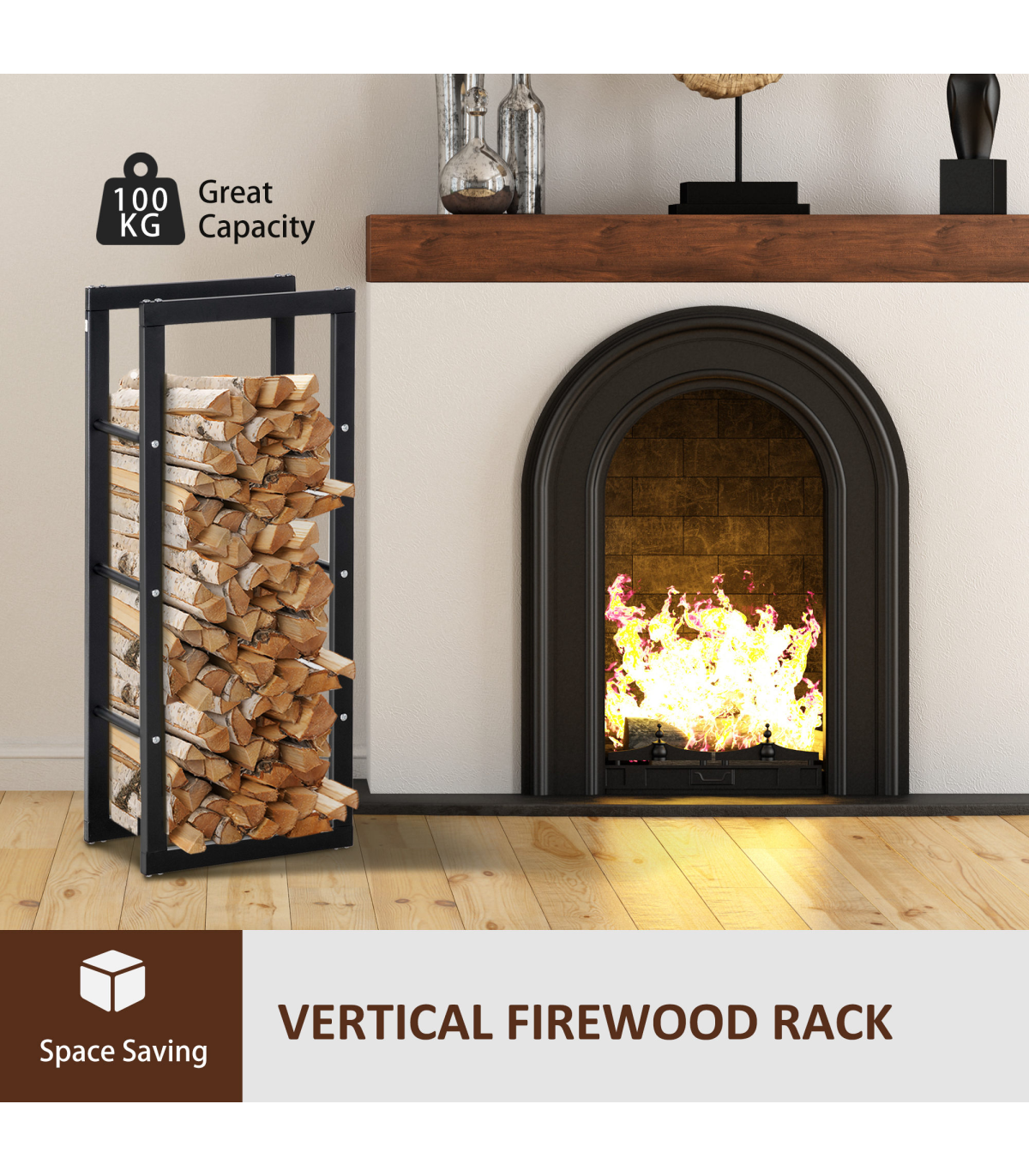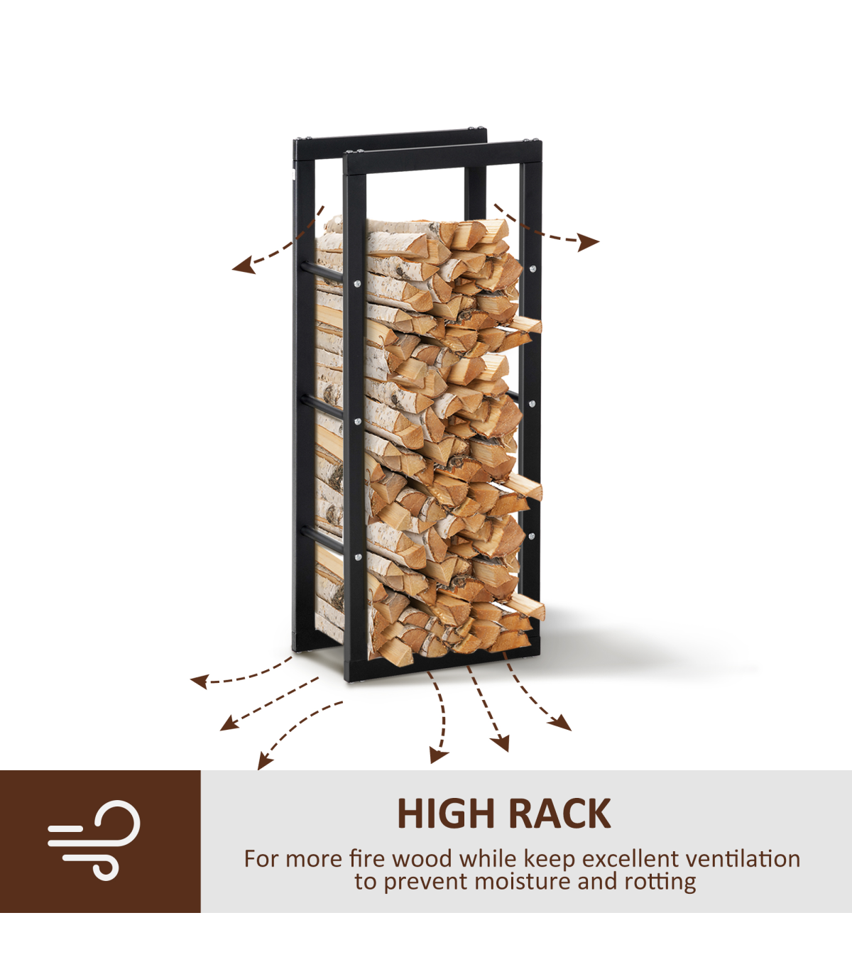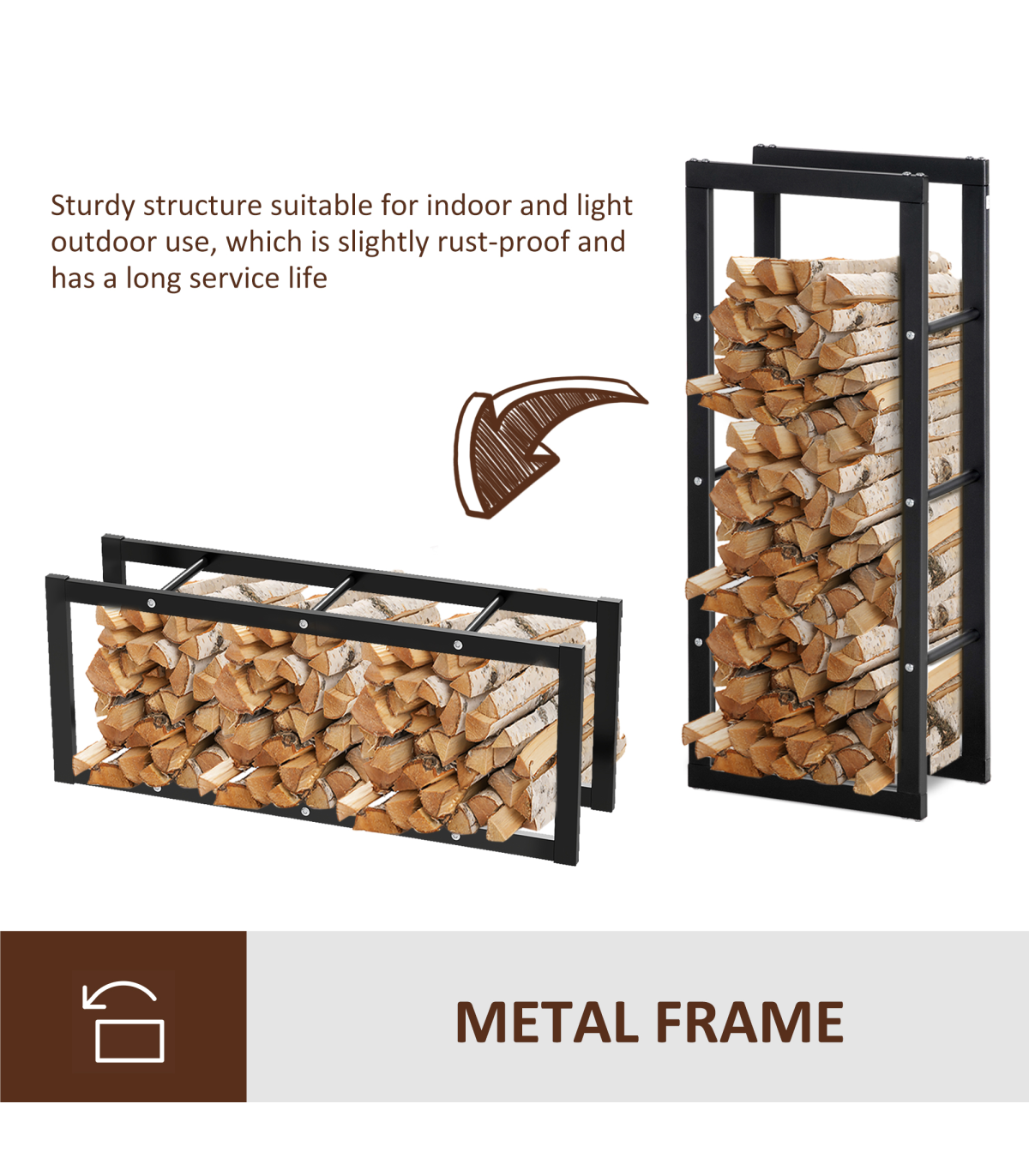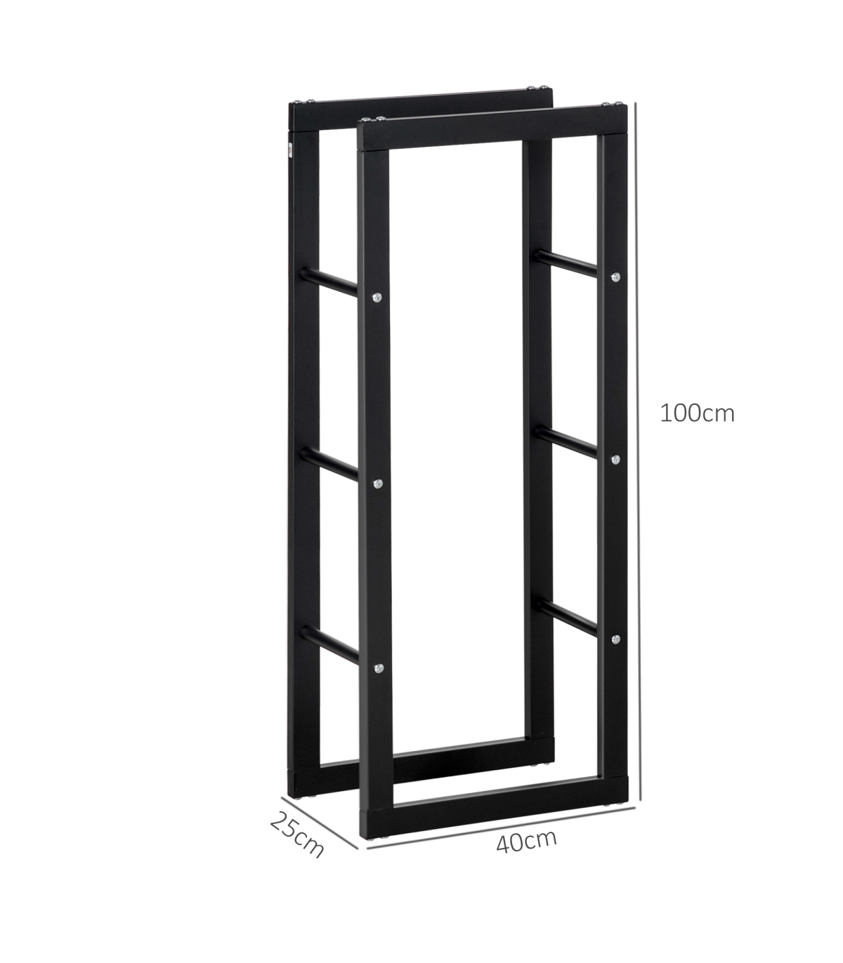 - Metal Rust-Resistant Firewood Log Rack Black Description: - Large design for holding wood up to 100kg, suitable for indoor and light outdoor use - Lifted design, with open sides allowing easy air passage to prevent wood from becoming damp and rotten - Metal frame for a tough and solid structure, resistant to light rusting and damage - Solid base keeps the unit upright and stable, even when full - Assembly required