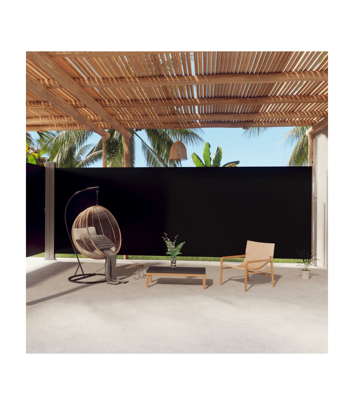 Our garden side awning, featuring a large screen, presents an effective way to deal with a constant wind and low-lying sun, while providing privacy. The simple yet stylish design makes it an ideal complement for your garden, patio, balcony, etc. The privacy screen has an automatic roll-back function and the width is adjustable to up to 600 cm. The outdoor screen is made of UV-proof, tear-resistant and water-resistant polyester fabric with a PU coating. Delivery also includes mounting accessories and 2 posts.