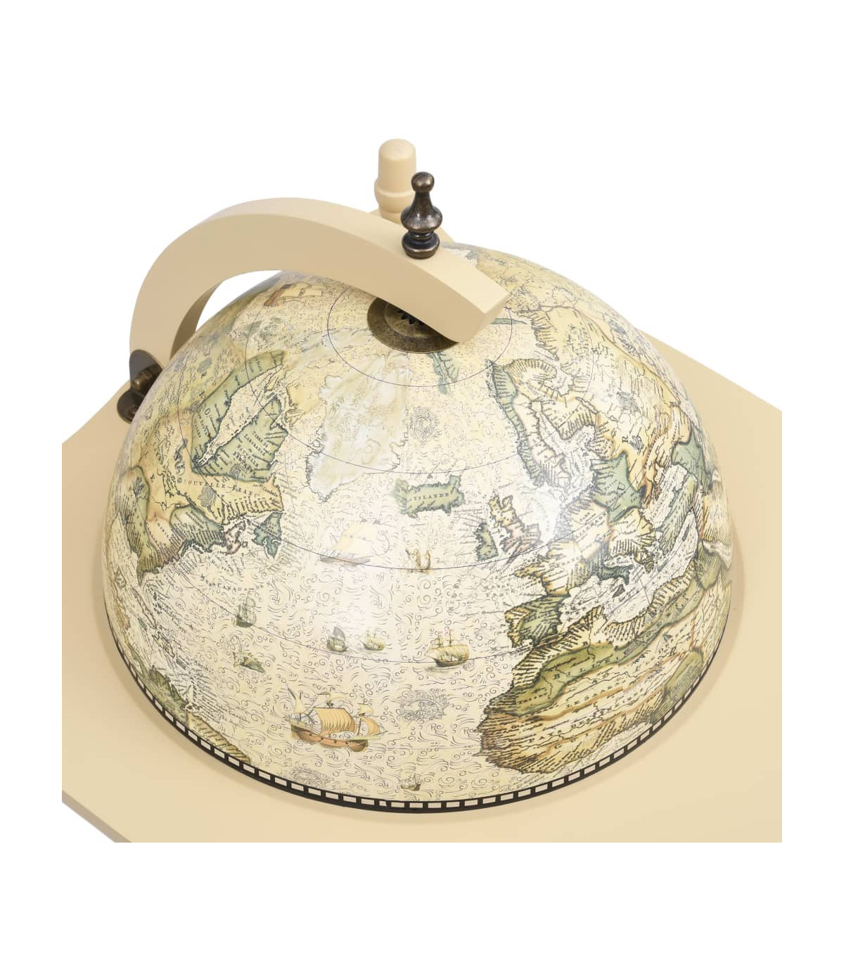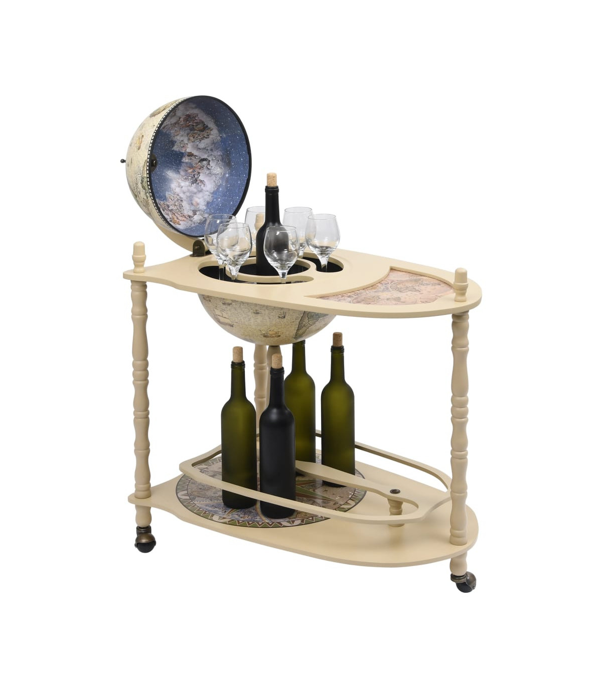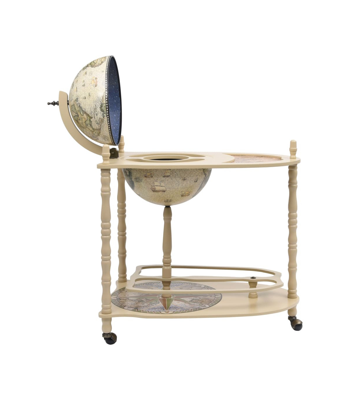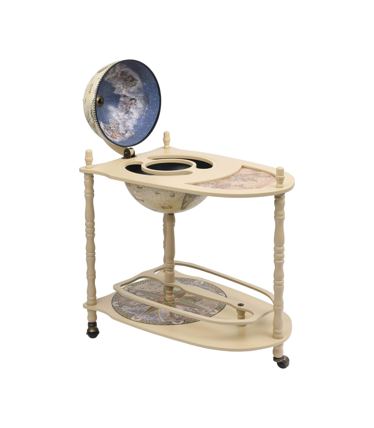 The wooden globe opens to reveal a large bar with plenty of room for wine, spirits, beverage and stemware, thus you are able to display your bottles and glasses in order in hidden space while ensuring easy access. Equipped with extended table and the bottom base, you can also put bottles and stemware on the table or at the bottom base. The outside surface of the bar globe is wrapped with old nautical map, while the table, base and inside of globe are featured renaissance era paintings, making the globe bar cabinet a work of art and a good decoration for home or office. The cabinet is equipped with wheels, making the movement of the cabinet not an awkward task any more. You are able to move the wine cabinet to any corner of your room with ease. This globe bar cabinet with table and wheels is undoubtedly a perfect combination of storage and aesthetic functions.