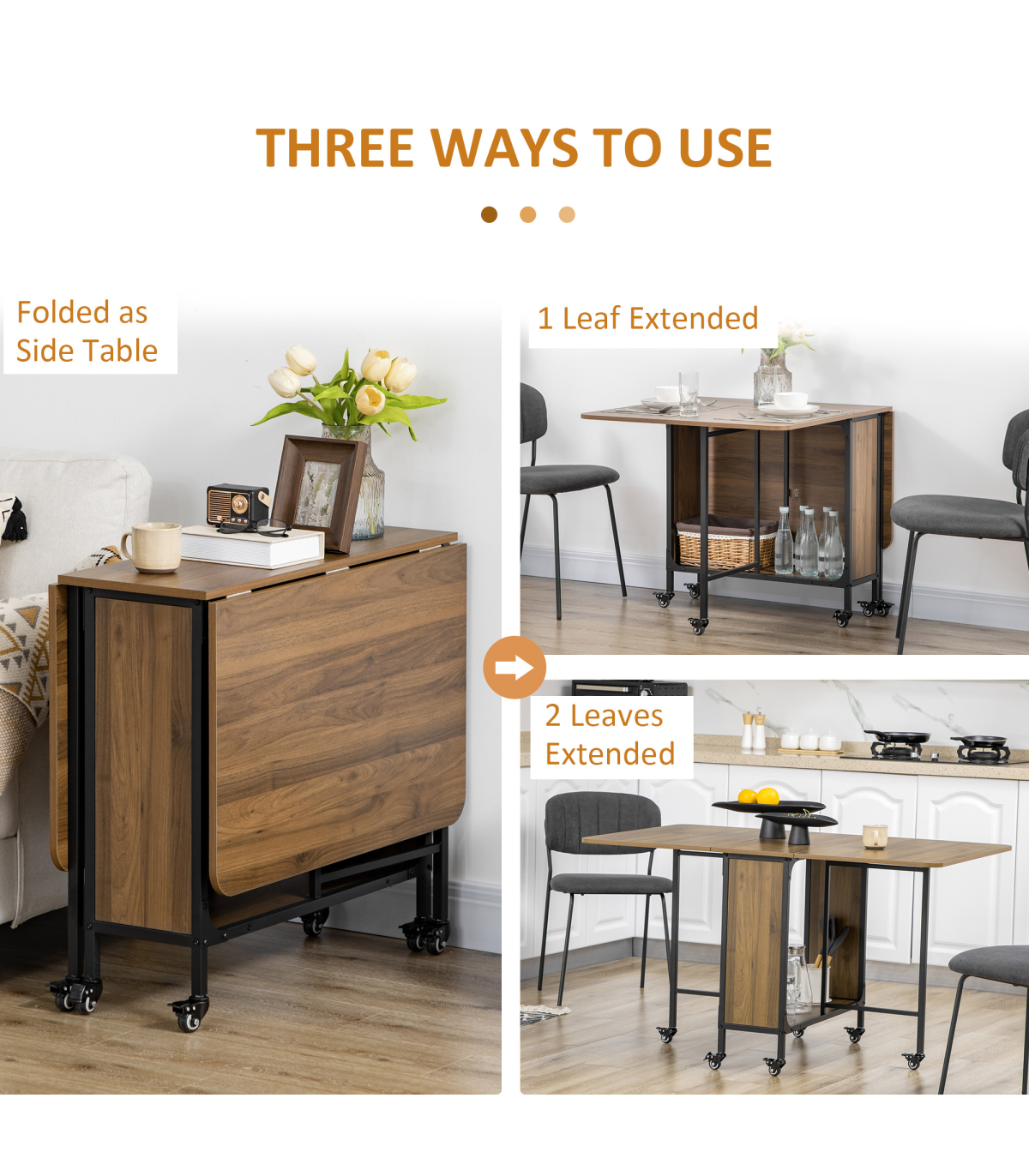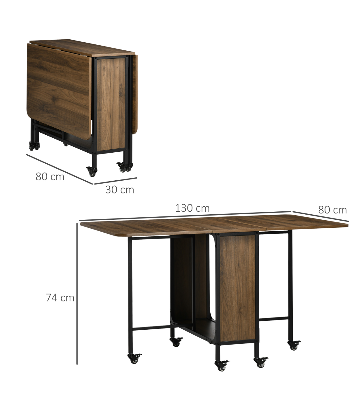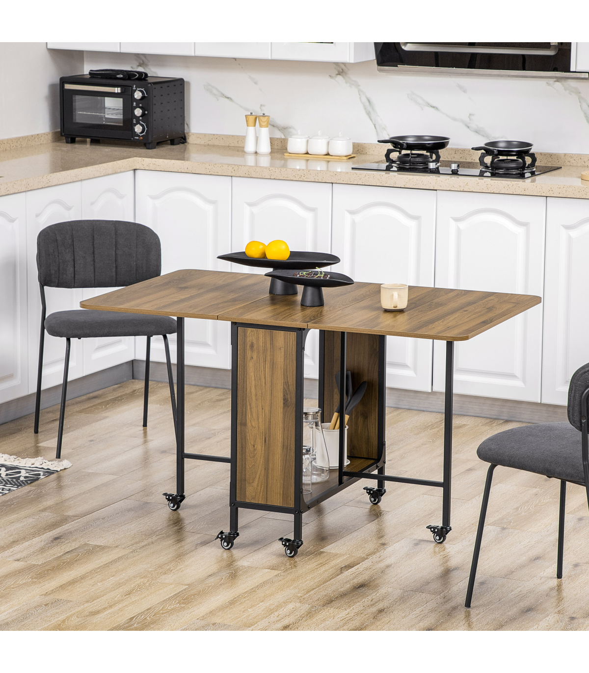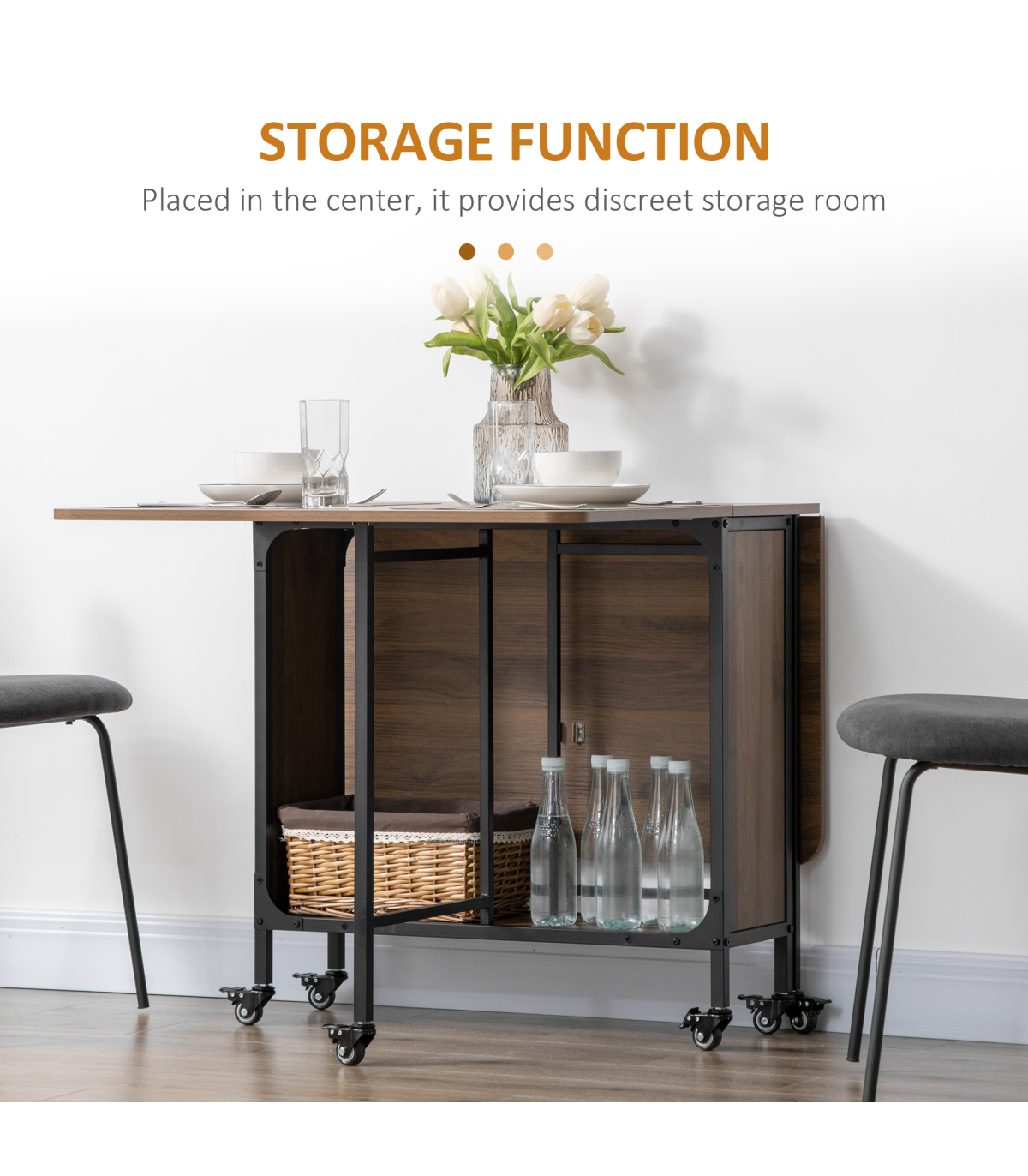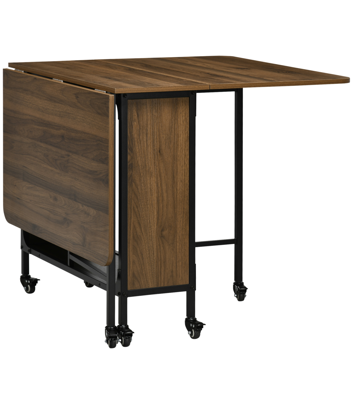 it creates extra surface room while dropping back down into a compact unit effortlessly. It comes with a middle shelf for discreet storage and six wheels to move easily. Completed with brakes.