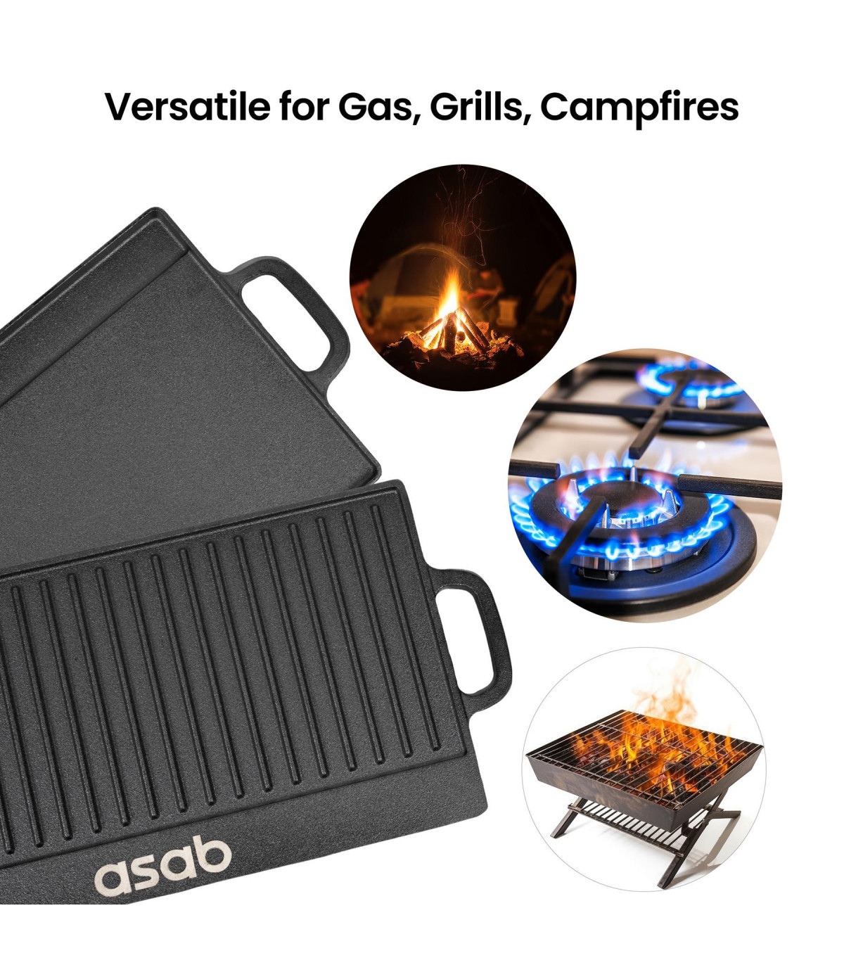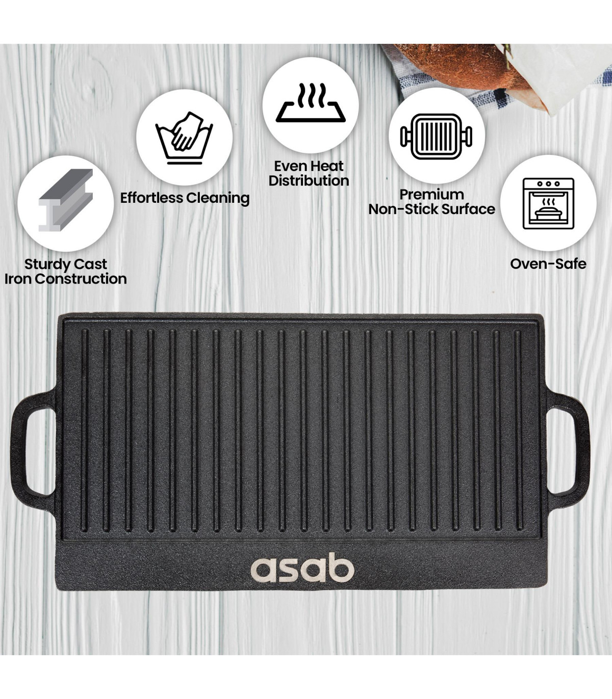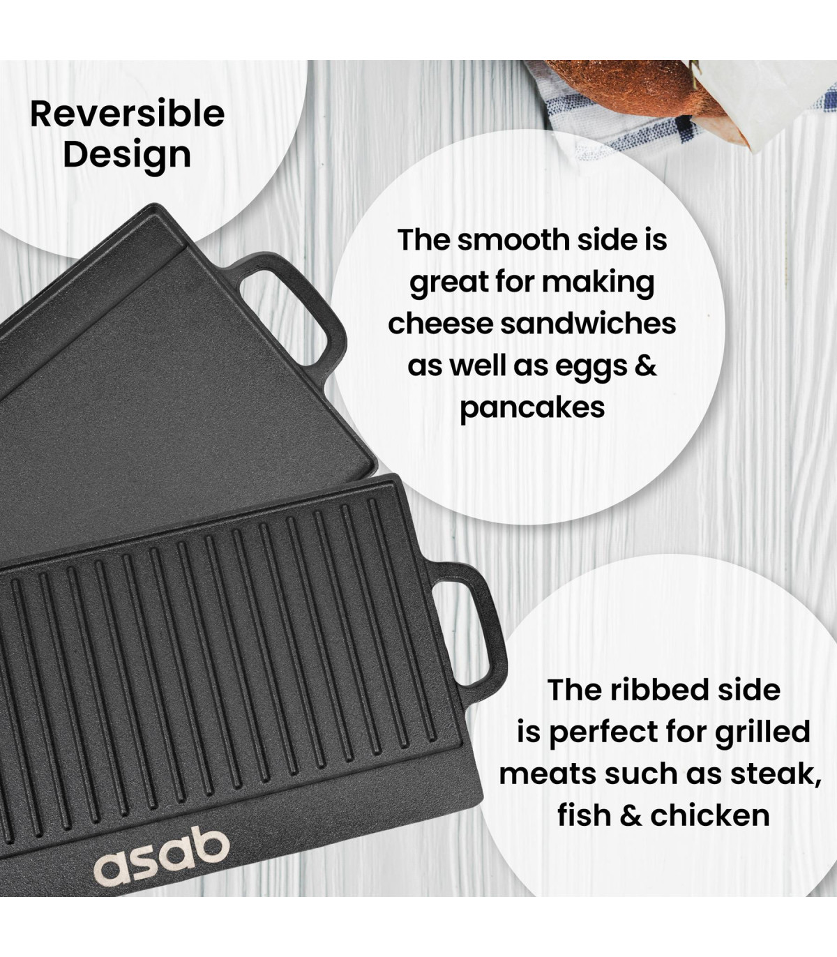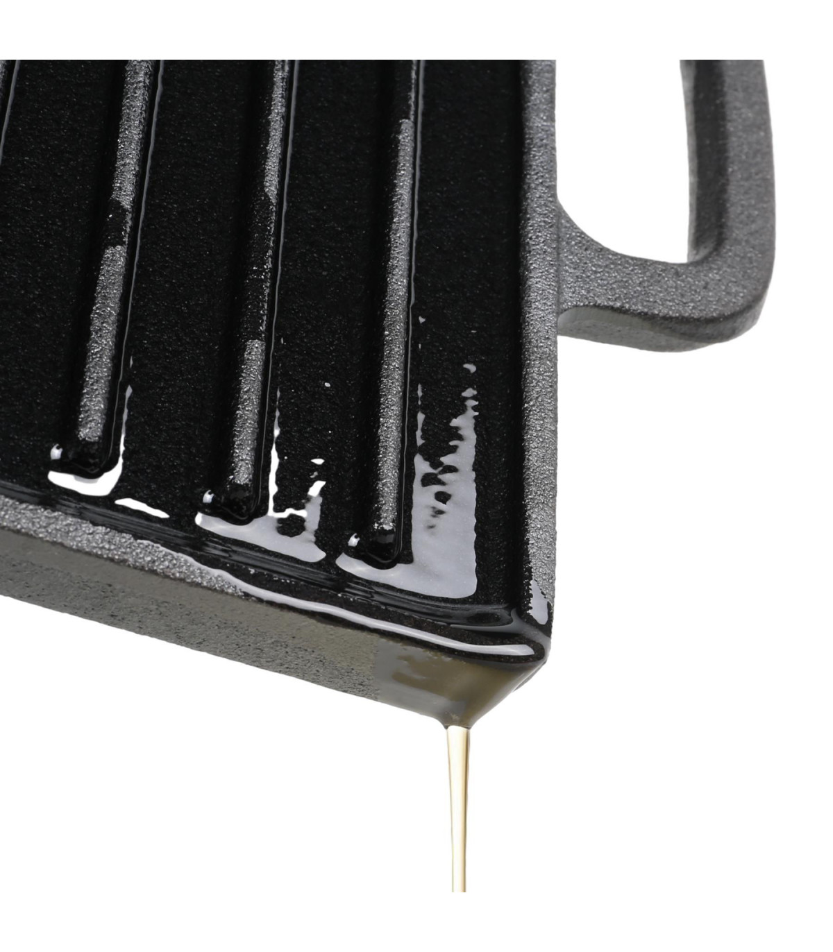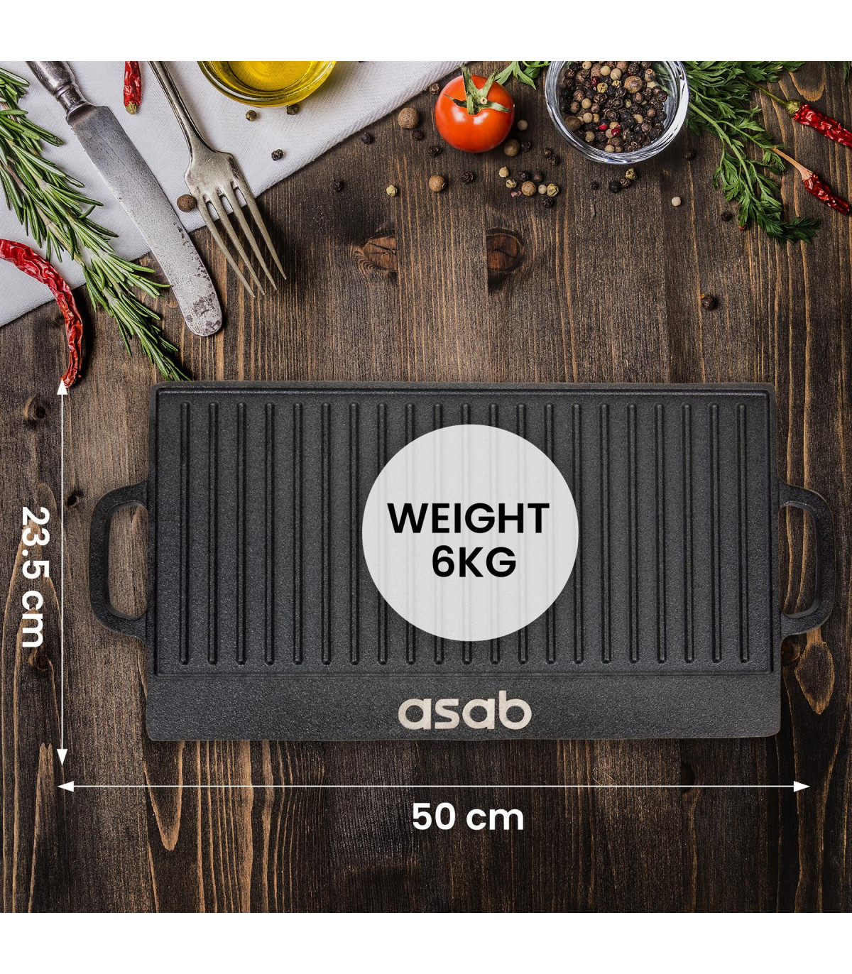 One side of the plate features a ridged design ideal for cooking meat and fish to give them a perfectly chargrill seared texture. You'll find the other side is flat, for use as a hotplate which can be used to cook foods such as tomato, eggs and mushrooms.The strong cast iron material, has been treated with a non-stick coating and comes pre-seasoned; letting you grill your food without worrying about it getting stuck to the plate. The plate uses channels and a drip tray to drain fats and oils away from your food. The end result is healthier and fat free food.Features 2 integrated handles for safe and easy lifting you'll find the design does nothing but benefit your food with its heat distribution. Features:Reversable Griddle Pan: One side of the plate features a ridged design ideal for cooking meat and fish to give them a perfectly chargrill seared texture. You'll find the other side is flat, for use as a hotplate which can be used to cook foods such as tomato, eggs and mushrooms.The strong cast iron material, has been treated with a non-stick coating and comes pre-seasoned; letting you grill your food without worrying about it getting stuck to the plateThe plate uses channels and a drip tray to drain fats and oils away from your food. The end result is healthier and fat free foodFeatures 2 integrated handles for safe and easy lifting you'll find the design does nothing but benefit your food with its heat distributionDimensions: Height: 2cm Width: 51cm Depth: 24cmWeight: 3.5kg Package Content: 1 x Non Stick Cast Iron Reversible Griddle Plate
