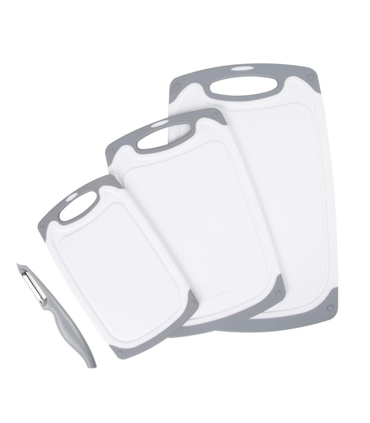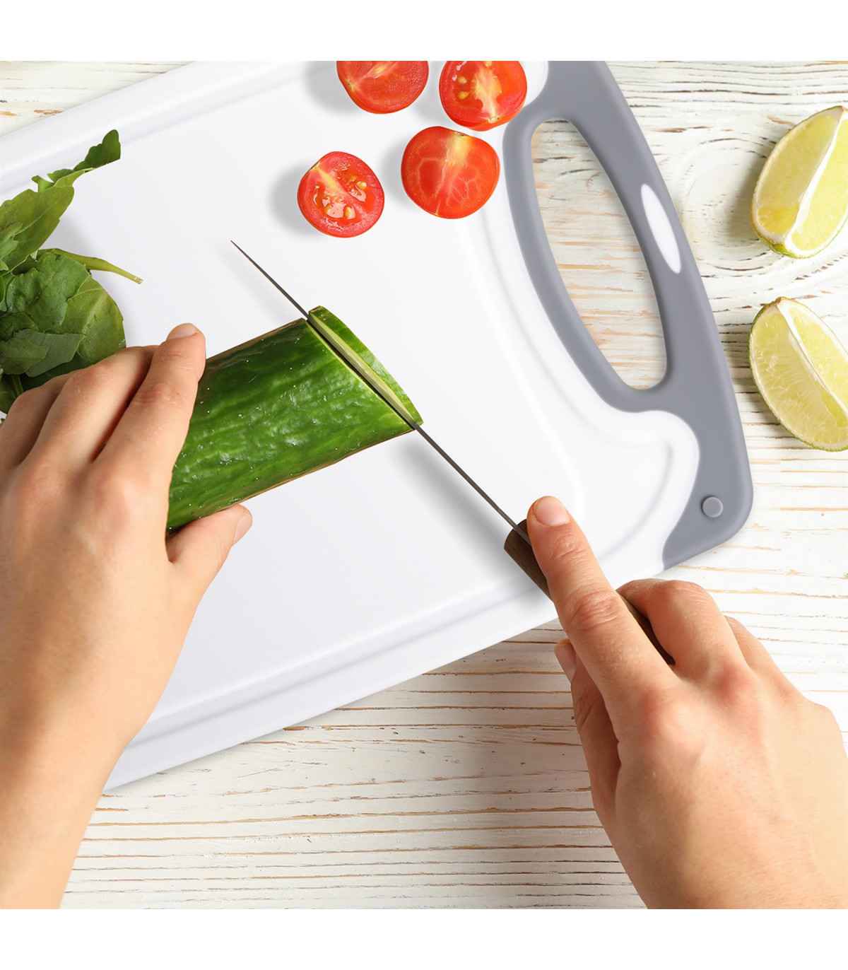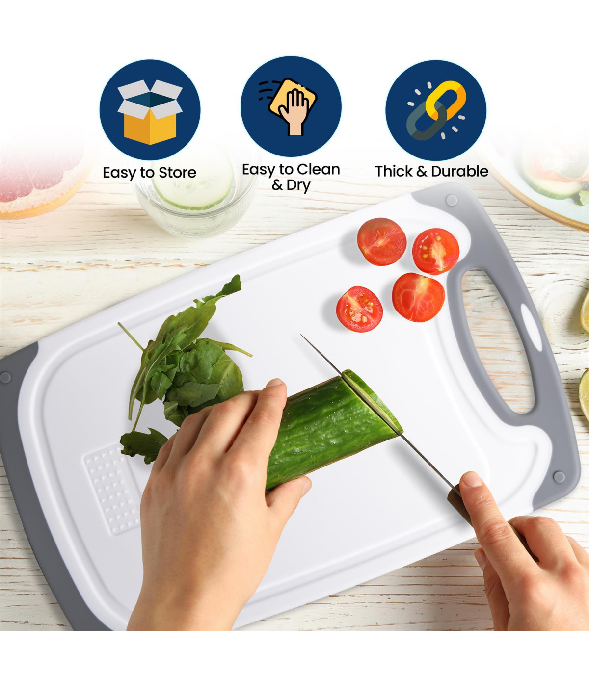EASY GRIP DESIGN - We've Taken the Best Elements of All Available Plastic Cutting Boards on the Market and Created a Product Designed to Save You Time and Make Your Experience in the Kitchen Fun. Easy Grip Handles, Label Icons, and Built-in Juice Groove Make Our Set of 3 Chopping Boards for Kitchen Use the Best in the BusinessFOOD-GRADE MATERIAL - Chopping Board Set Is Made of High-quality Plastic With High Durability and High-temperature Resistance, Food-grade Materials, Bpa-free, Safe and Non-toxic. The Cutting Board With a Thickness of 5mm Is Thicker and More Durable Than Similar Products on the MarketTHREE SIZES & PEELER INCLUDED - This Cutting Board Set Includes 3 Different Sizes for Cutting. You Can Grind Out the Garlic or Ginger, Etc. And These Chopping Boards Can Be Used on Both Two Sides. Free, Colour Coded Vegetable & Fruit Peeler Is IncludedPERFECT KITCHEN ACCESSORY CHOICE - Kitchen Cutting Boards Are Strong Enough to Withstand Heavy Chopping, Slicing, Dicing and Sharp Knives. Very Suitable for Cutting Vegetables, Meat, Fruits, Etc.DIMENSIONS - Large Cutting Board - Length: 40cm, Width: 24.2cm, Height: 0.8cm; Medium Cutting Board - Length: 32cm, Width: 19.8cm, Height: 0.8cm; Small Cutting Board - Length: 25cm, Width: 14.7cm, Height: 0.8cmMeasurements:Large Cutting Board - Length: 40cm, Width: 24.2cm, Height: 0.8cmMedium Cutting Board - Length: 32cm, Width: 19.8cm, Height: 0.8cmSmall Cutting Board - Length: 25cm, Width: 14.7cm, Height: 0.8cm