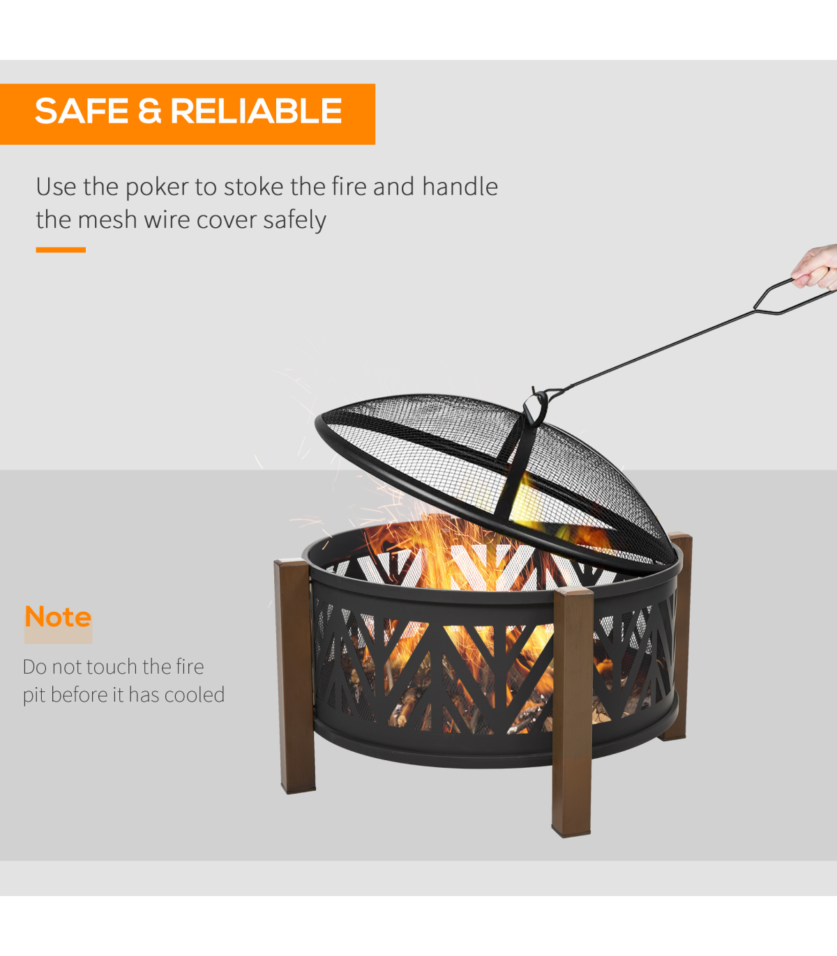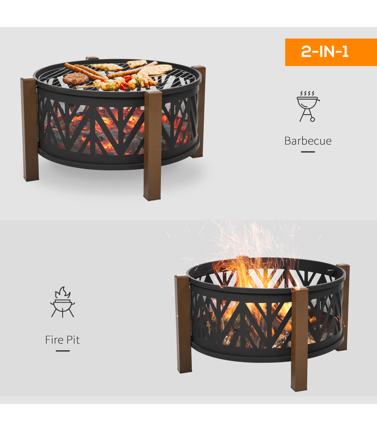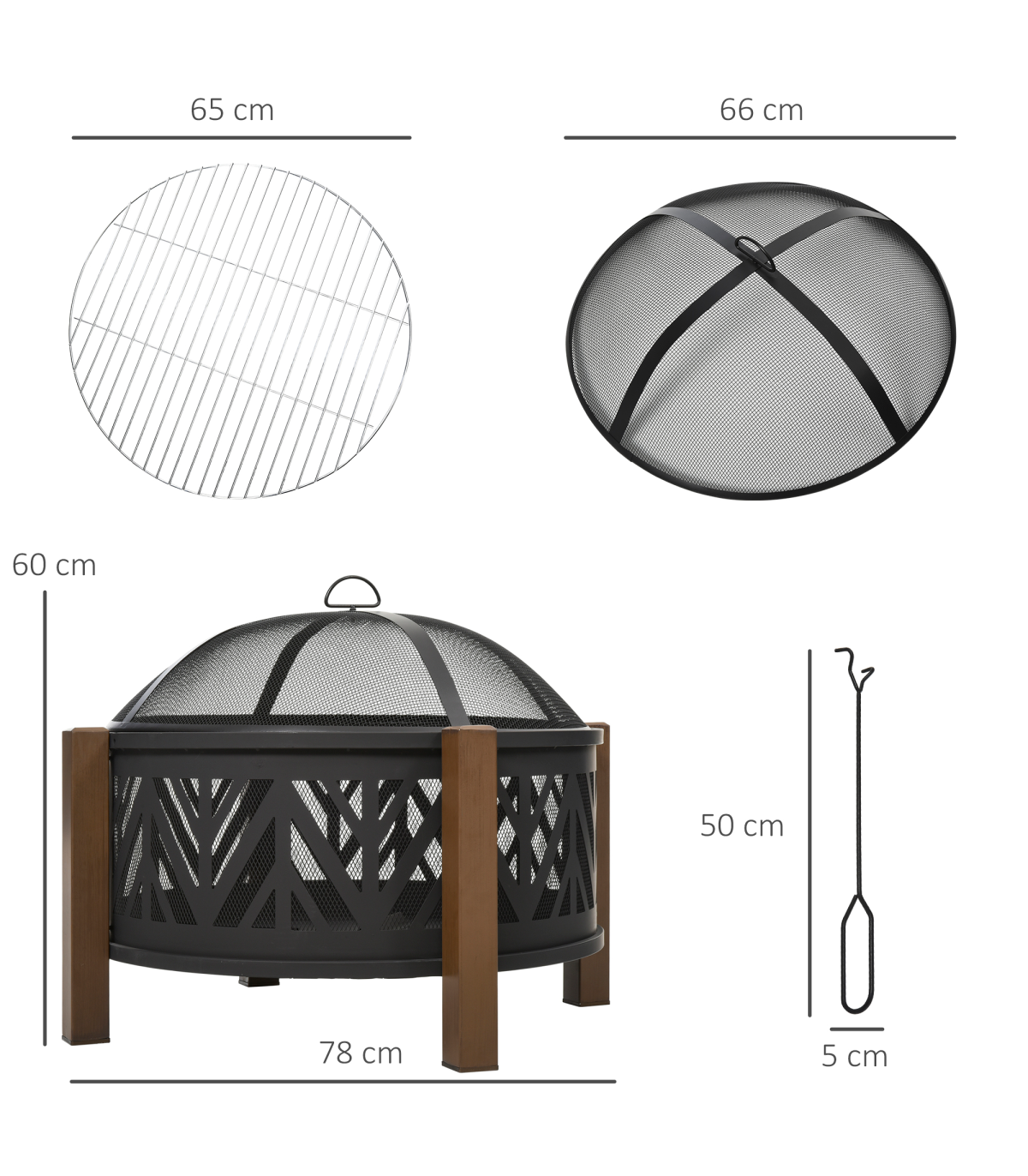 - 2-in-1 Outdoor Fire Pit Bowl with BBQ Grill Grate - 30" Spark Screen Cover Description: - Four long legs attached to the side to keep the pit balanced - Top grate for holding food safely and protecting you from direct flames - 500°F temperature-resistant structure for better heating and quicker cooking - Mesh lid included, creating a smoked effect on food when left on - Two handles for safe carrying - Poker included for safety - Assembly required