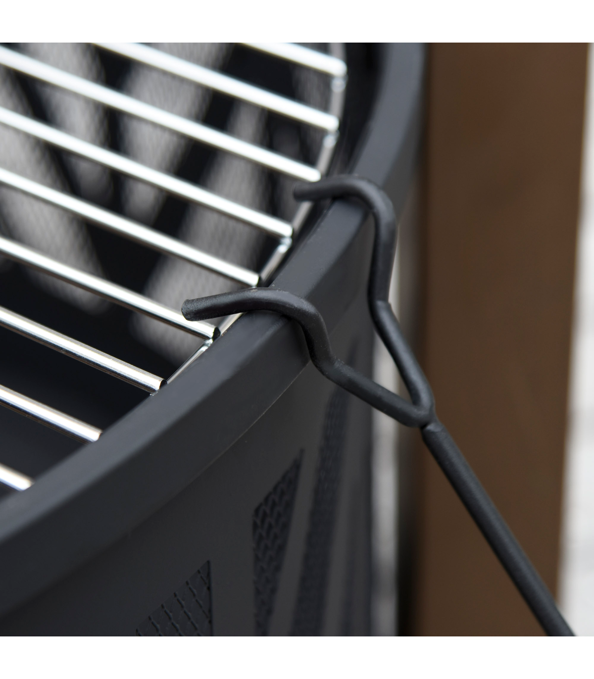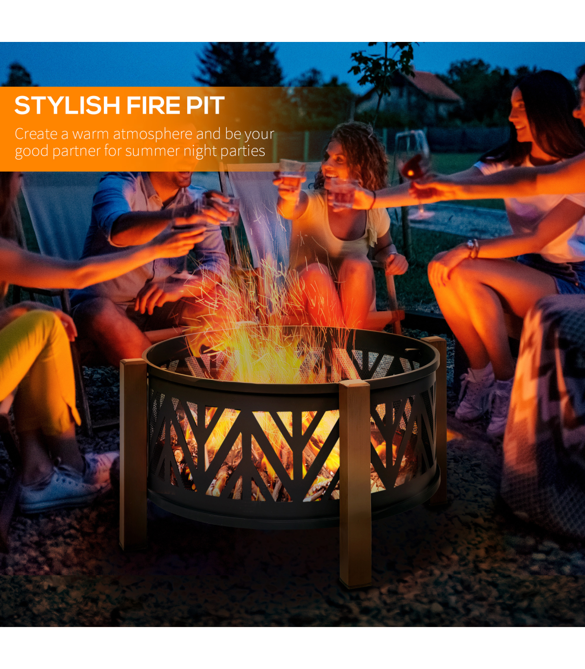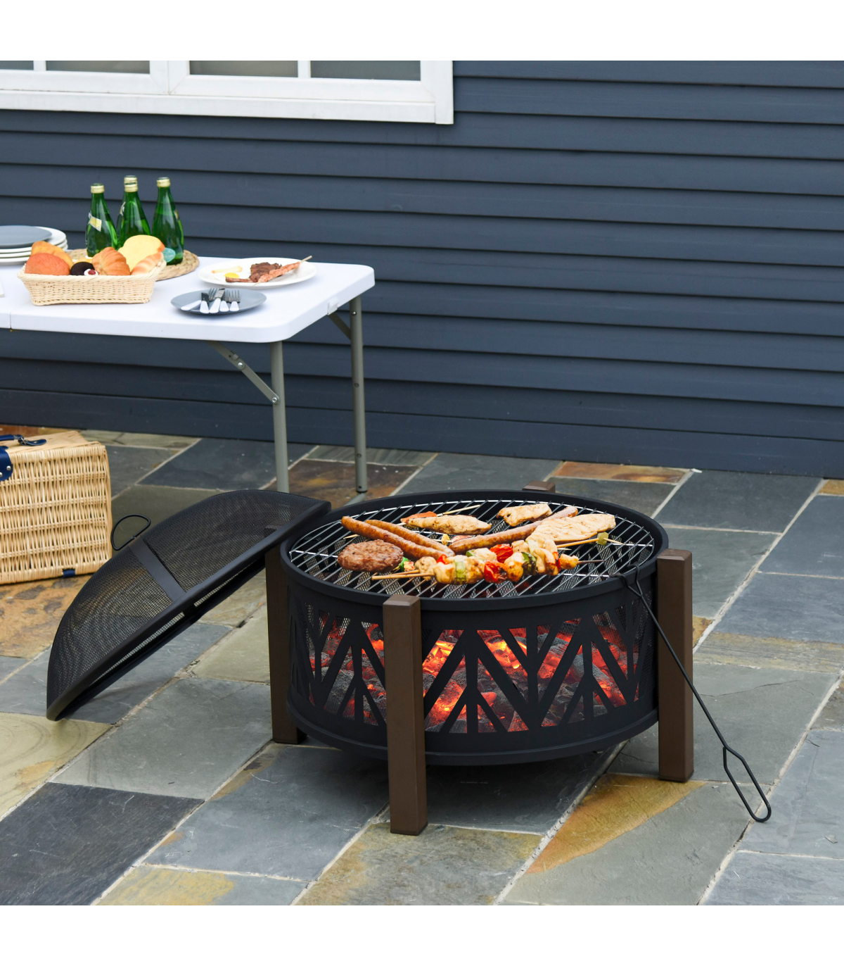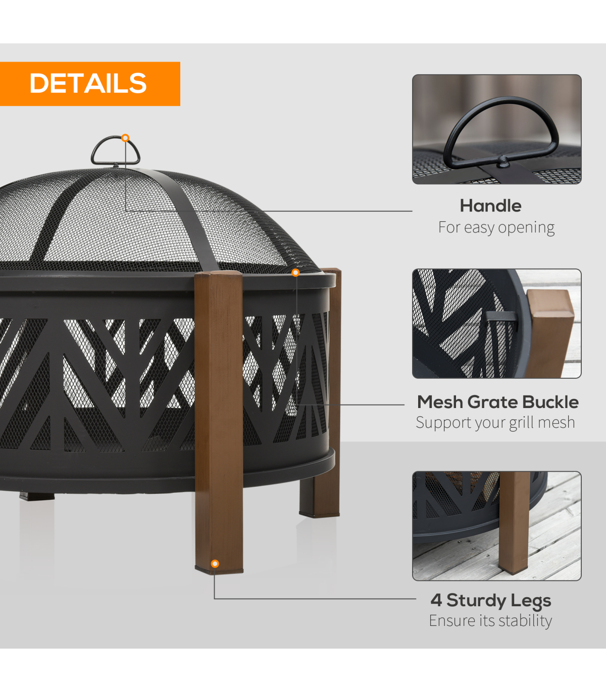 - 2-in-1 Outdoor Fire Pit Bowl with BBQ Grill Grate - 30" Spark Screen Cover Description: - Four long legs attached to the side to keep the pit balanced - Top grate for holding food safely and protecting you from direct flames - 500°F temperature-resistant structure for better heating and quicker cooking - Mesh lid included, creating a smoked effect on food when left on - Two handles for safe carrying - Poker included for safety - Assembly required