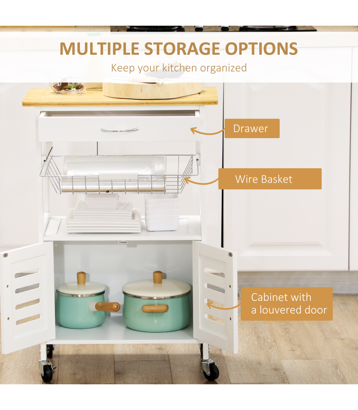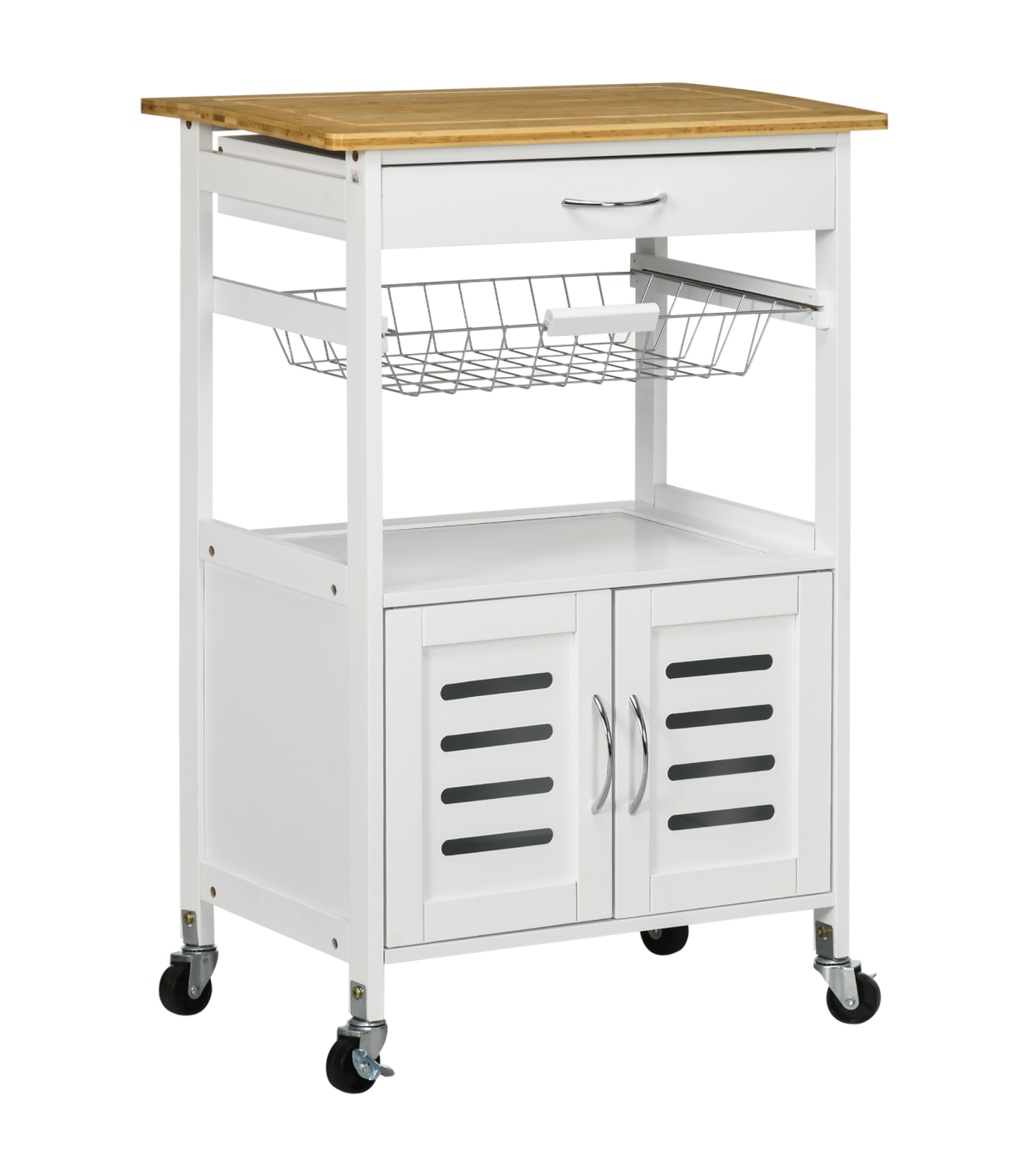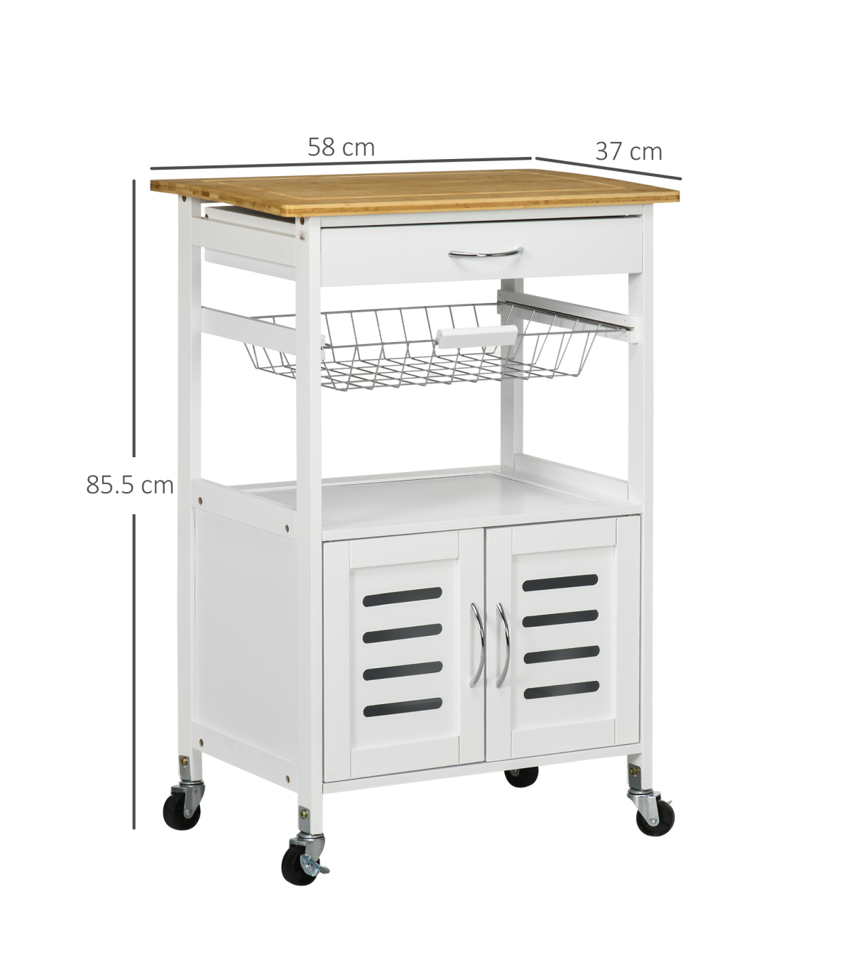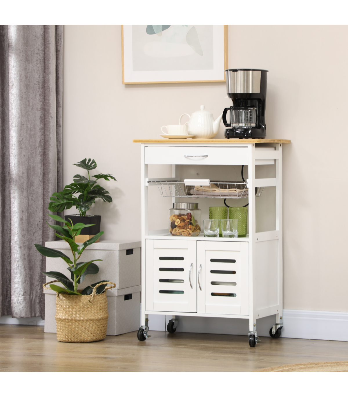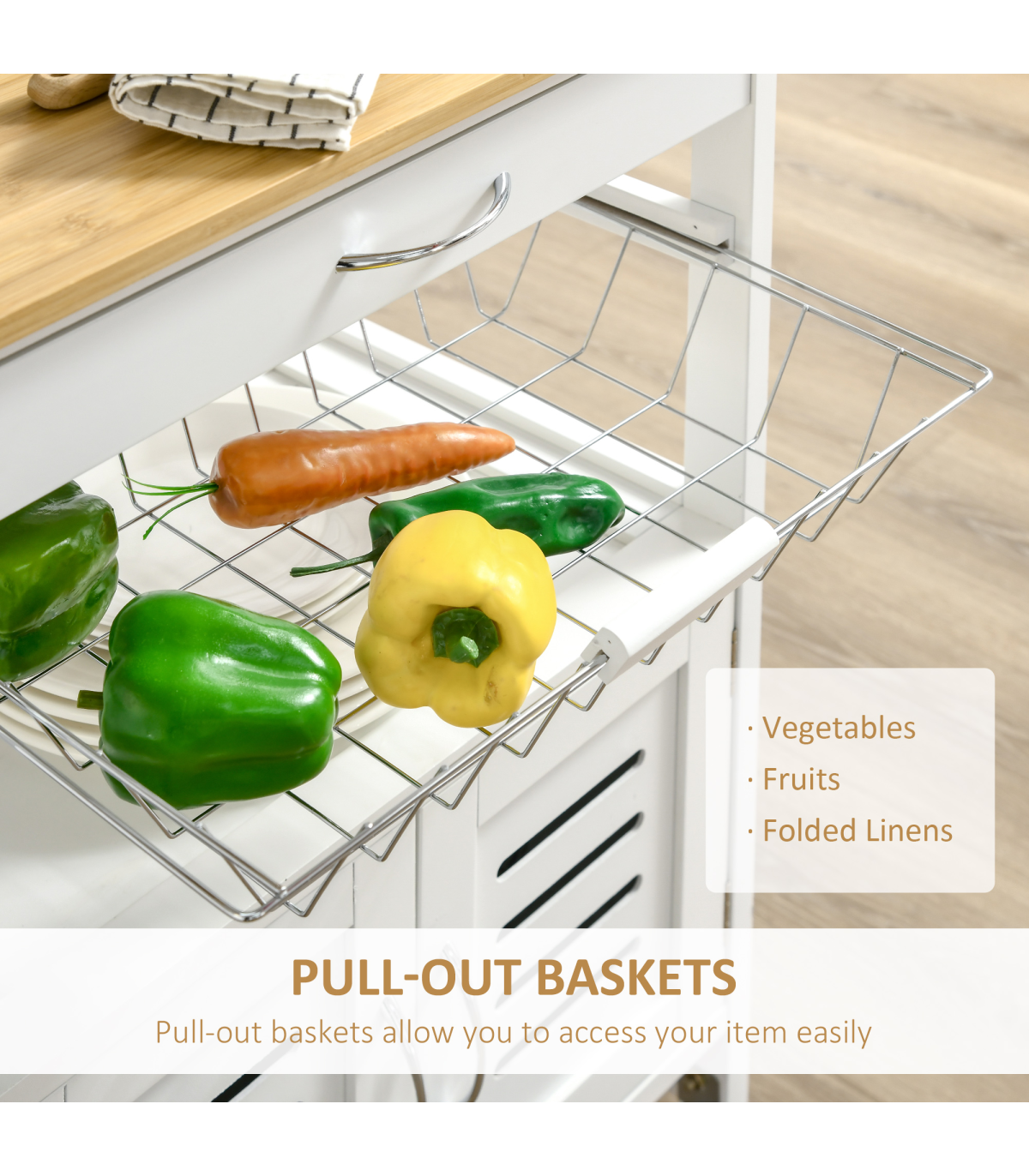 A handy drawer, a pull-out basket and a cabinet provide ample storage for your kitchen and dining essentials