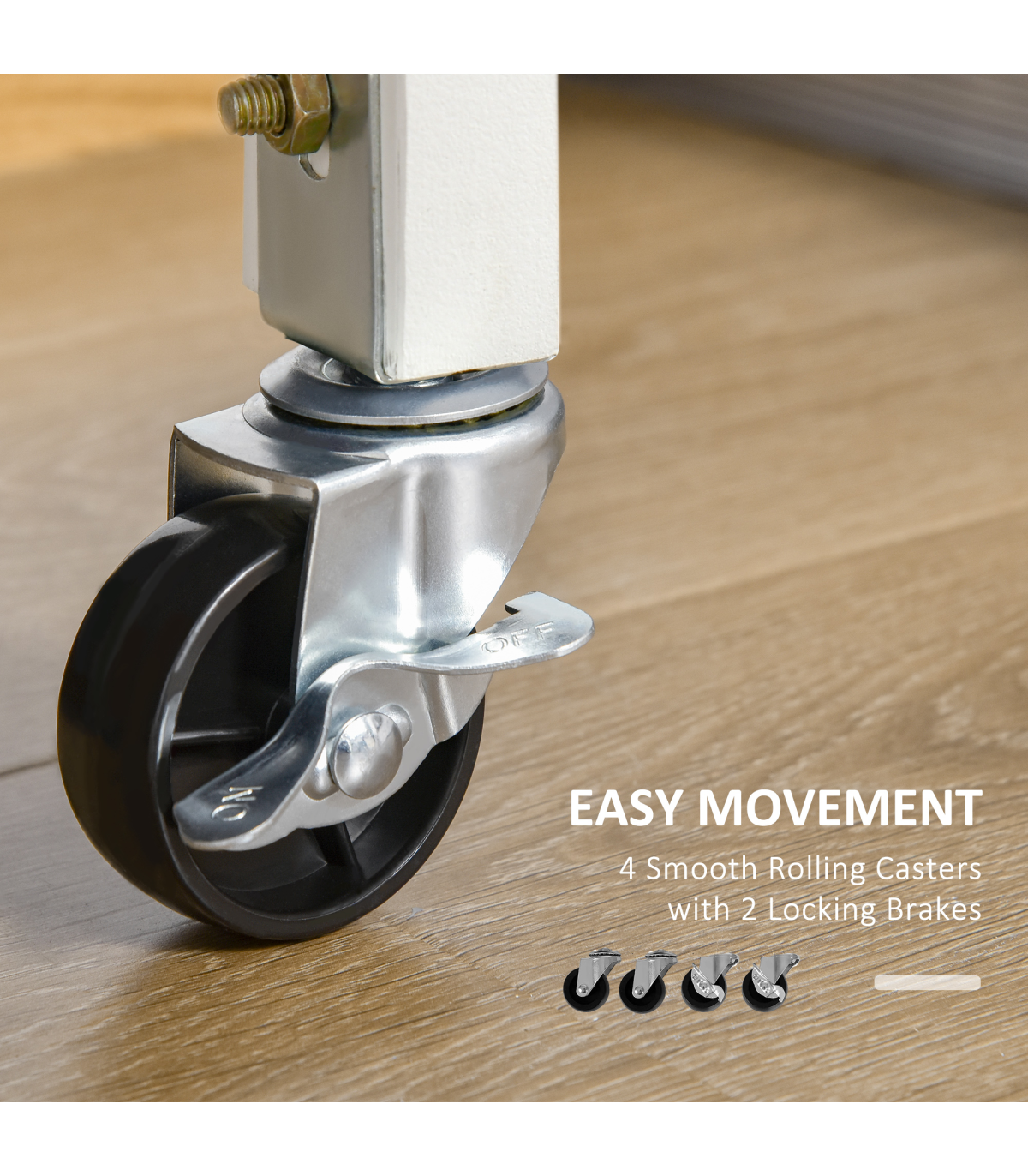 4 smooth rolling casters with 2 locking brakes provide mobility and stability