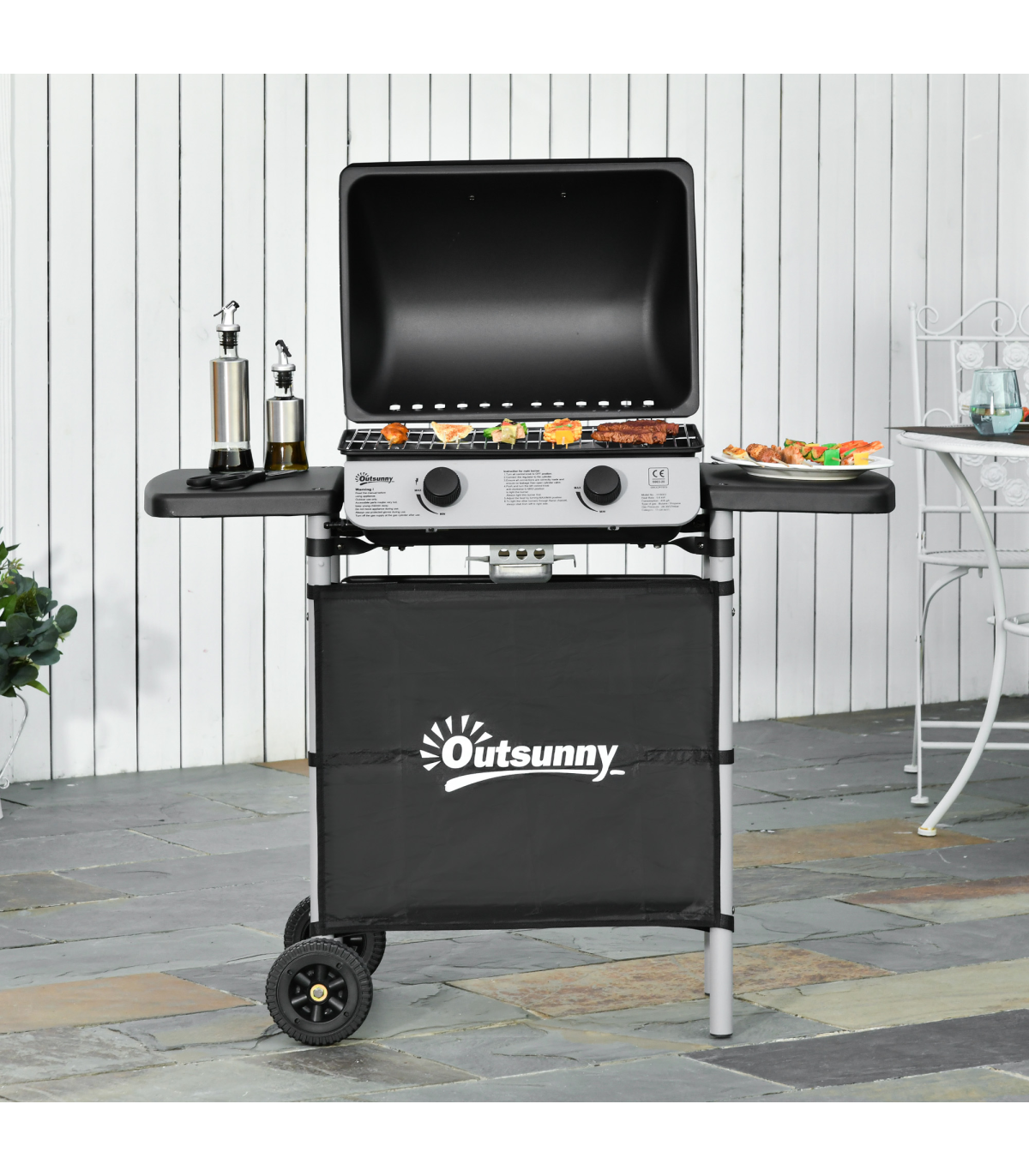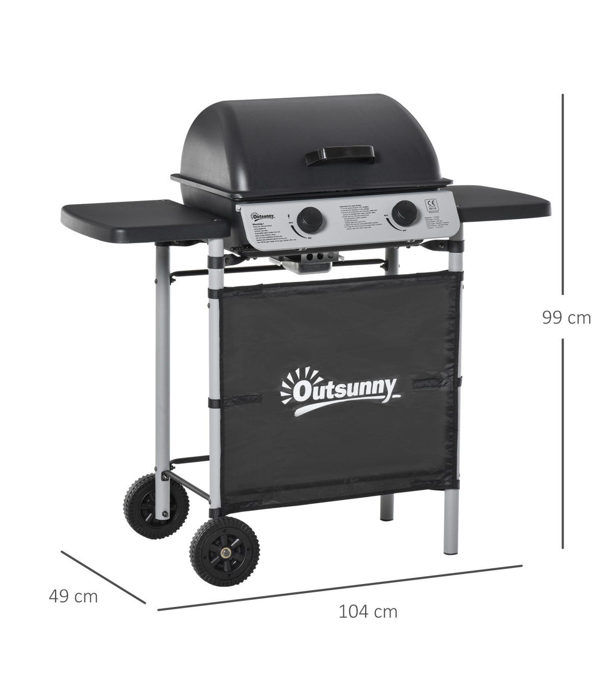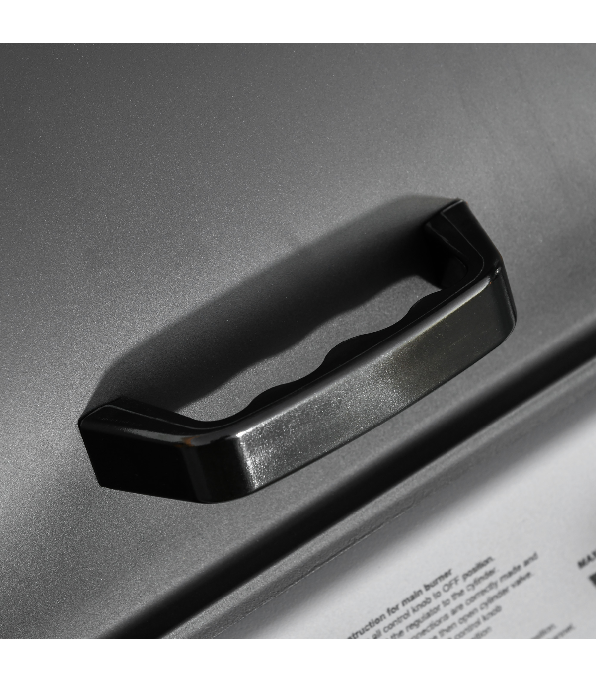 Equipped with 2 burners which can be separately used Steel structure with black high-temperature powder-coating for heat resistance ABS knobs facilitate temperature adjustment Vents on the lid for good ventilation Two shelves on both sides for more operating space The anti-scald handle on the lid for easy control of the lid while protecting you from being burnt Two wheels for easily moving it to another place Food-grade materials are used for the grilling net Assembly required