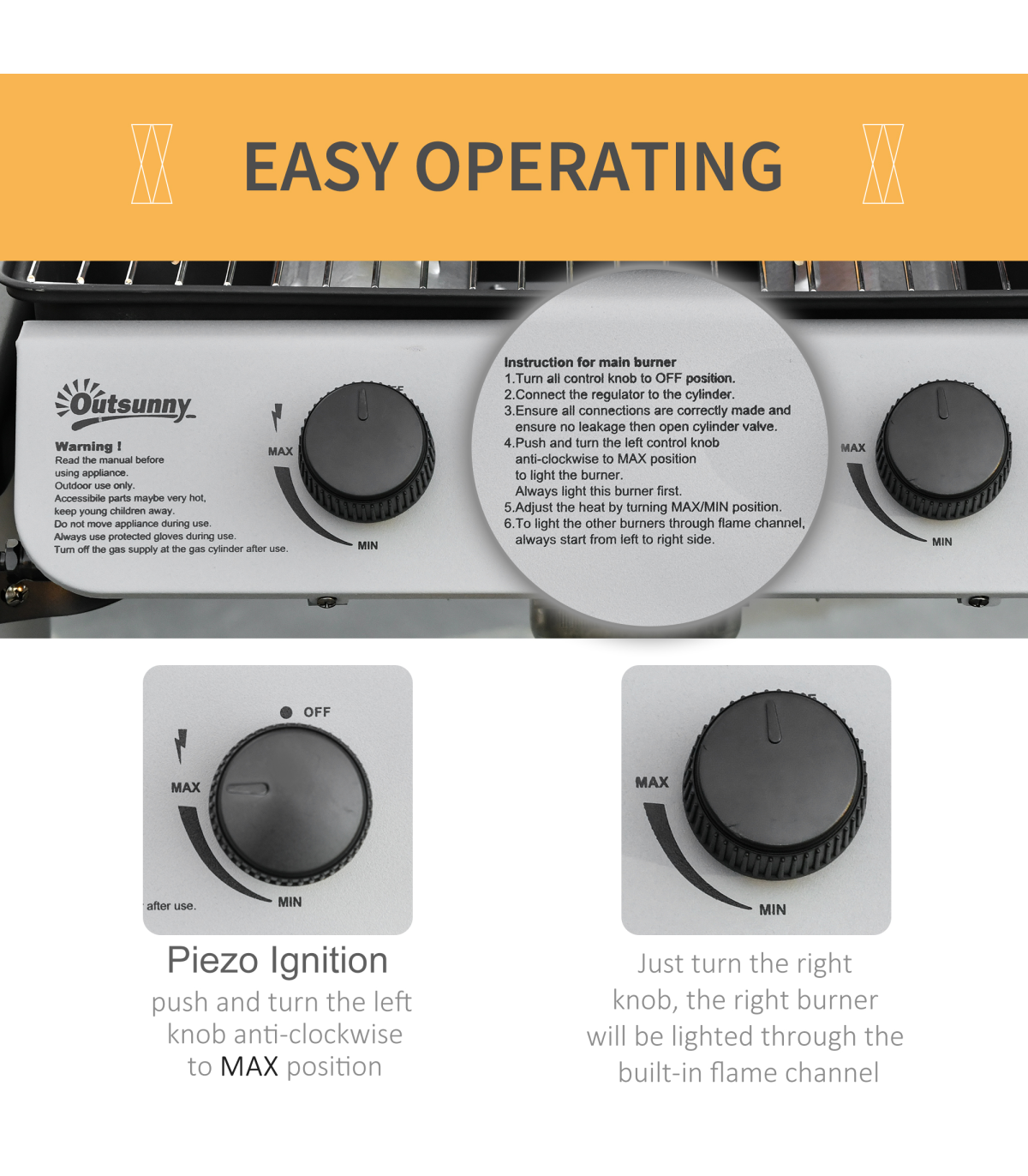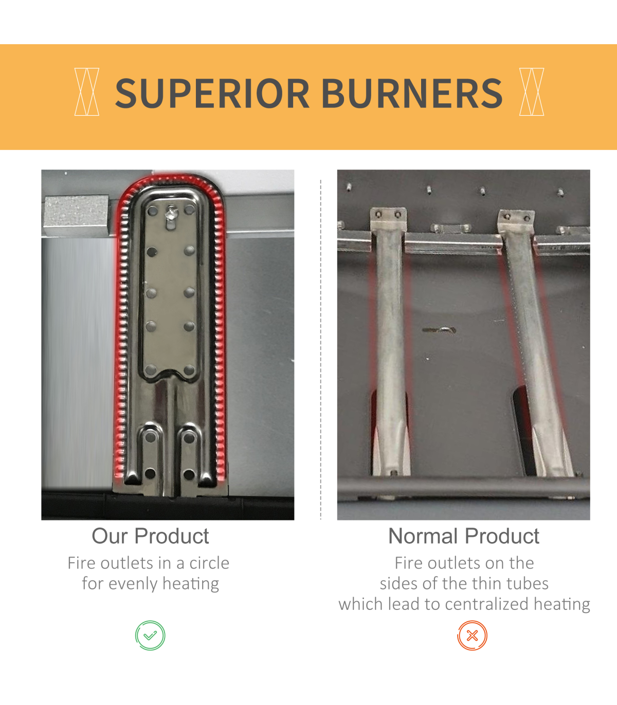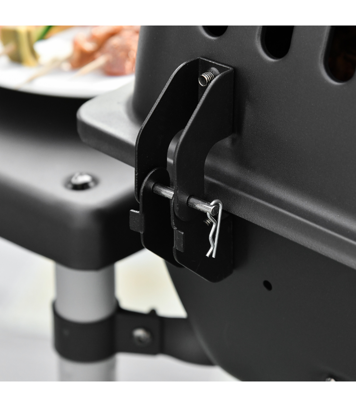 Equipped with 2 burners which can be separately used Steel structure with black high-temperature powder-coating for heat resistance ABS knobs facilitate temperature adjustment Vents on the lid for good ventilation Two shelves on both sides for more operating space The anti-scald handle on the lid for easy control of the lid while protecting you from being burnt Two wheels for easily moving it to another place Food-grade materials are used for the grilling net Assembly required